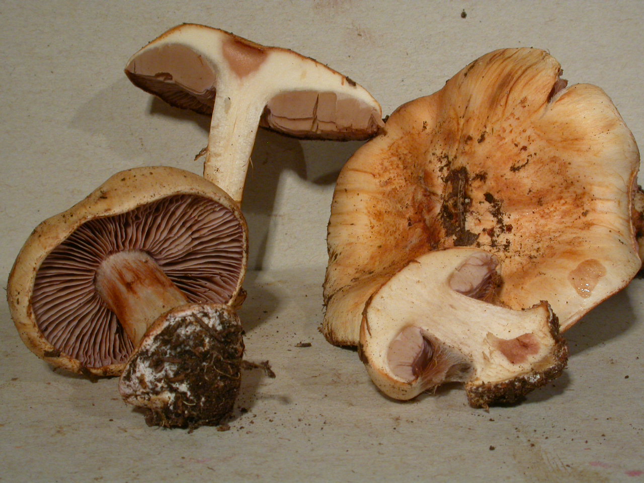 Un Cortinaire à chapeau dans les jaunes, brun jaune, lames violettes, réaction rouge à KOH sur cuticule. Le pied est blanchâtre, mais des teintes lilacines peuvent envahir le pied, surtout au sommet.