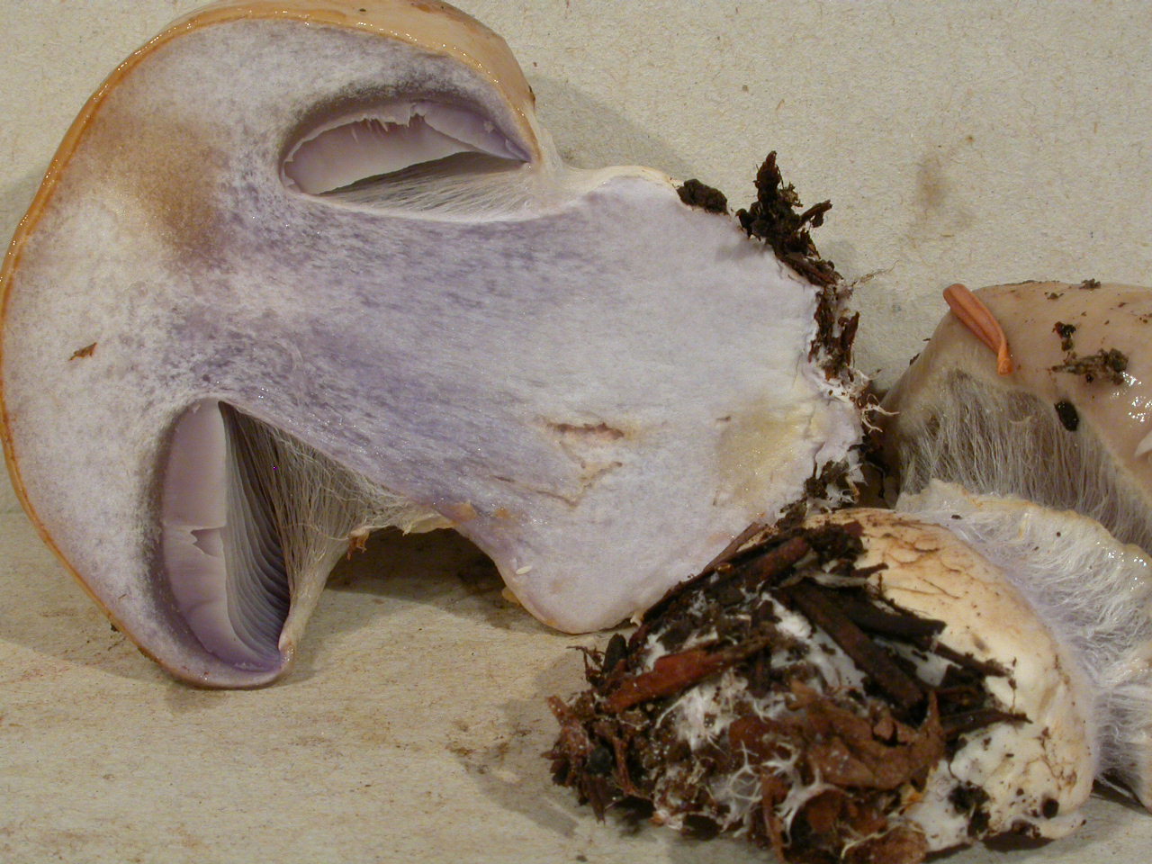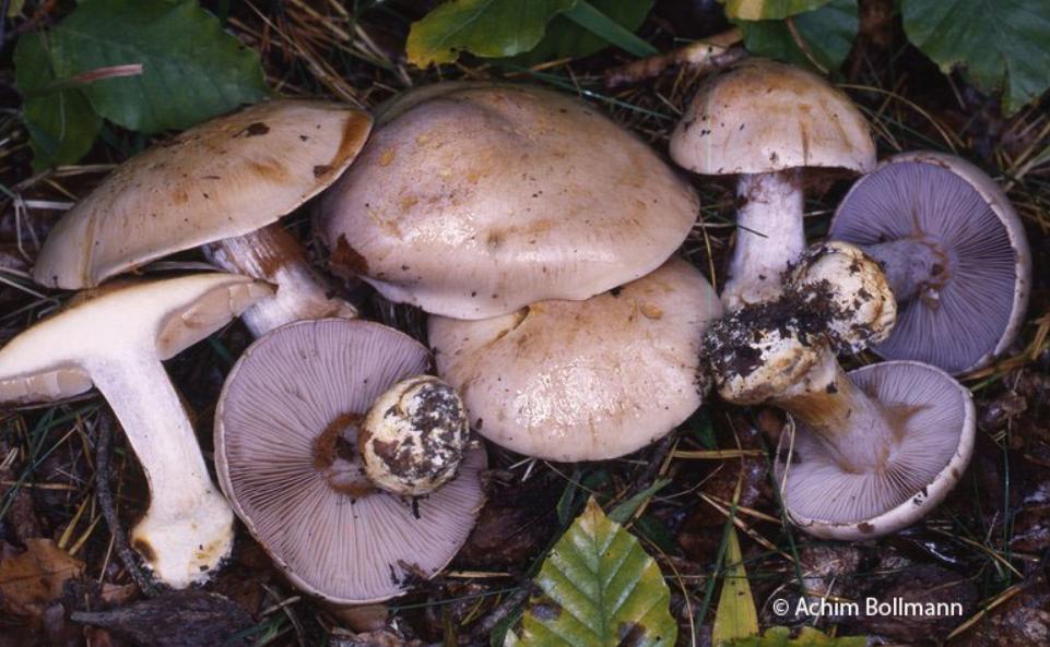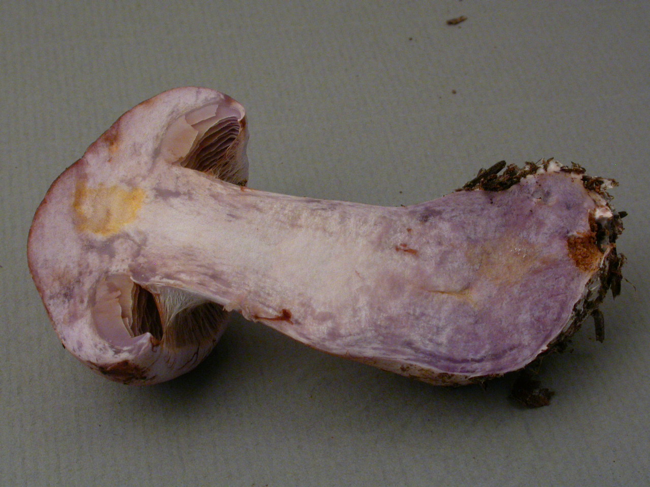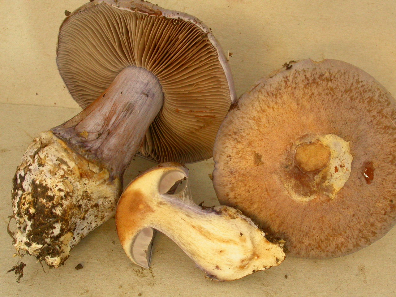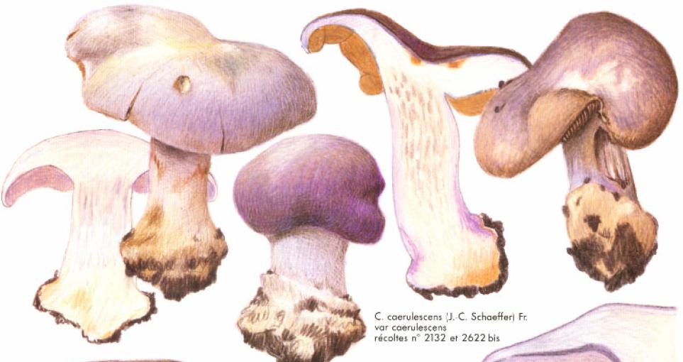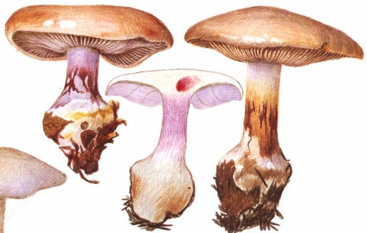 | Stipe | blanchâtre, ochracé, lilacin au sommet, bulbe brusque cerclé d'un voile bleu lilacin |