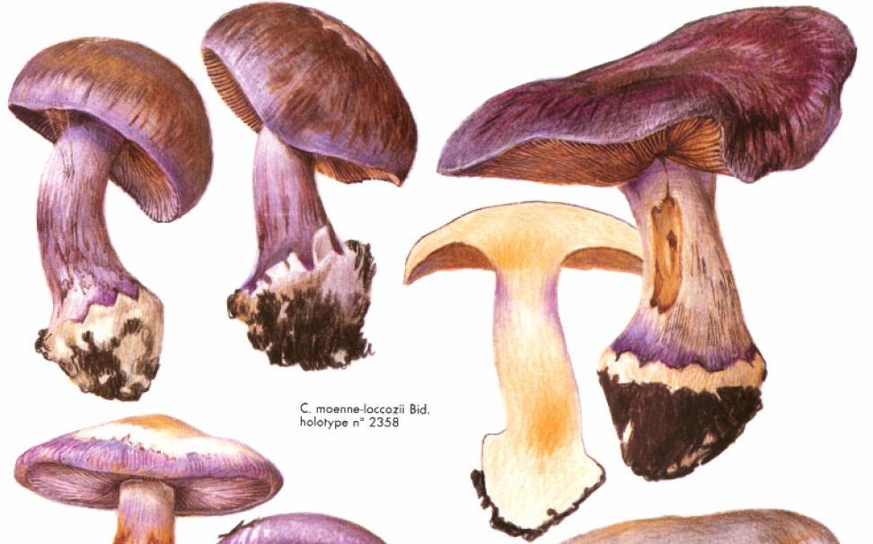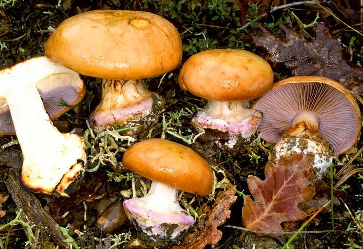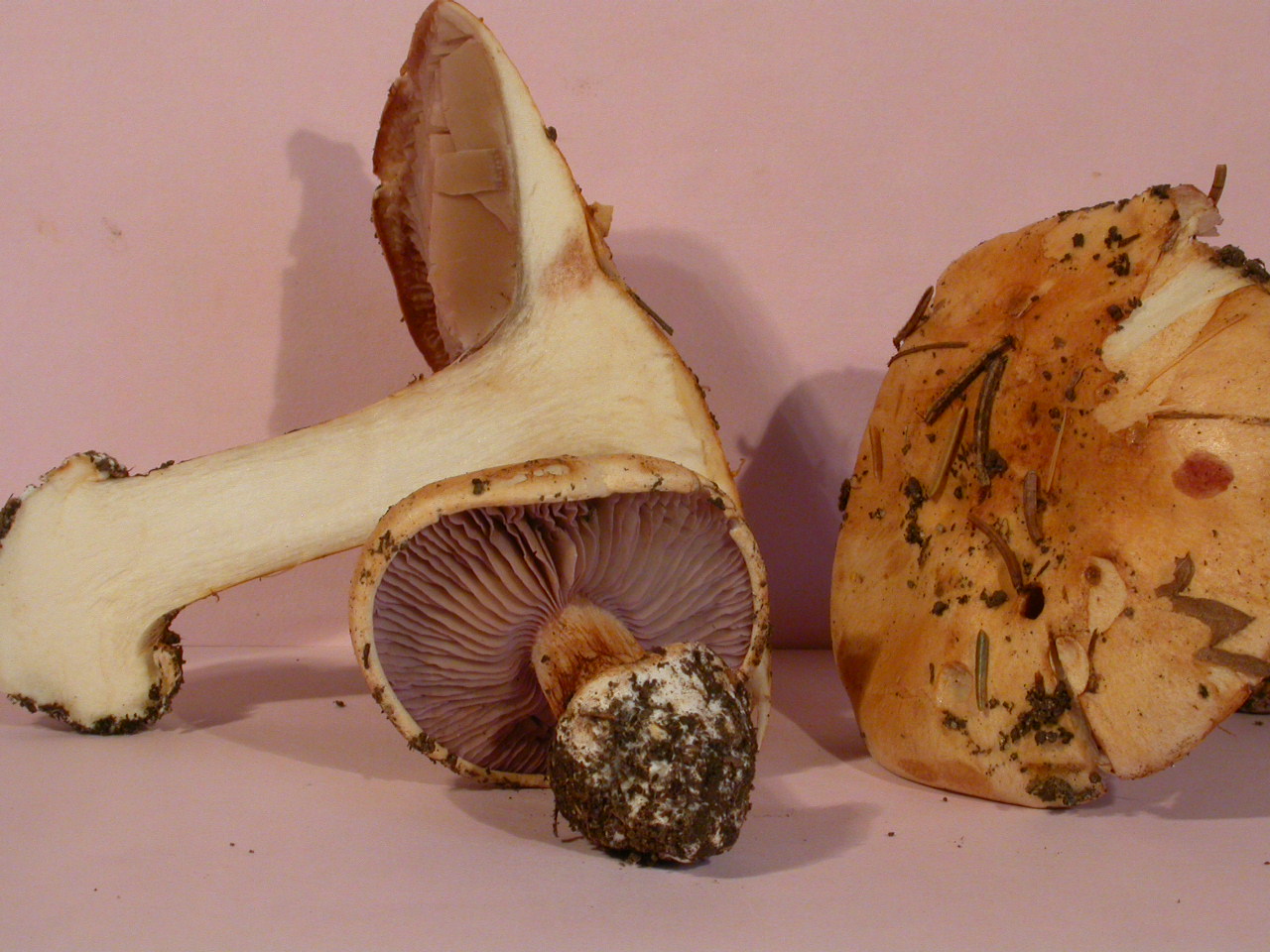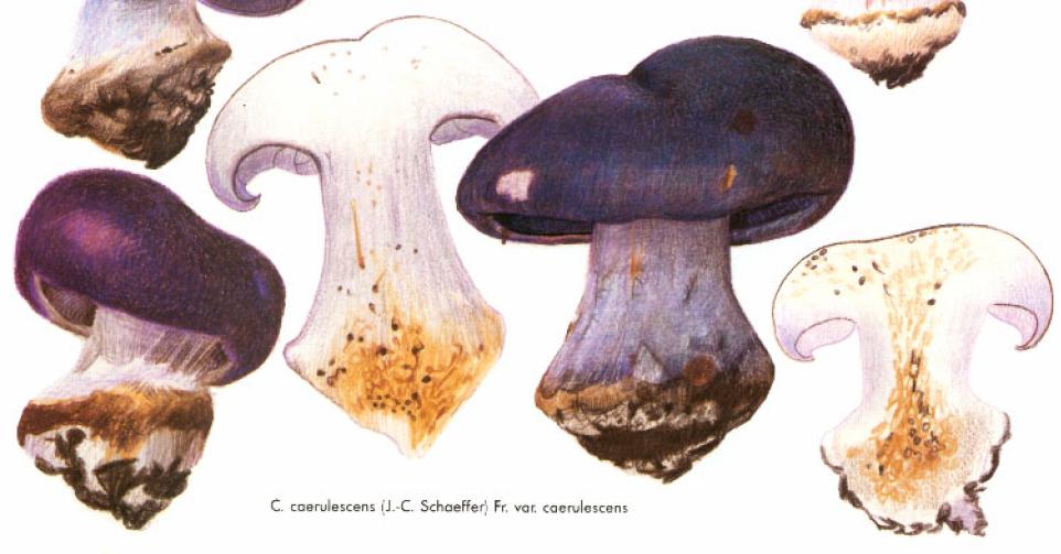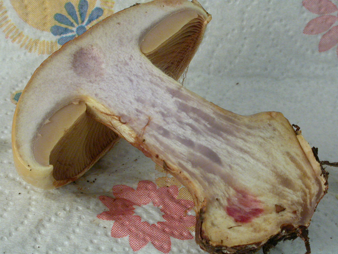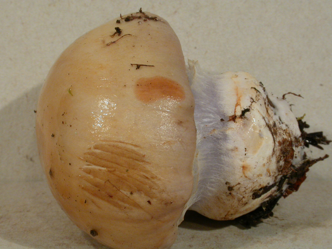 | Stipe | blanchâtre, ochracé, lilacin au sommet, bulbe brusque cerclé d'un voile bleu lilacin |