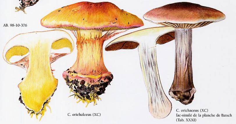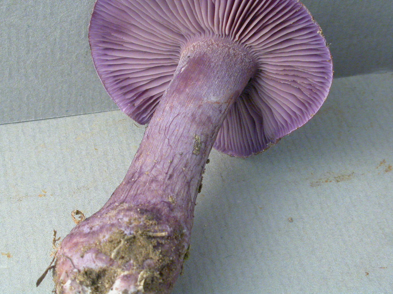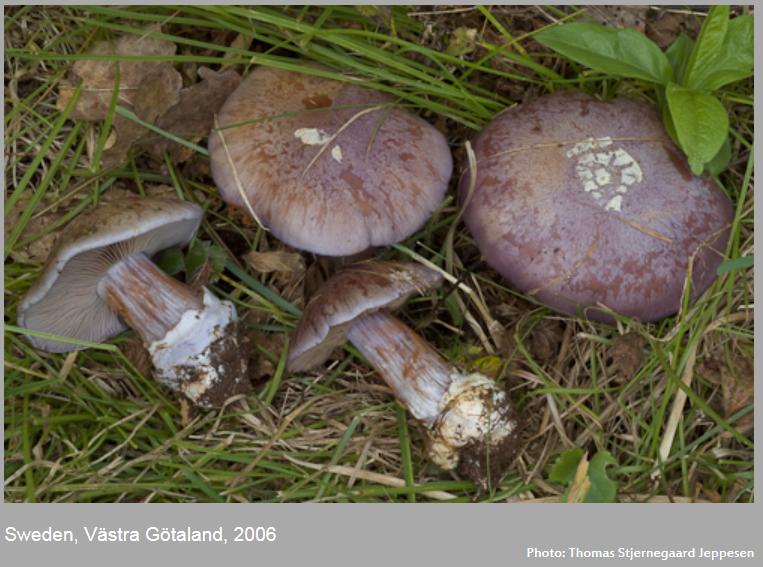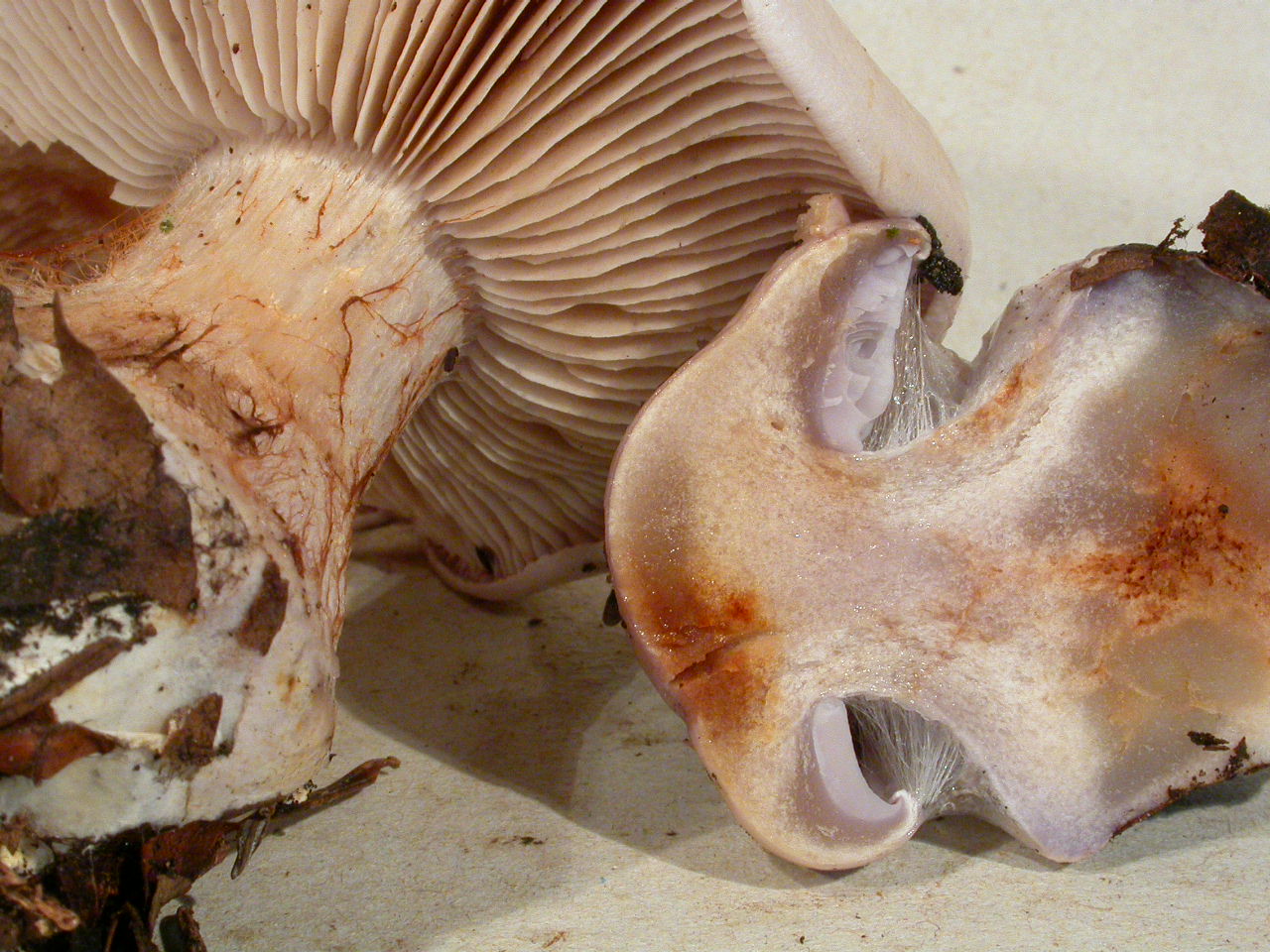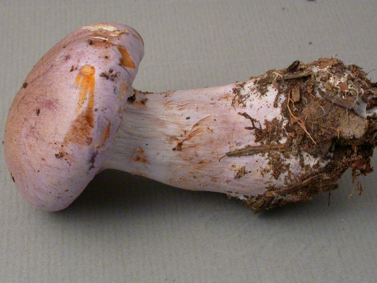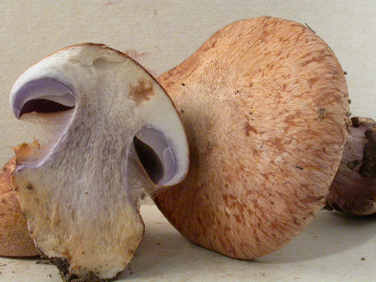 | Stipe | blanchâtre, ochracé, lilacin au sommet, bulbe brusque cerclé d'un voile bleu lilacin |