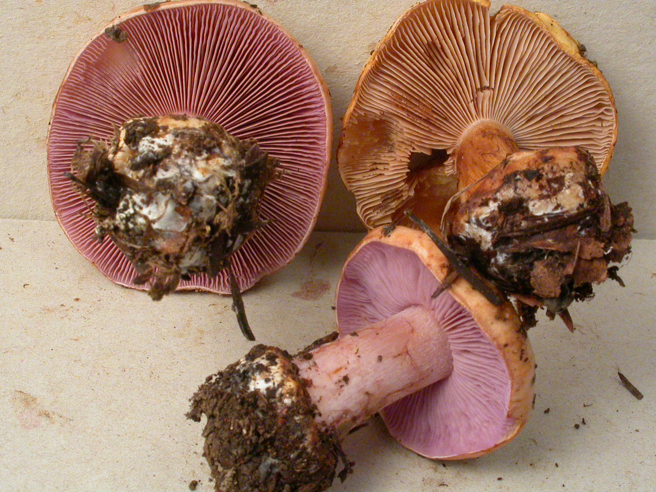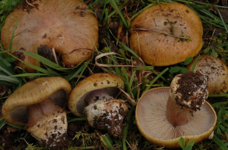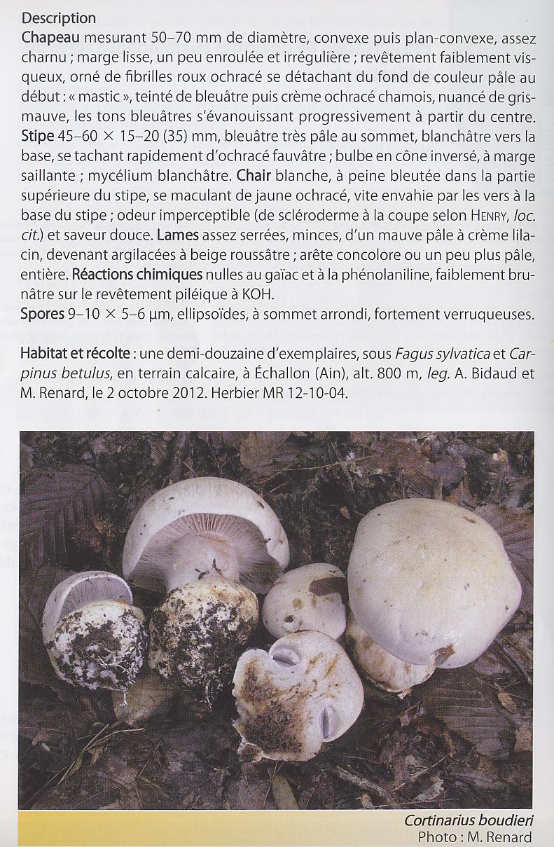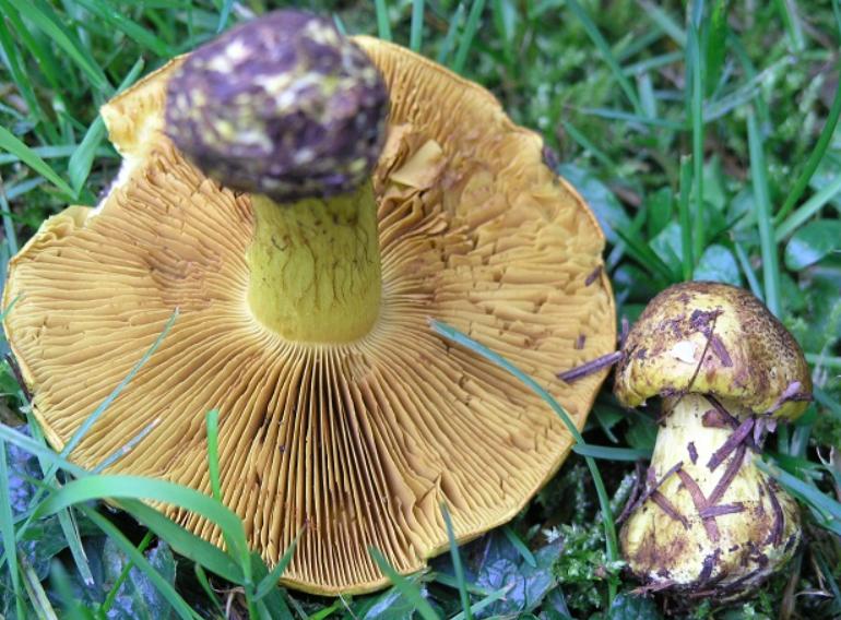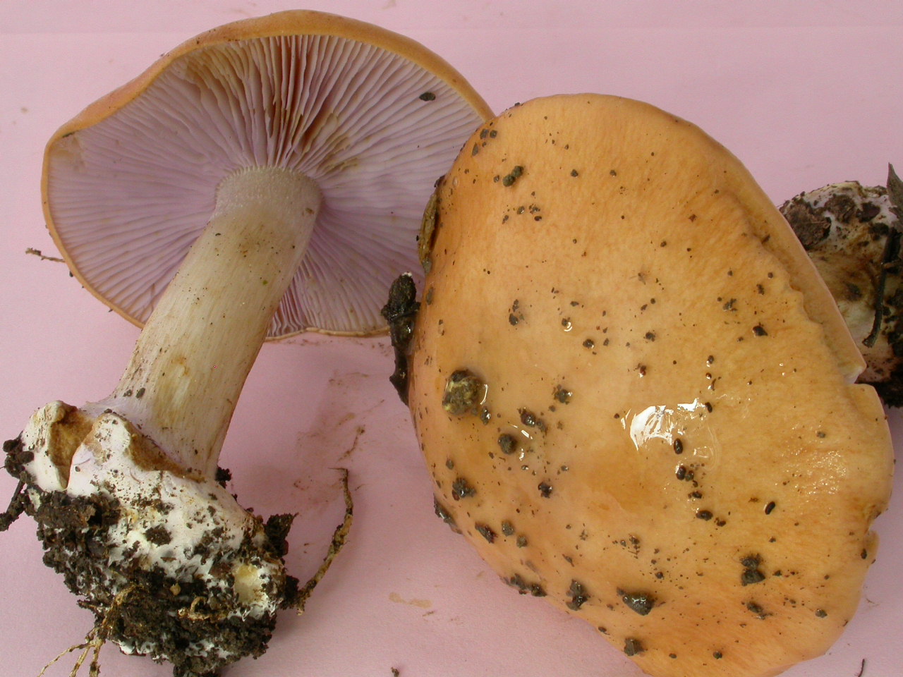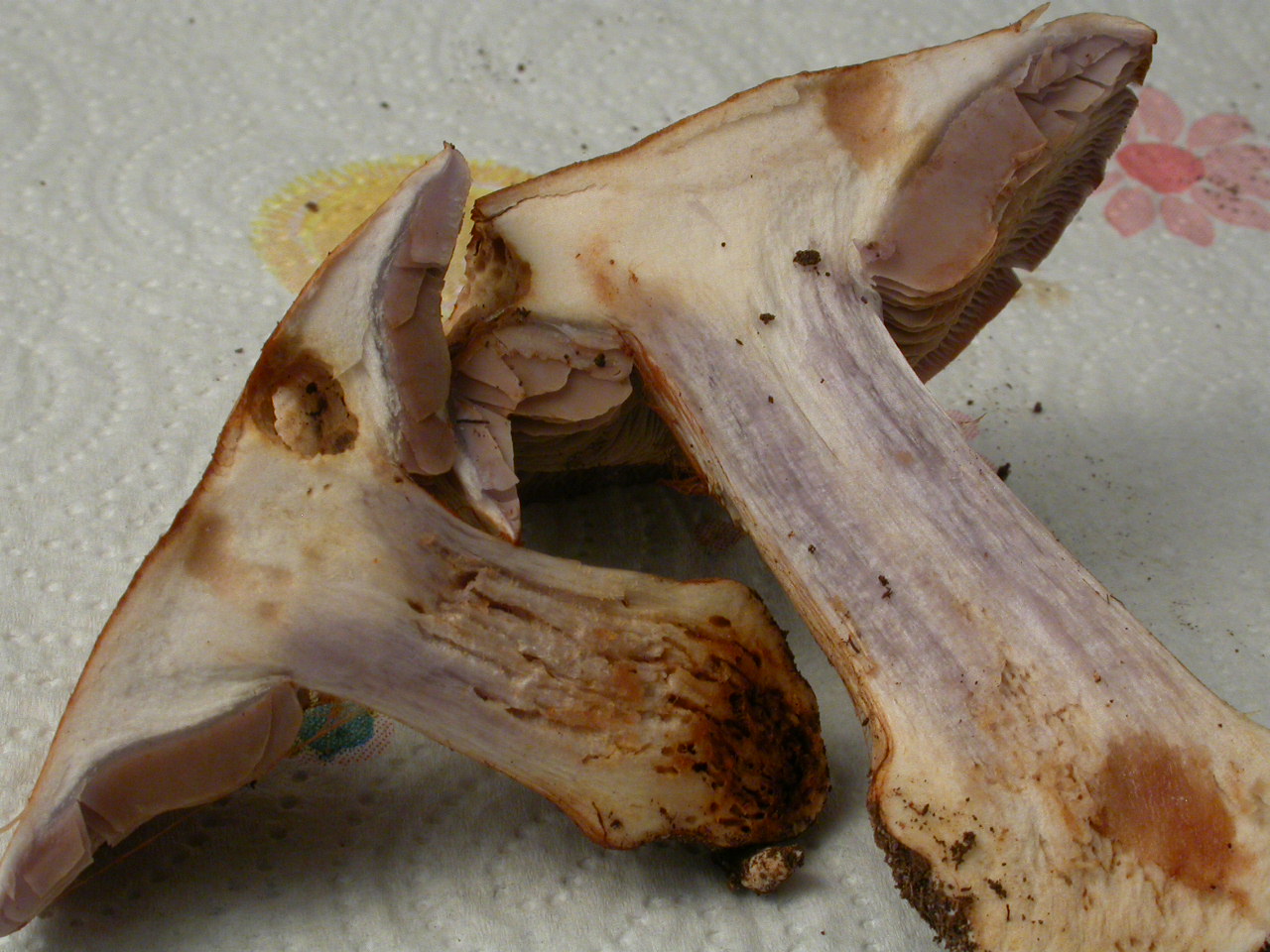 | Stipe | blanchâtre, ochracé, lilacin au sommet, bulbe brusque cerclé d'un voile bleu lilacin |