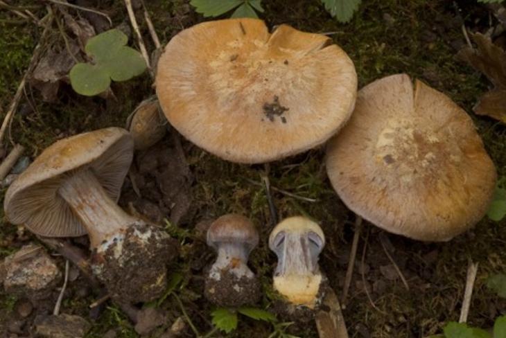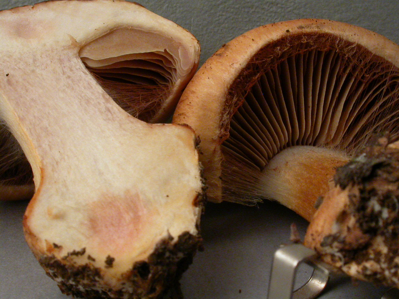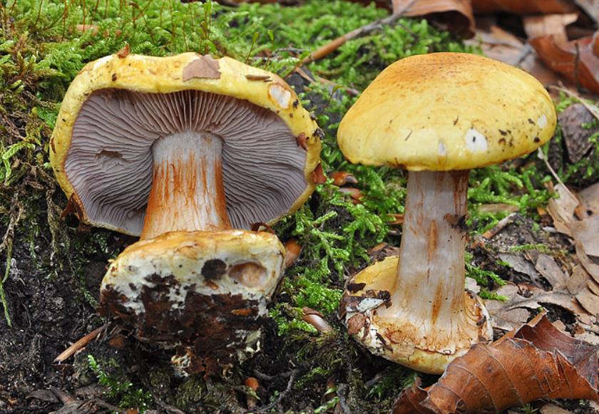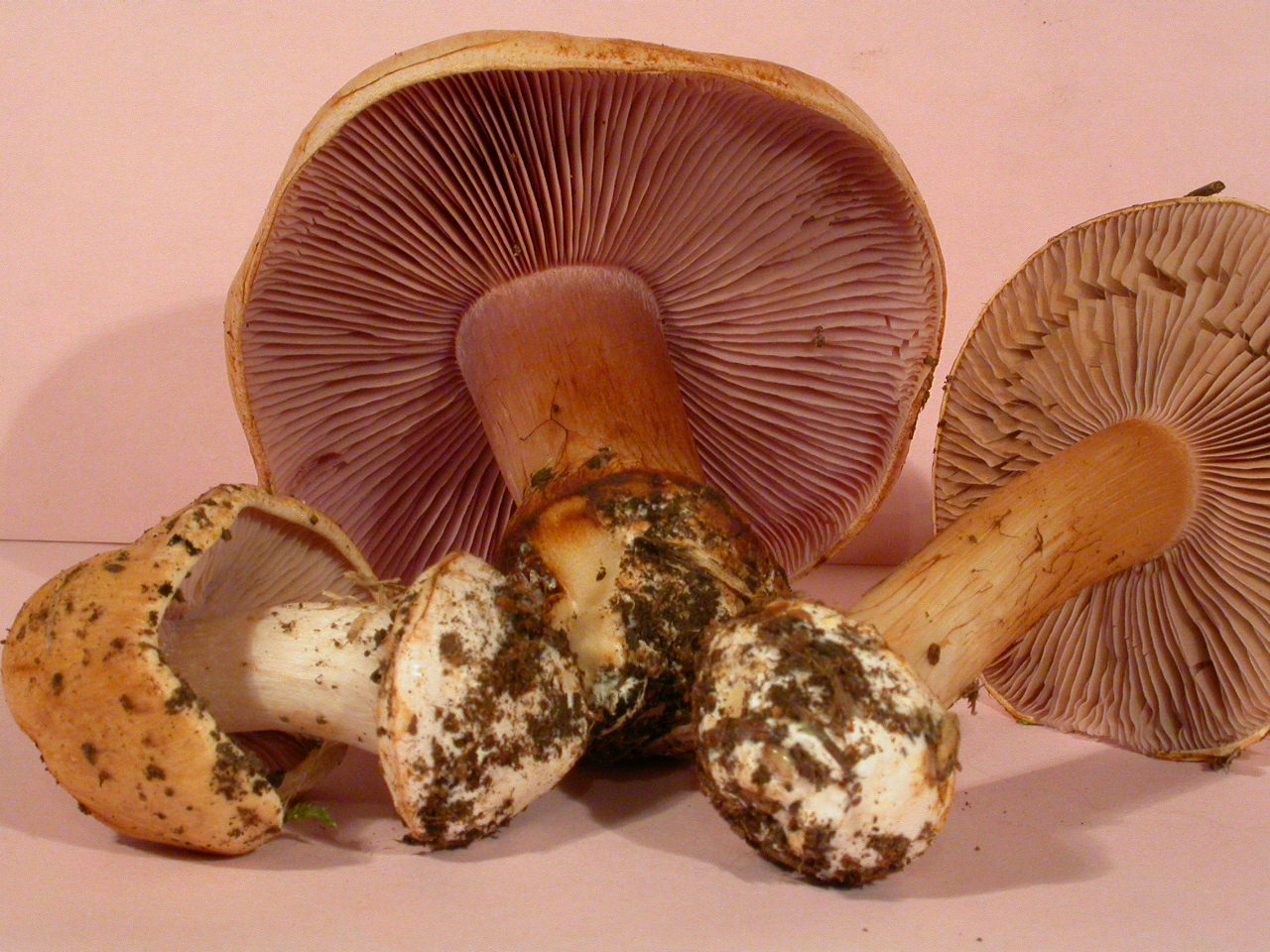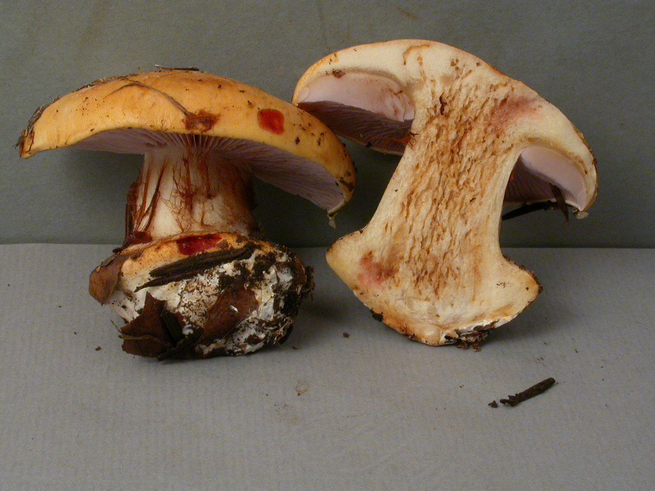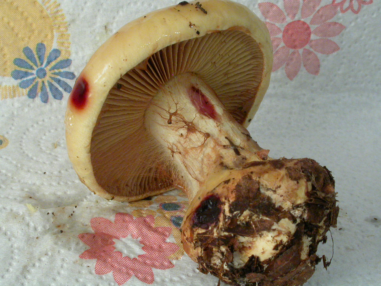 | Stipe | blanchâtre, ochracé, lilacin au sommet, bulbe brusque cerclé d'un voile bleu lilacin |
