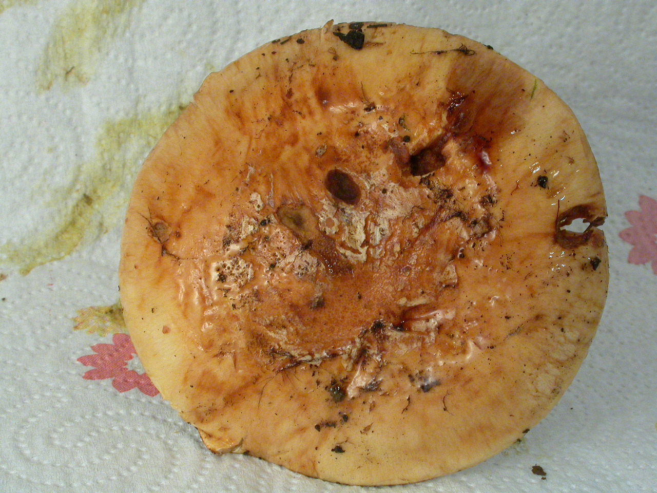 | Chapeau | jaune vert, sali radialement de brun fauve noirâtre |