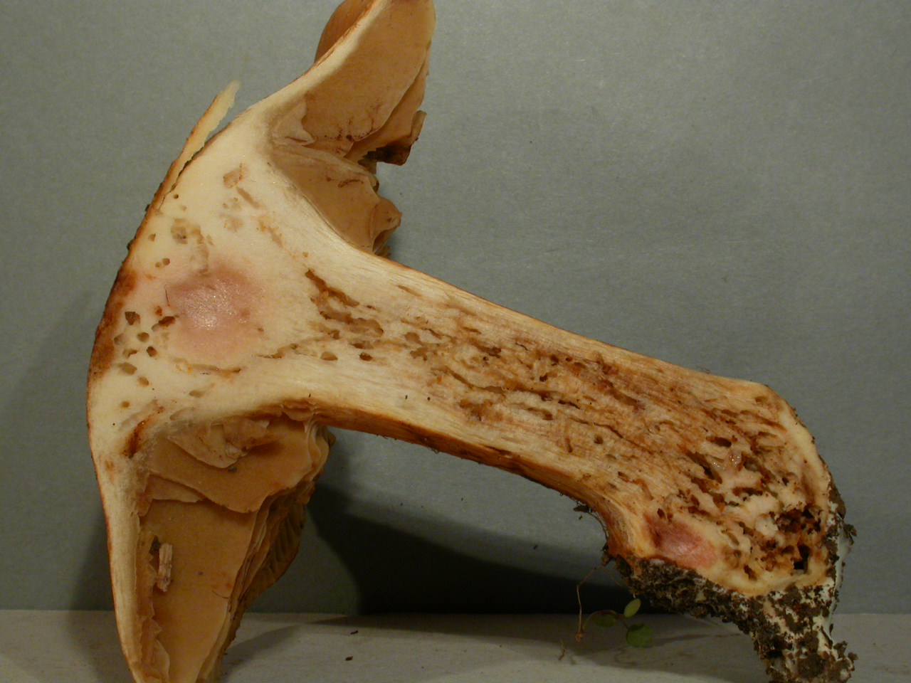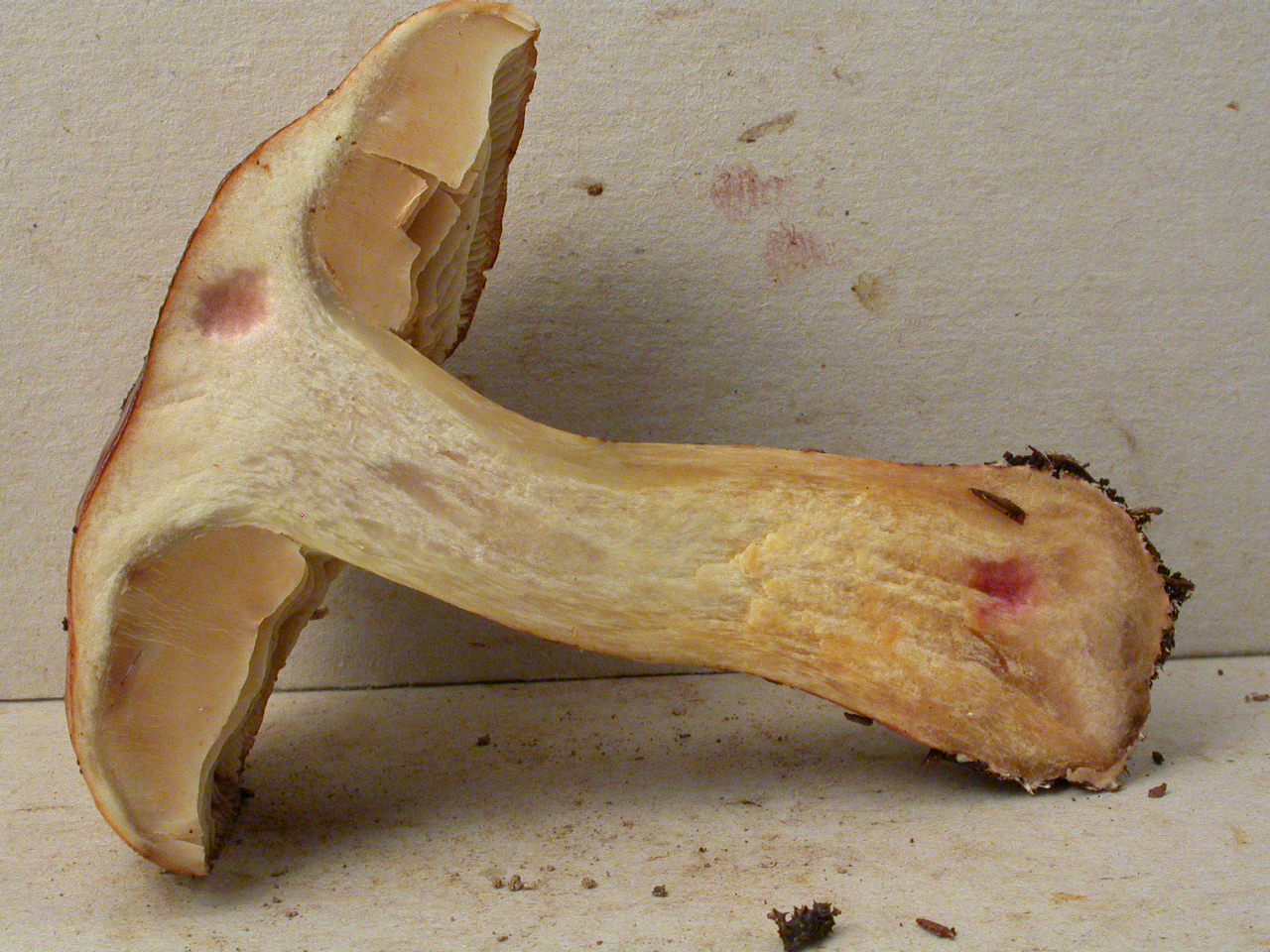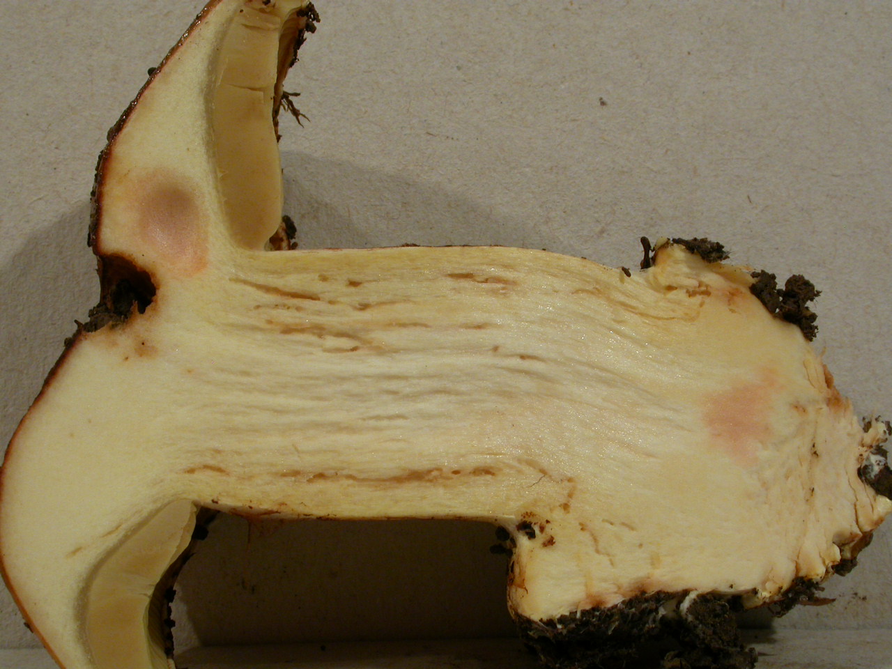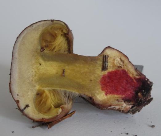 | Stipe | Jaune olivâtre, rougeâtre sur le bulbe |
