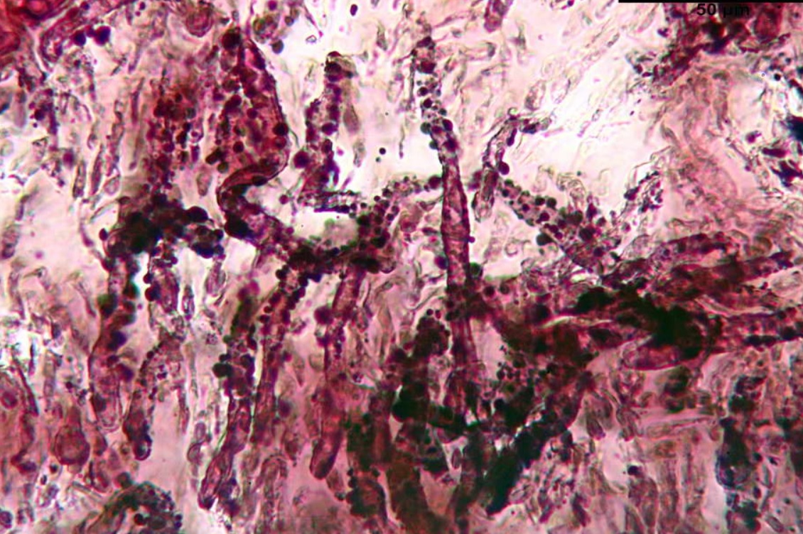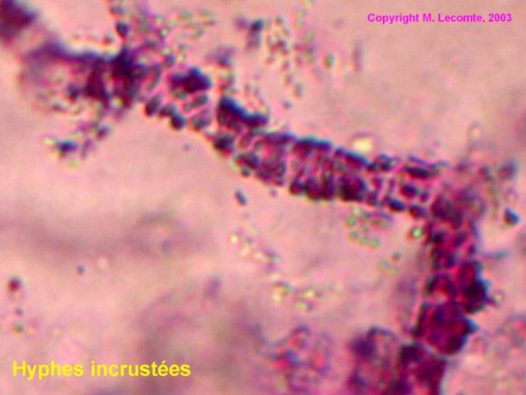 Eléments longs, cylindriques, avec de nombreuses cloisons. Ne se colorent pas mais peuvent secréter sur leur surface des incrustations que l'on va pouvoir observer avec la fuchsine . Ces incrustations résistent à l'action des acides: on dira qu'elles sont acidorésistantes