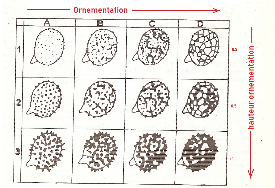 Il s'agit de caractériser l'ornementation de la spore. On peut le faire en tirant 3 informations de l'observation micro: