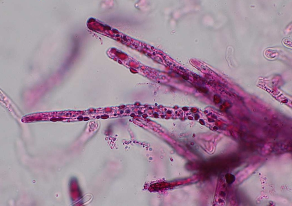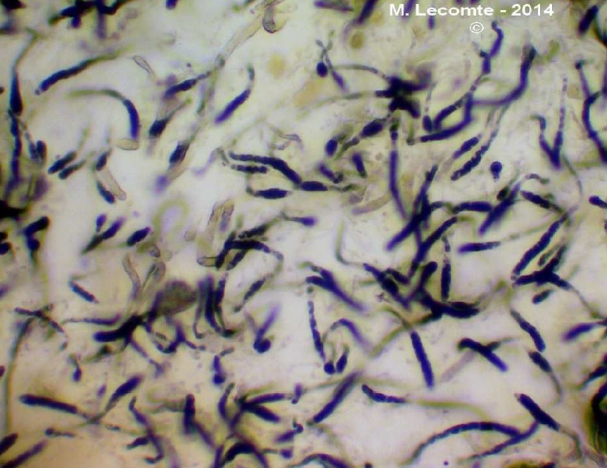 Visualisation des poils cuticulaires et des autres éléments, dermatocystides et hyphes primordiales.