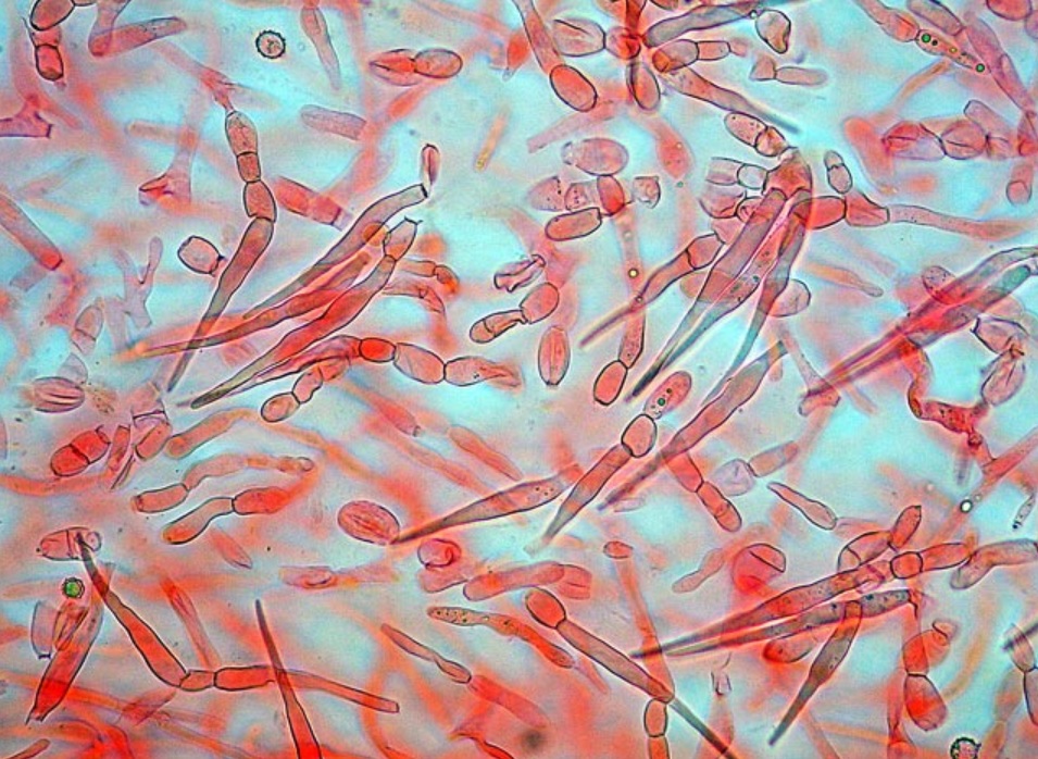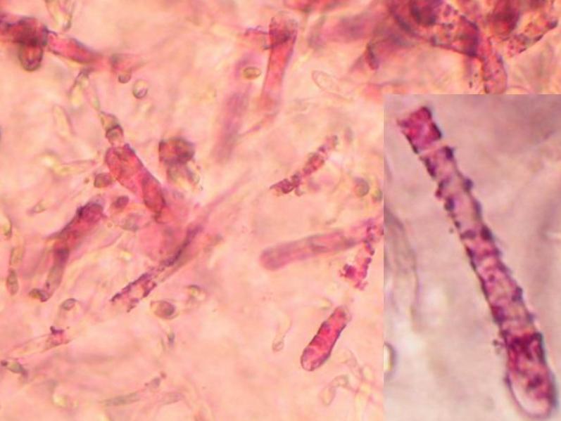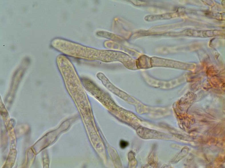 Eléments terminaison d'hyphes, paraissant vides, grêles. L'observation de leur forme peut apporter des informations importantes au niveau de l'espèce ou d'un groupe.