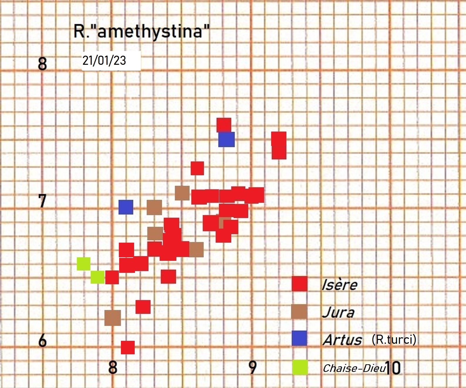 | 4 | 2230 | * | myco-Voiron | 42 | 8.7 x 6.9 | 7.0 | IIb(Cc), | HP++ (fuch.), | courts, polymorphes, | SV- | photo | |
