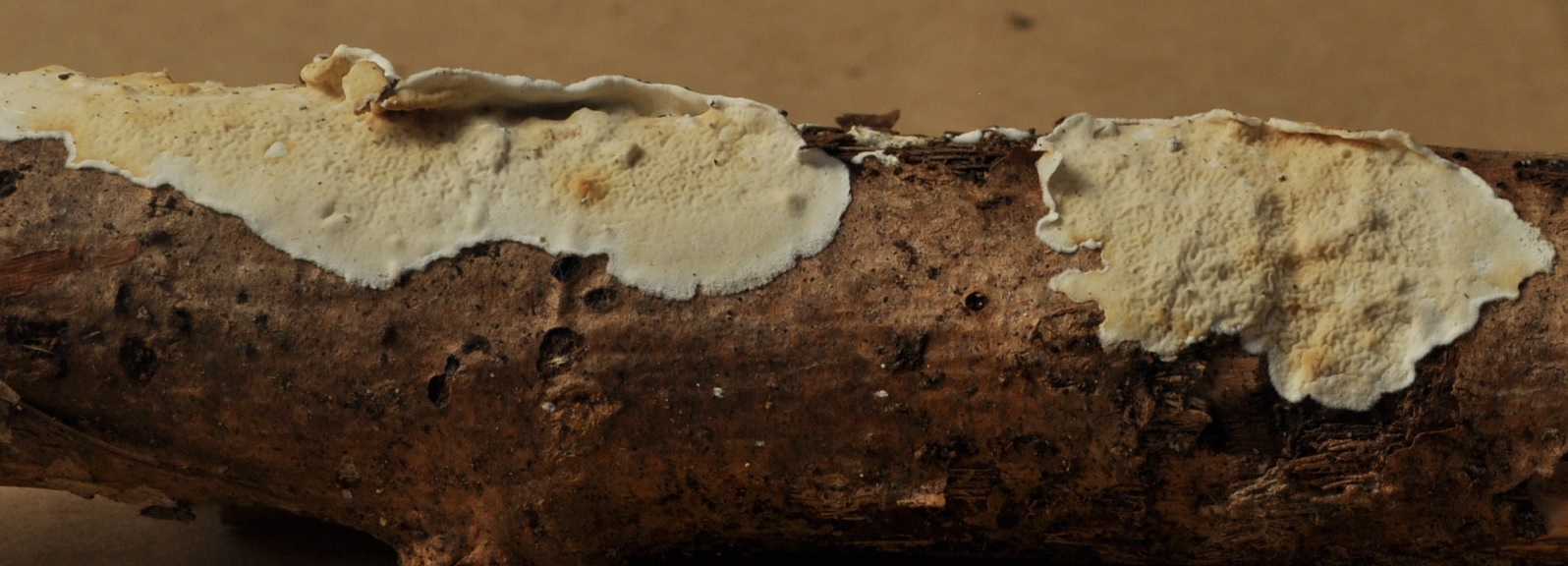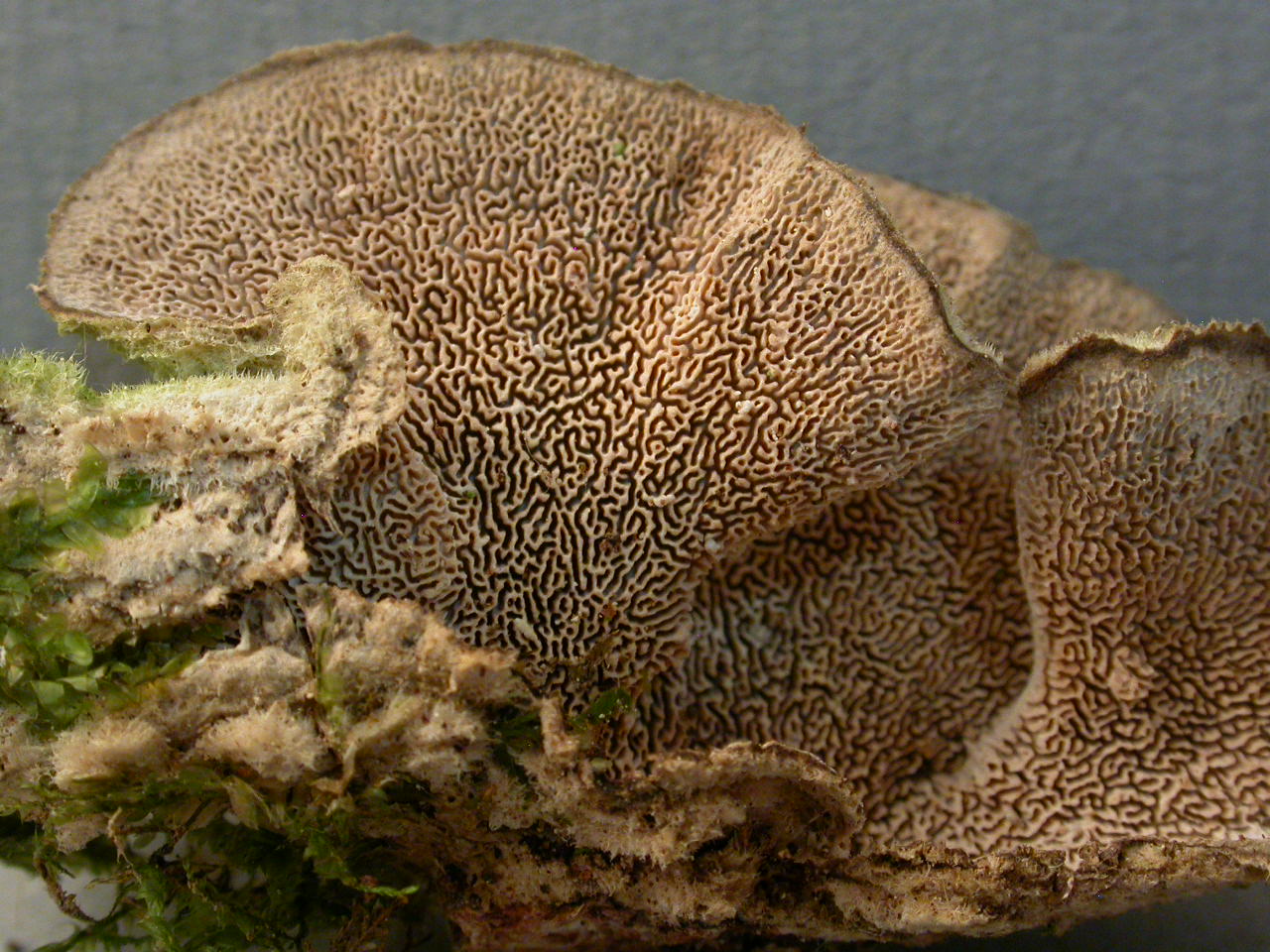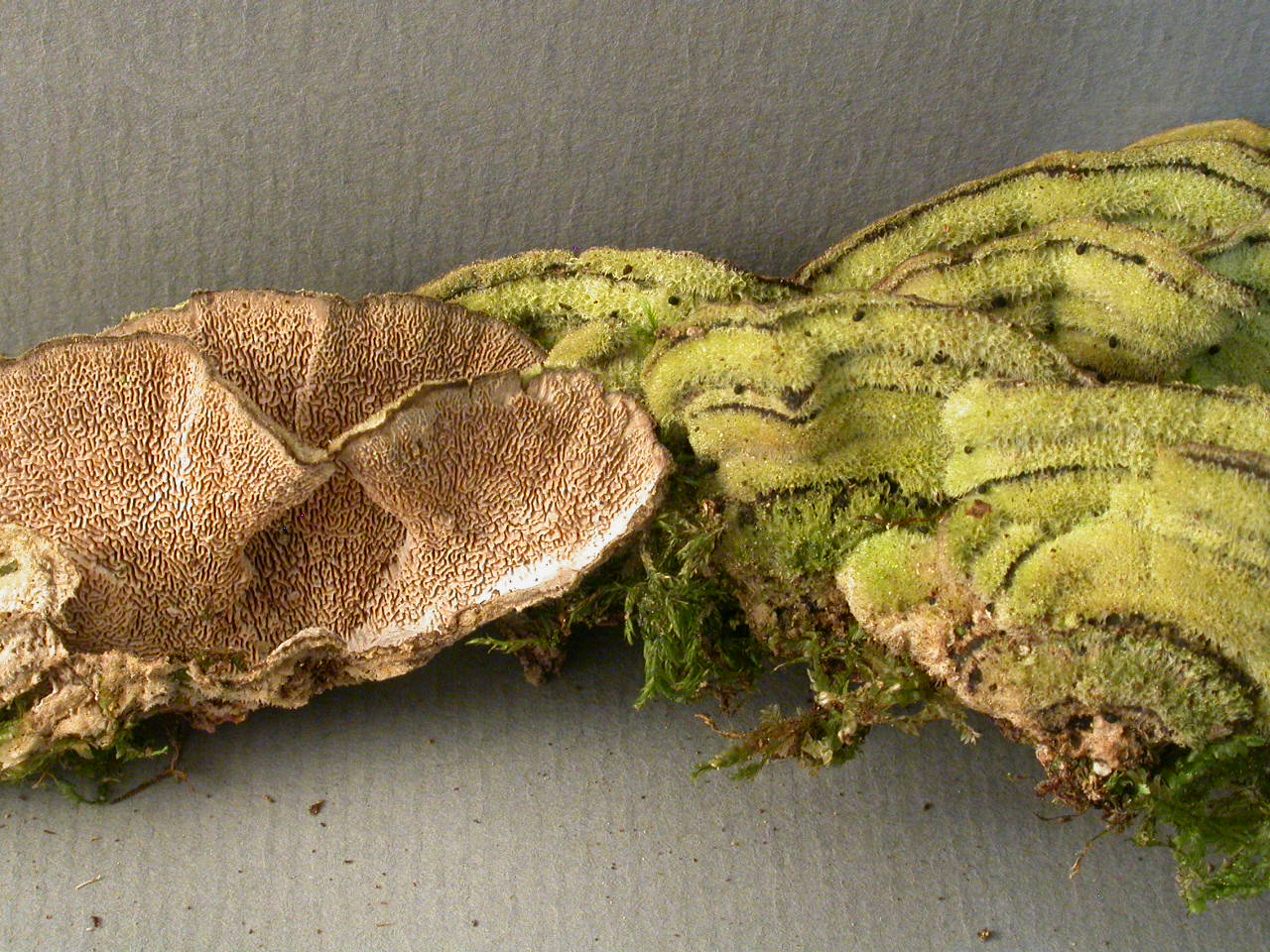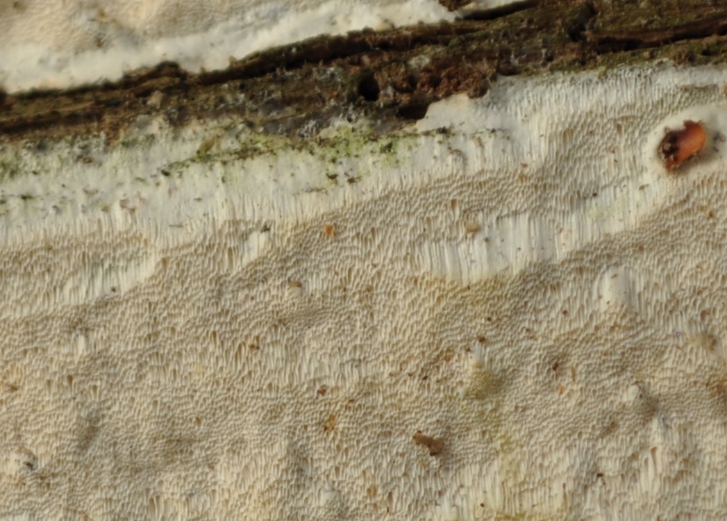 Spores: L=5.6 ± 0.4 μ, e=4.1 ± 0.4 μ Q=1.38 ± 0.10 (n=20, RCA), Apparaissait piléé, denté, suspecté Irpex lactea, en fait simplement Schizopora paradoxa, pas de vrai chapeau, simplement des poils faits d'hyphes agglomérées, sans context dessous, mais pouvant produire des spores. Dans la mousse sur un support vertical. Signalé par Rywarden et l'on trouve des récoltes proches sur le net.