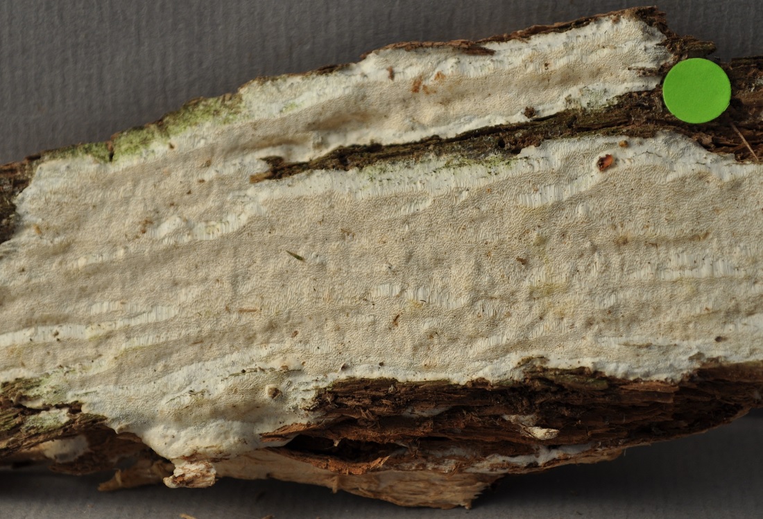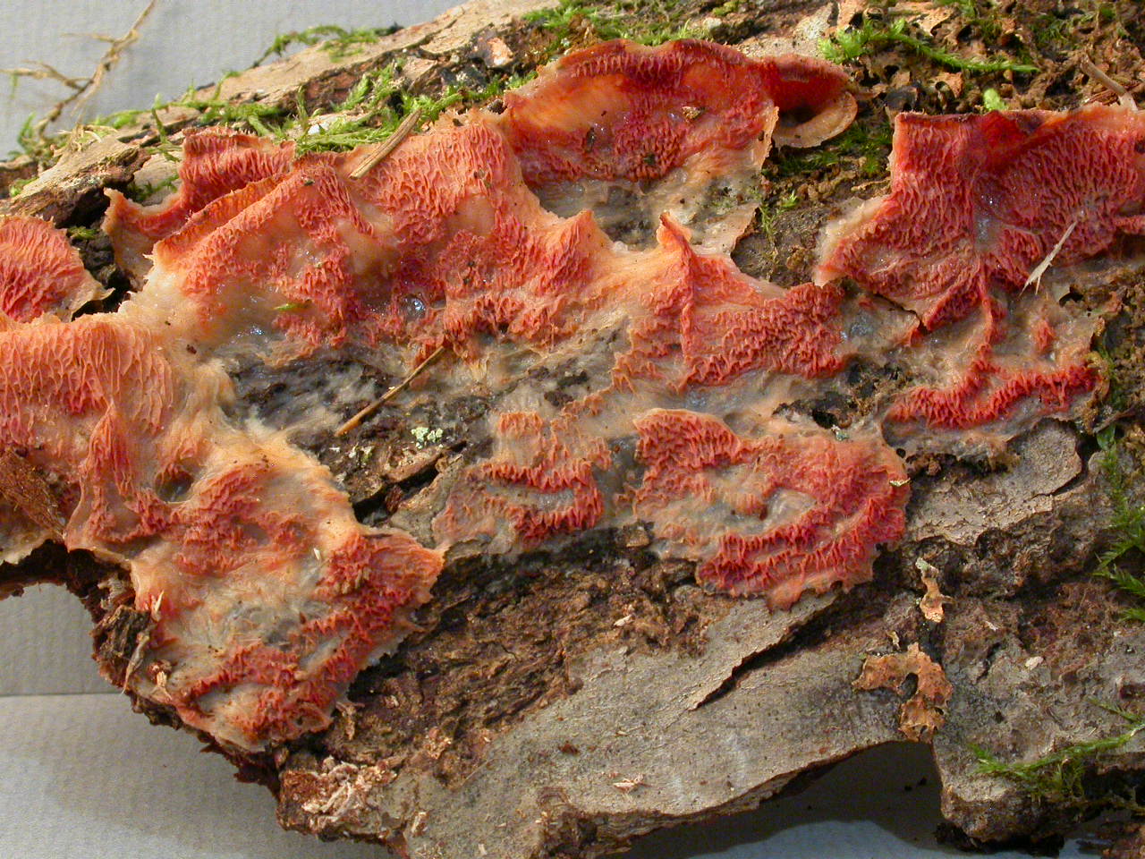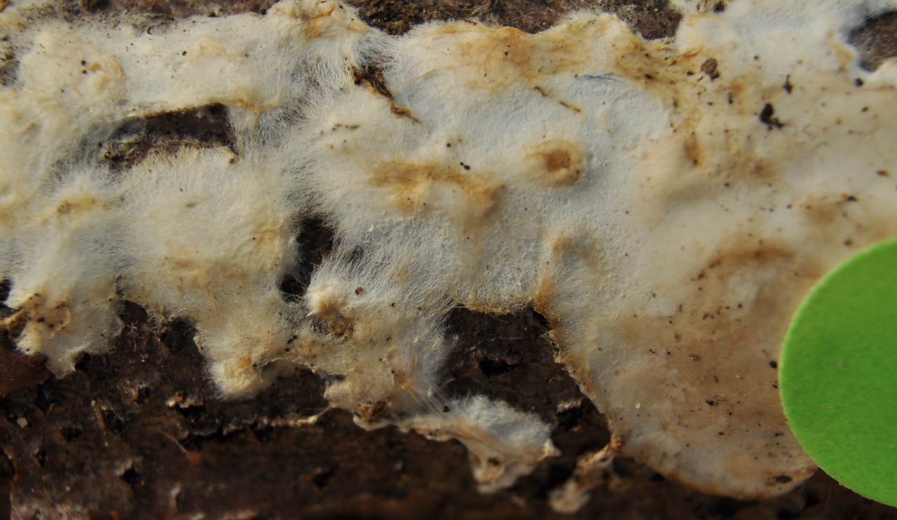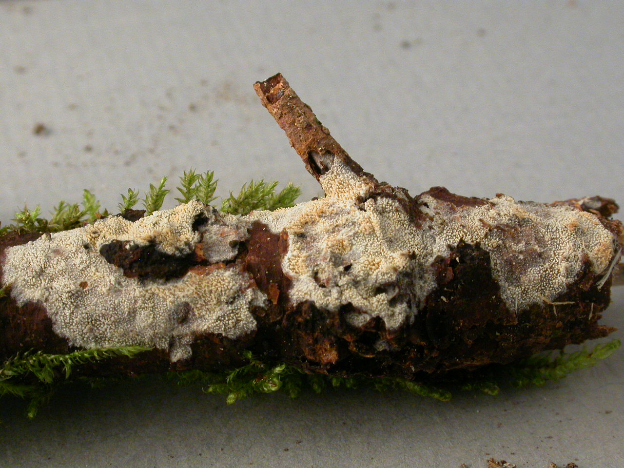 Spores: L=5.6 ± 0.4 μ, e=4.1 ± 0.4 μ Q=1.38 ± 0.10 (n=20, RCA), Apparaissait piléé, denté, suspecté Irpex lactea, en fait simplement Schizopora paradoxa, pas de vrai chapeau, simplement des poils faits d'hyphes agglomérées, sans context dessous, mais pouvant produire des spores. Dans la mousse sur un support vertical. Signalé par Rywarden et l'on trouve des récoltes proches sur le net.