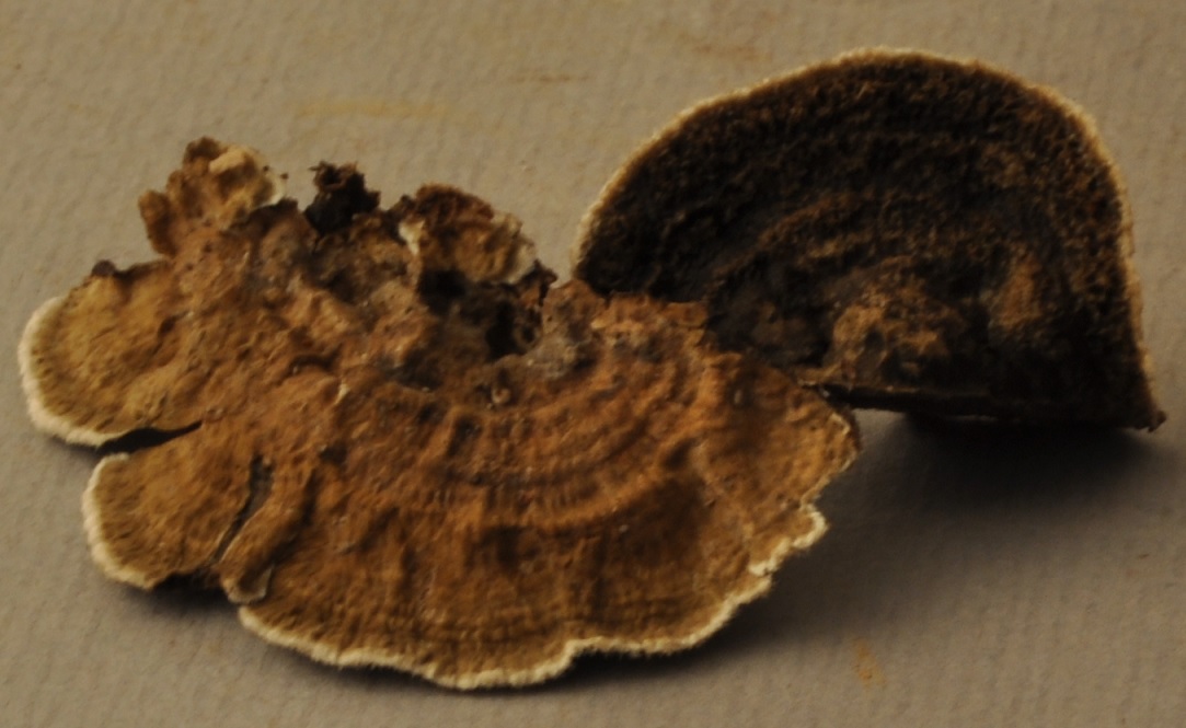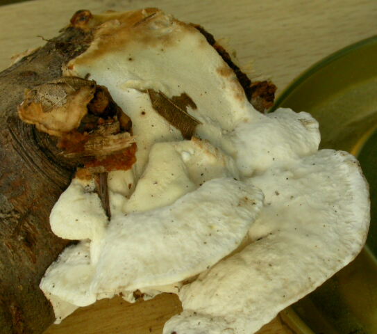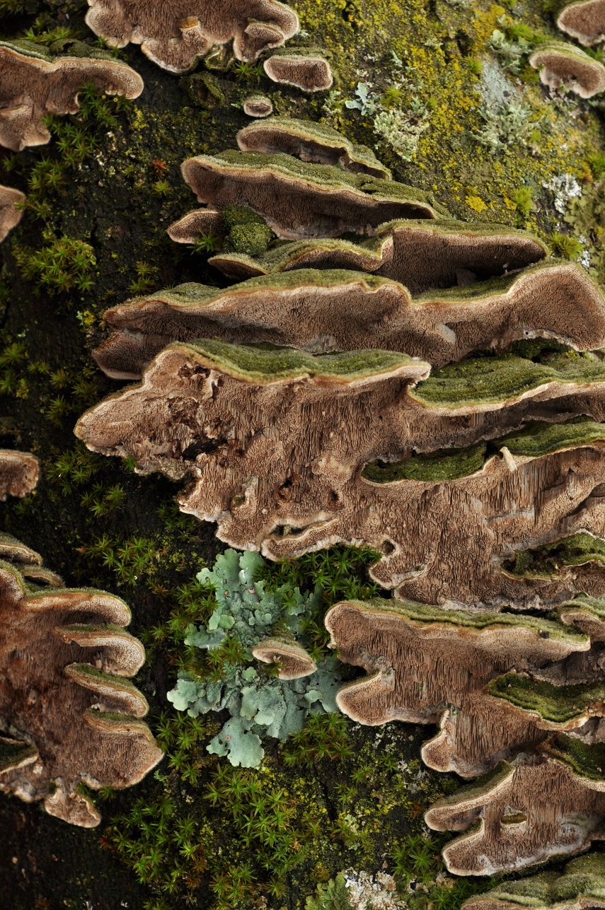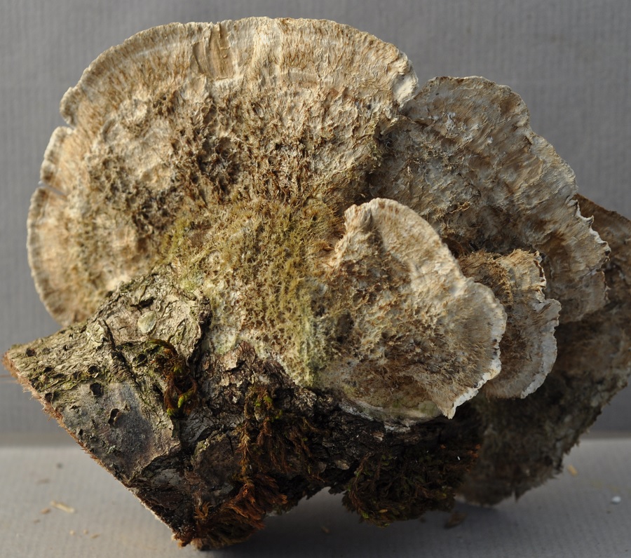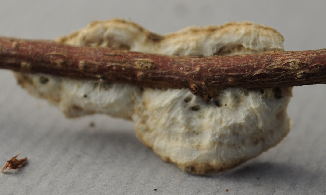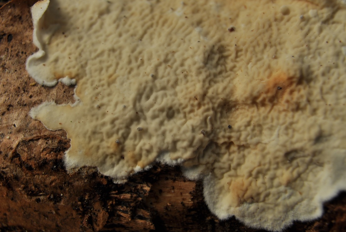 Spores: L=5.6 ± 0.4 μ, e=4.1 ± 0.4 μ Q=1.38 ± 0.10 (n=20, RCA), Apparaissait piléé, denté, suspecté Irpex lactea, en fait simplement Schizopora paradoxa, pas de vrai chapeau, simplement des poils faits d'hyphes agglomérées, sans context dessous, mais pouvant produire des spores. Dans la mousse sur un support vertical. Signalé par Rywarden et l'on trouve des récoltes proches sur le net.