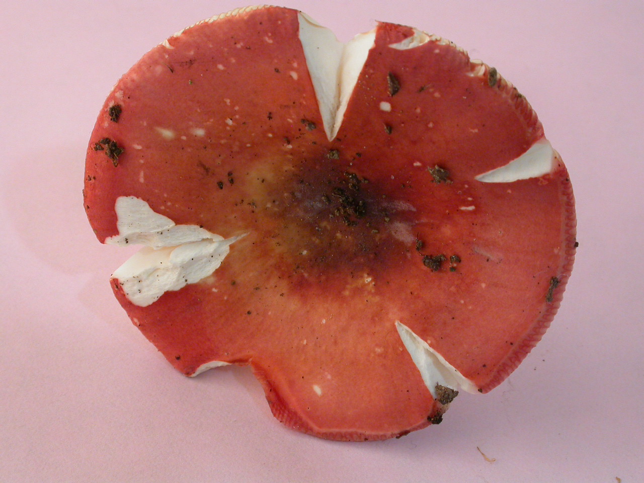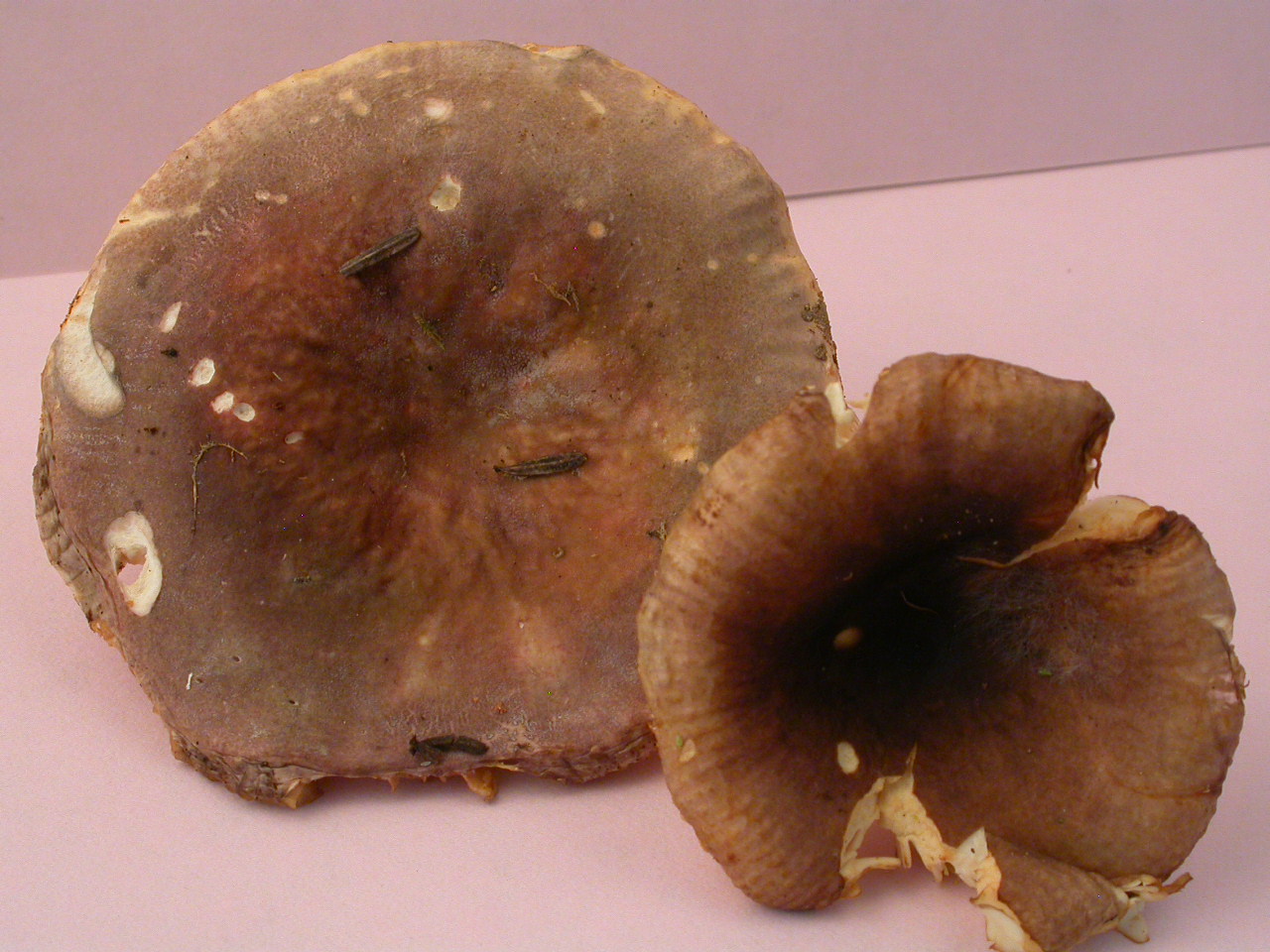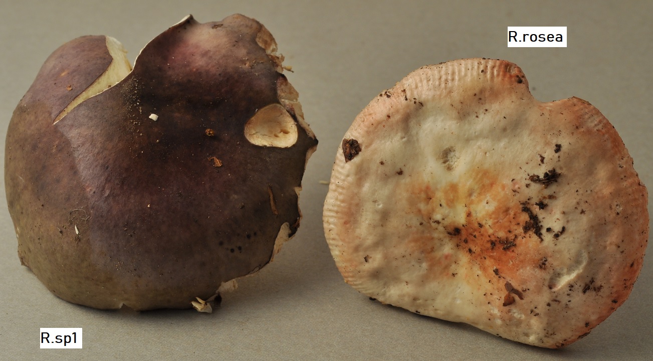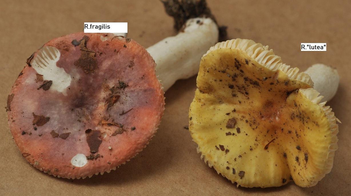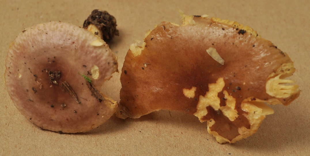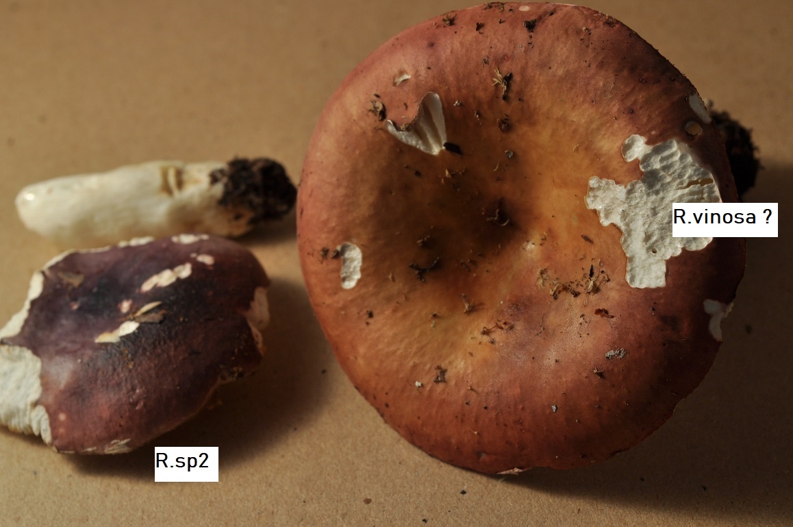 voir, CD8-F7 32. Φ 90 et 103 mm. Les couleurs du chapeau sont différentes, le rouge a disparu sur la deuxième par dilution, il reste qq teintes rougeâtres vers la marge. Lames âcres, l/t 6/10 mm, peu de chair vers la marge, chair seulement acrescente.