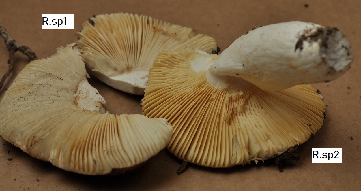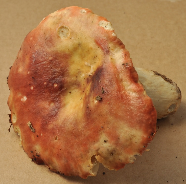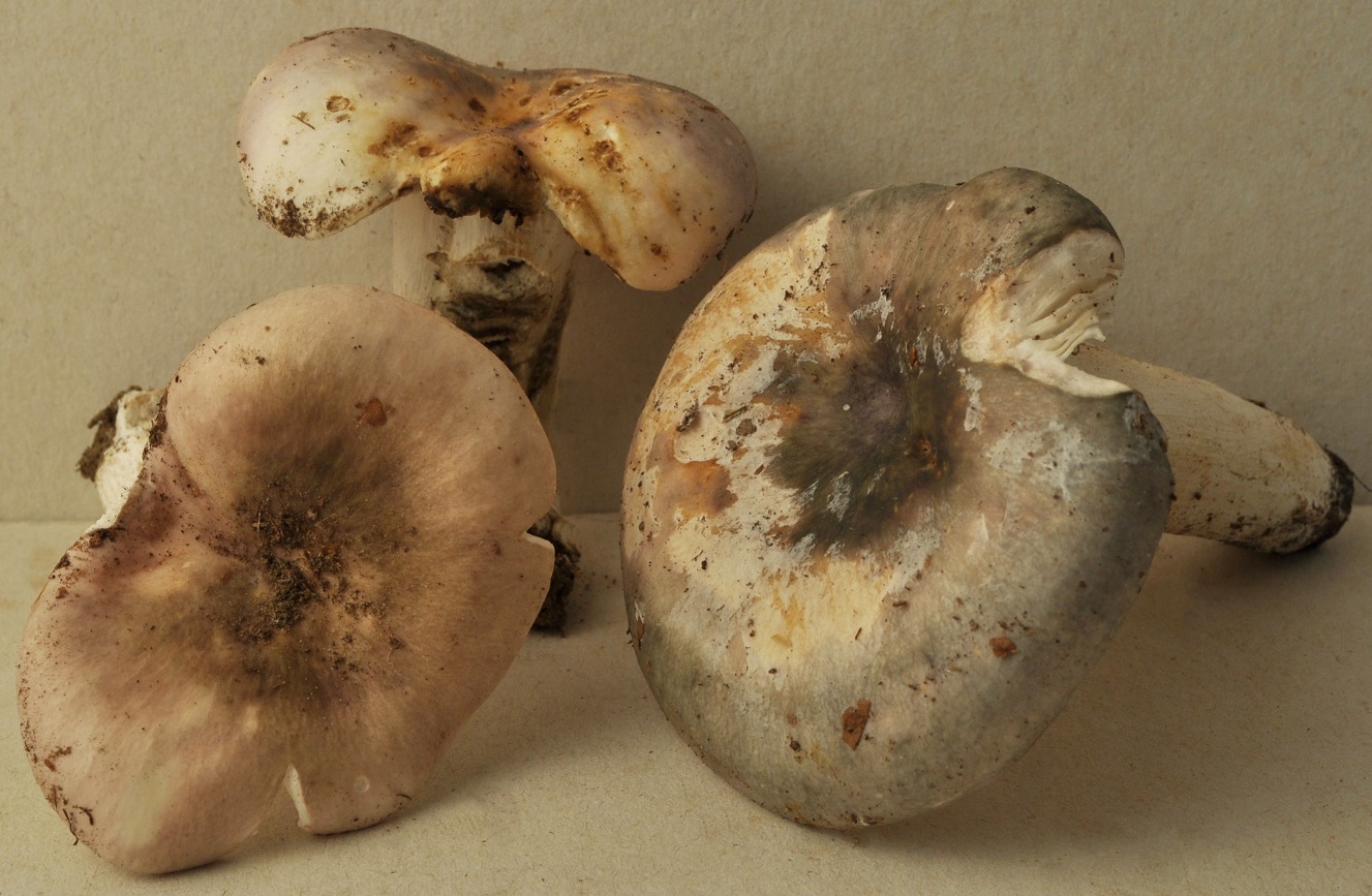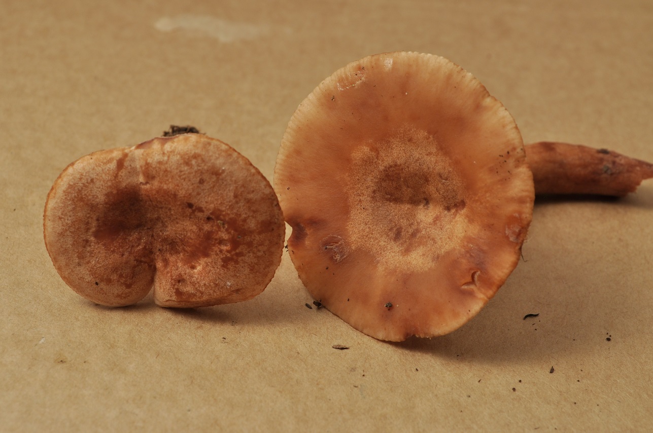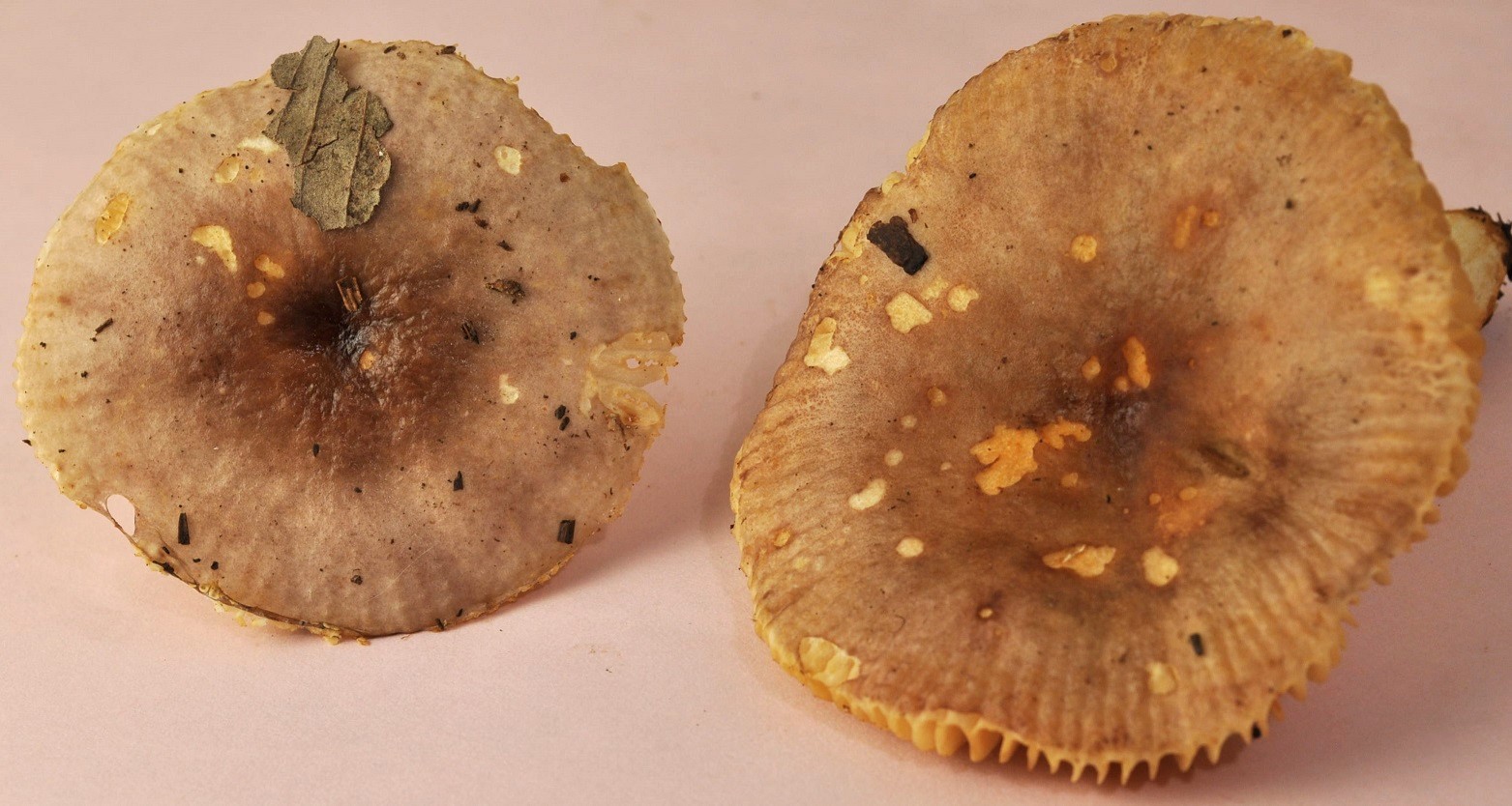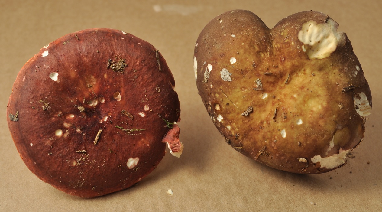 voir, CD8-F7 32. Φ 90 et 103 mm. Les couleurs du chapeau sont différentes, le rouge a disparu sur la deuxième par dilution, il reste qq teintes rougeâtres vers la marge. Lames âcres, l/t 6/10 mm, peu de chair vers la marge, chair seulement acrescente.