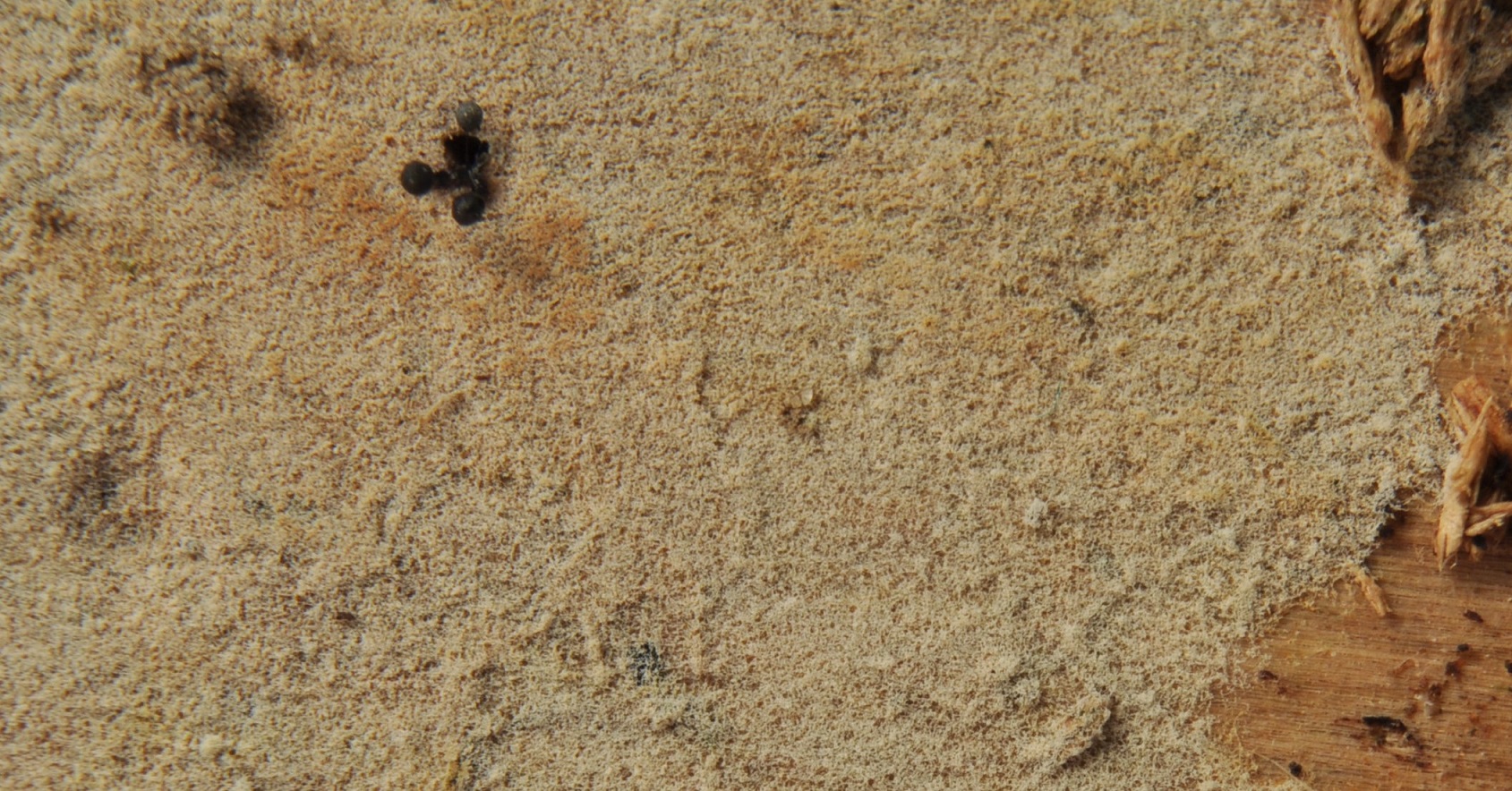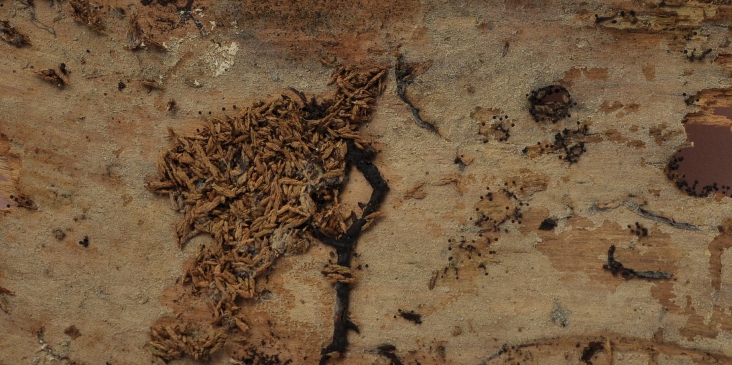 Spores : L=6.0 ± 0.5 μ, e=2.8 ± 0.2μ, Q=2.2±0.1, n=25 (RCA). Fructification nommée Stereum sanguinolentum, puis Lopharia spadicea et finalement Amylostereum chailletii sur la base du tableau comparatif. L'absence de rougissement au frottement était sans doute suffisant pour éliminer S.sanguinolentum. L'amyloïdité des spores, la largeur sporale, l'habitat sont les caractéristiques essentielles qui mènent au choix de A.chailletii.