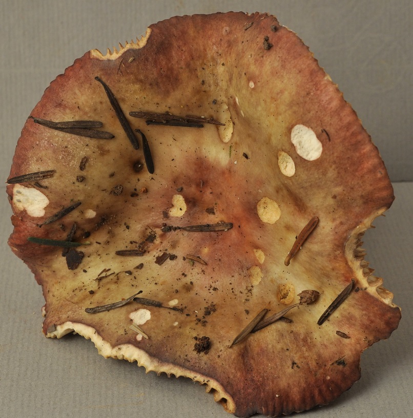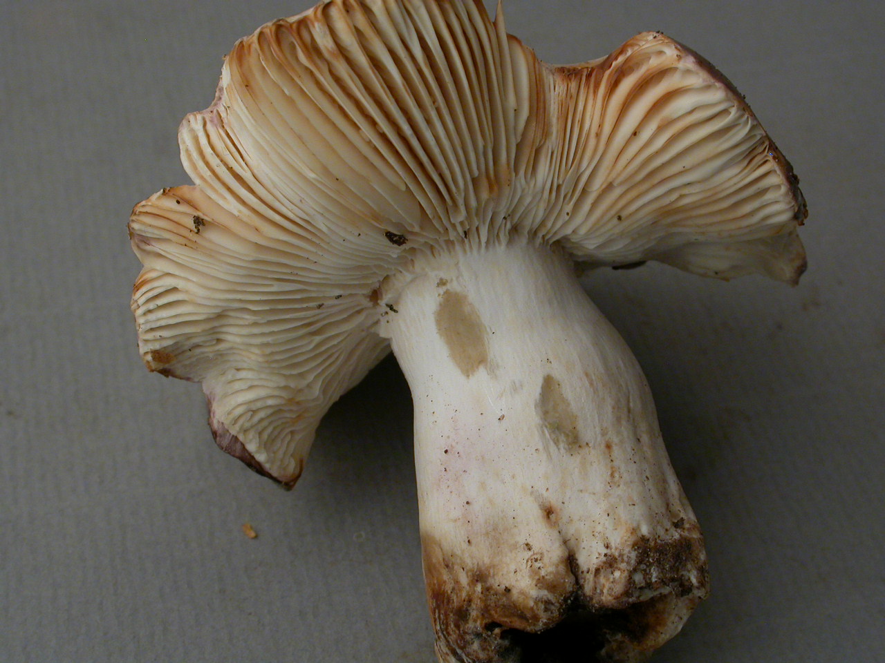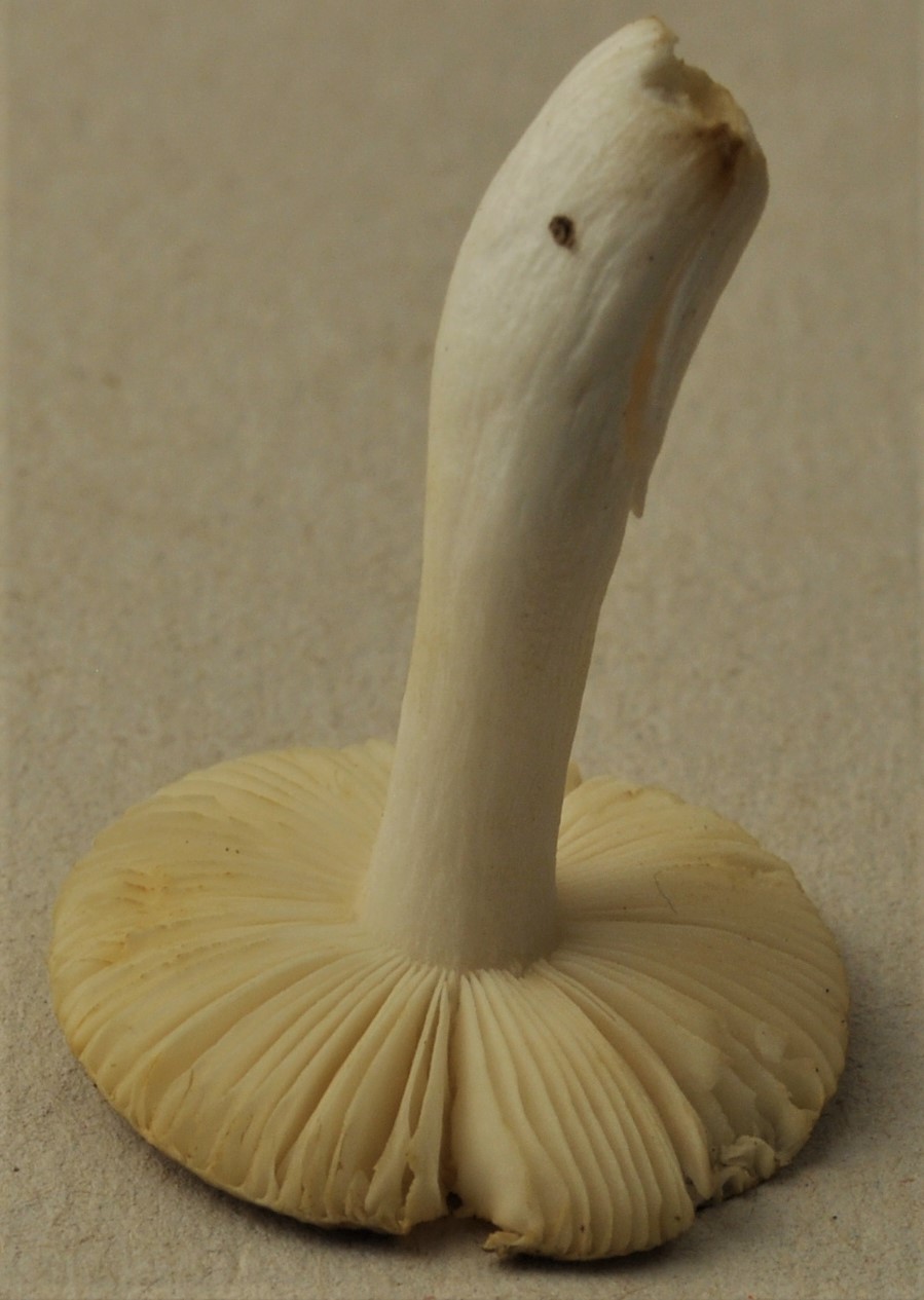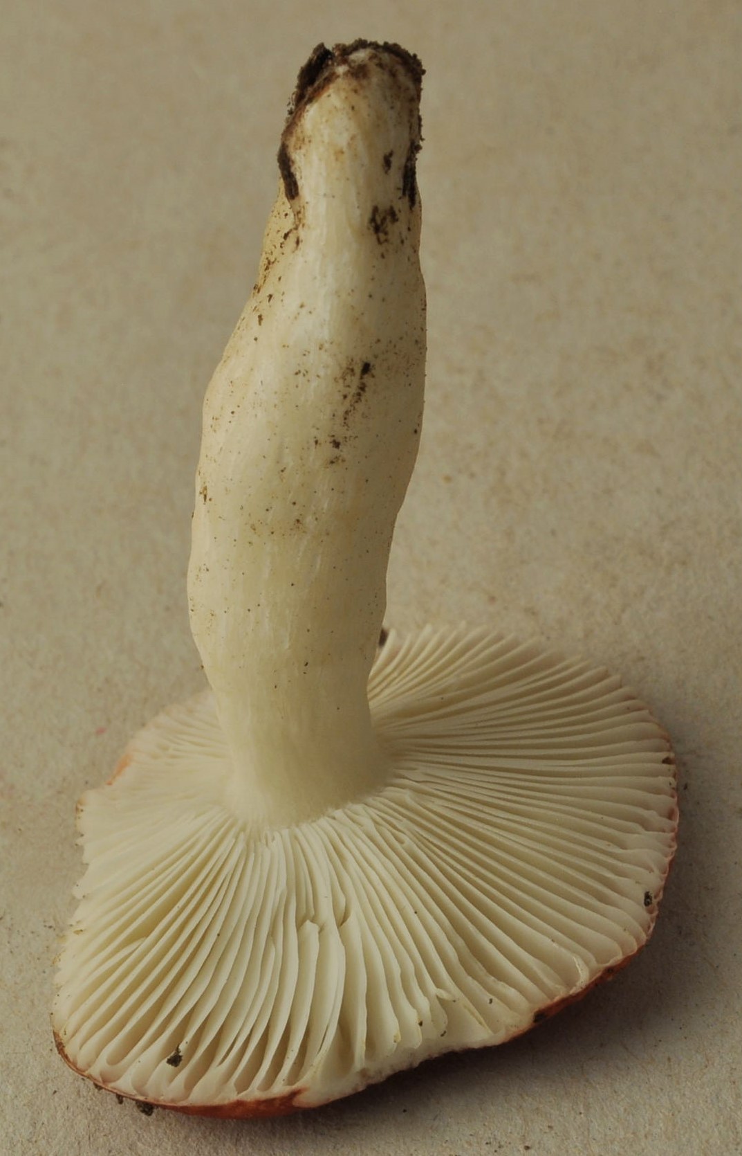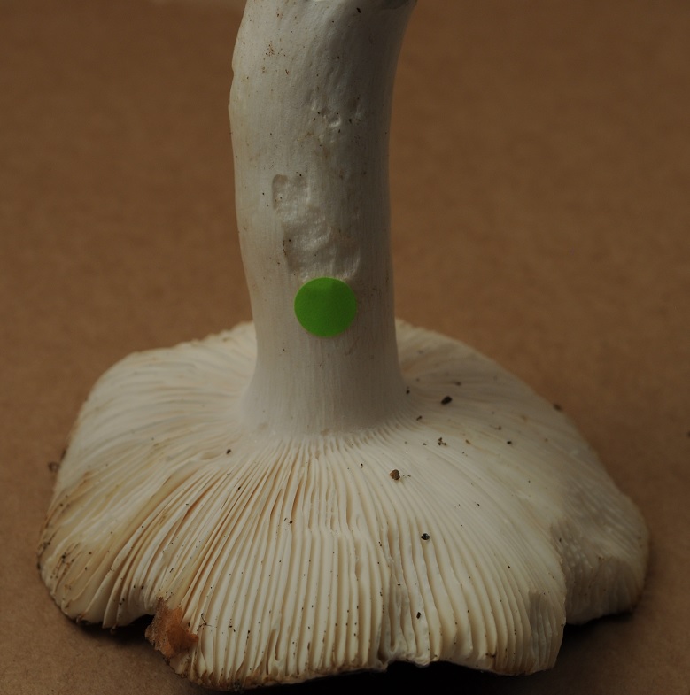dessous, CD-F6 11/12. Chapeau blanchâtre, taché de rougeâtre, cuticule détachable. Stipe blanc, cylindrique, un peu rétrécit et courbé en bas. Lames blanches, fourchues, denses, anastomosées localement, avec lamellules. Odeur fruitée, agréable. Saveur douce (chair, lames). Gaiac S0 L0 C0, Fe pâle orange.