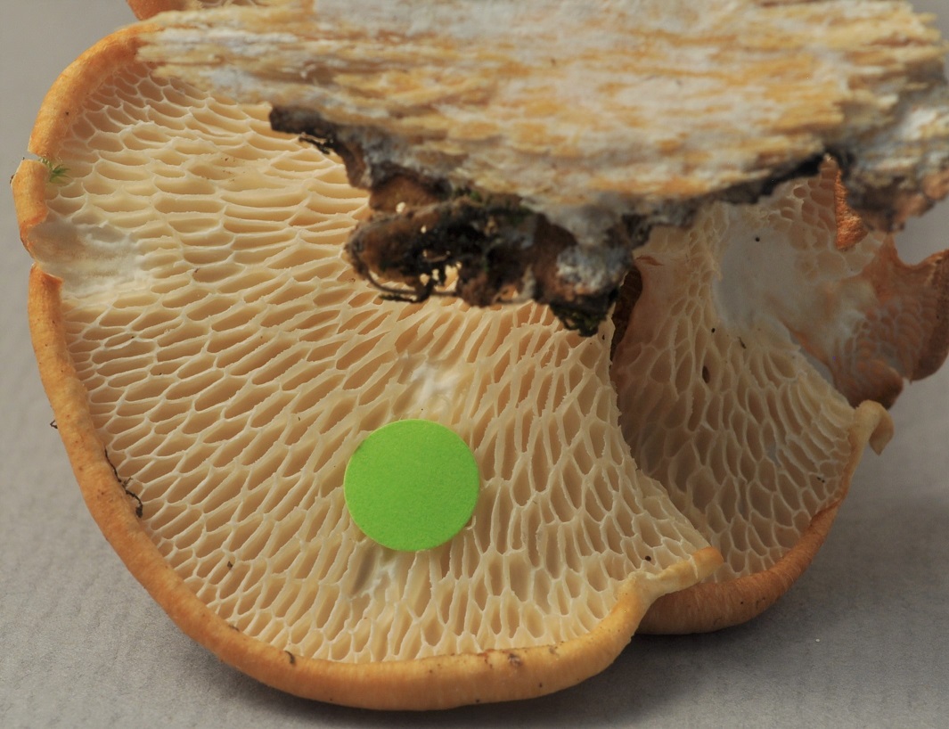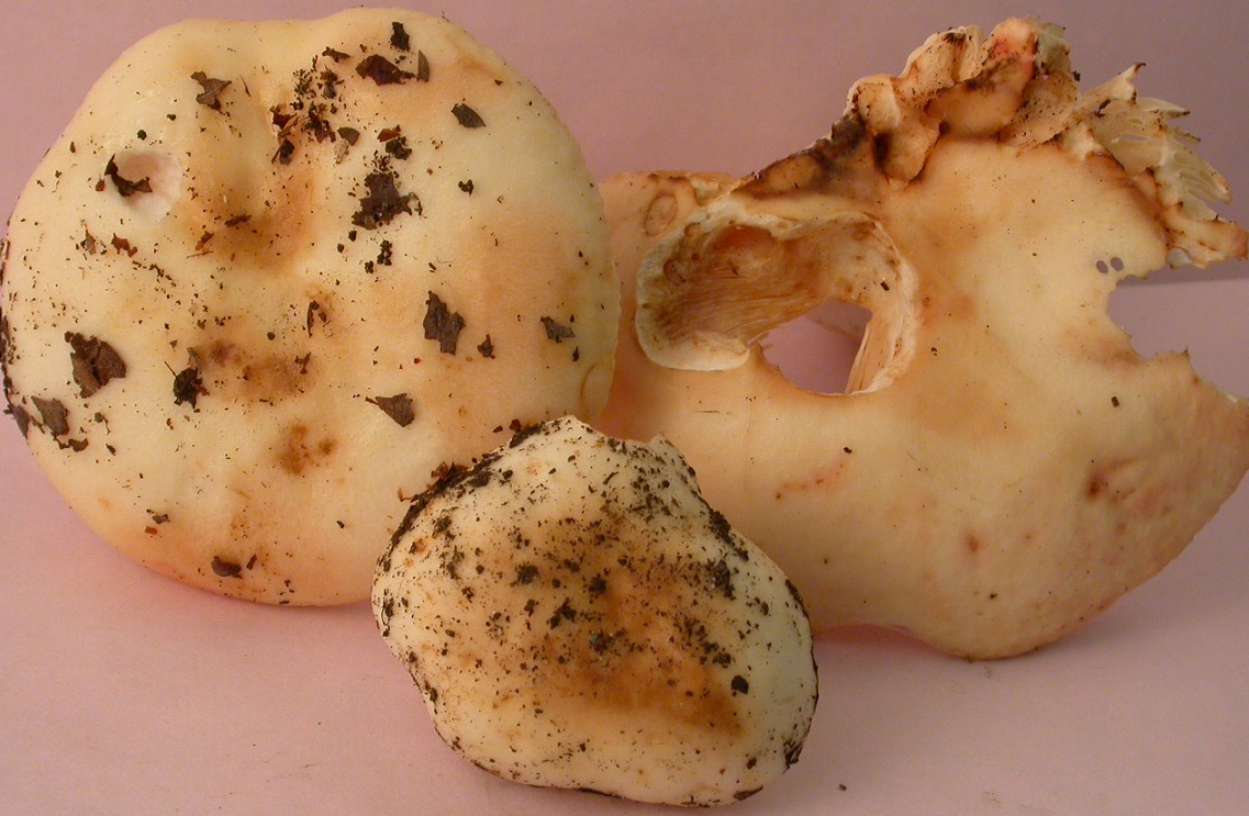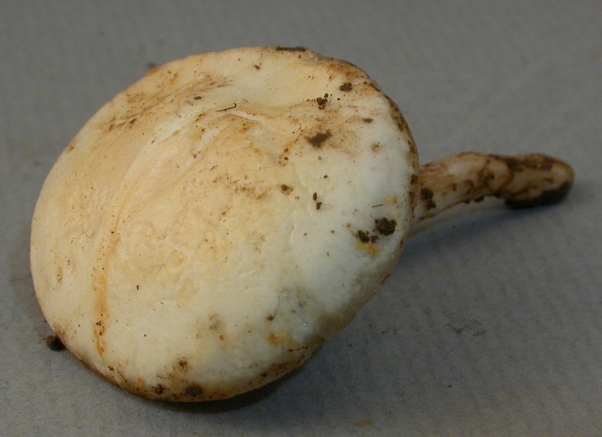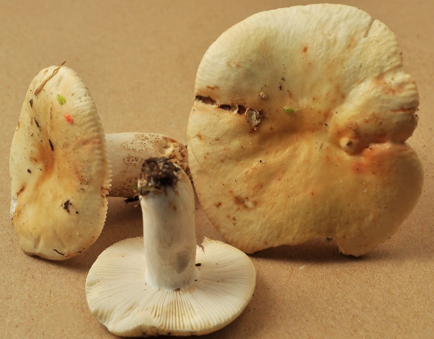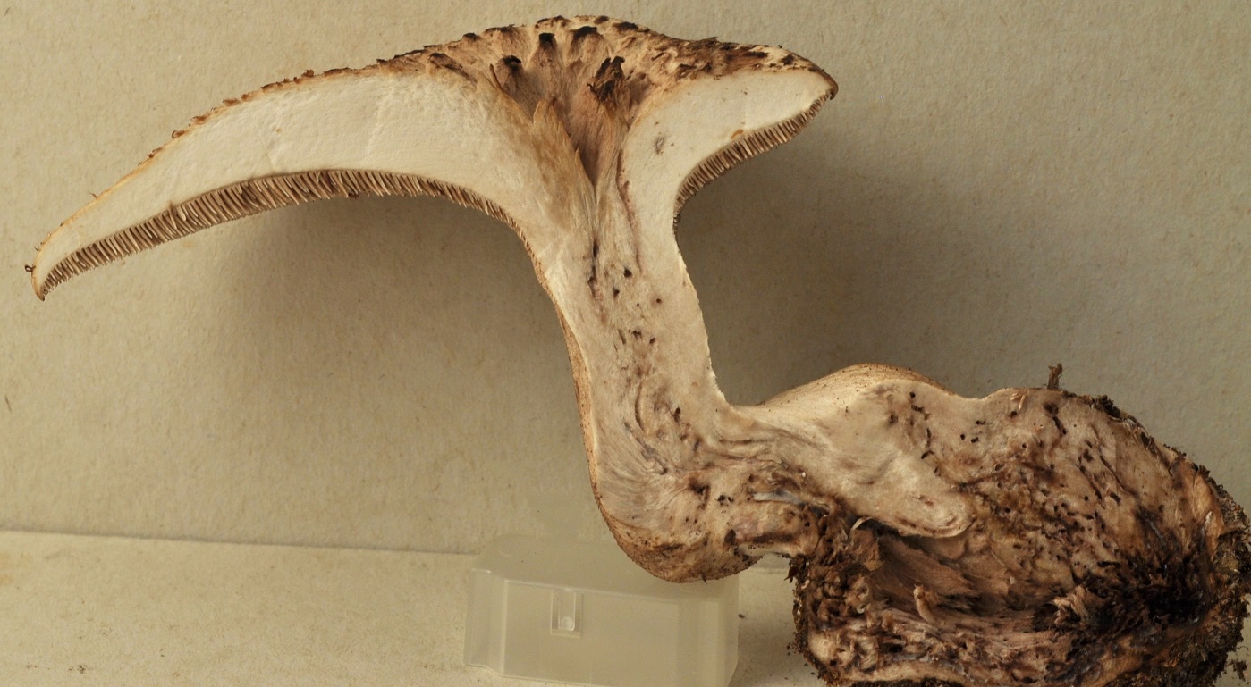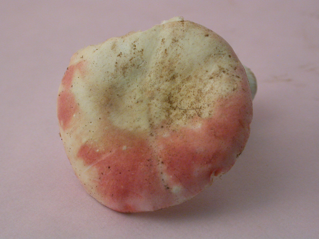 dessous, CD-F6 11/12. Chapeau blanchâtre, taché de rougeâtre, cuticule détachable. Stipe blanc, cylindrique, un peu rétrécit et courbé en bas. Lames blanches, fourchues, denses, anastomosées localement, avec lamellules. Odeur fruitée, agréable. Saveur douce (chair, lames). Gaiac S0 L0 C0, Fe pâle orange.