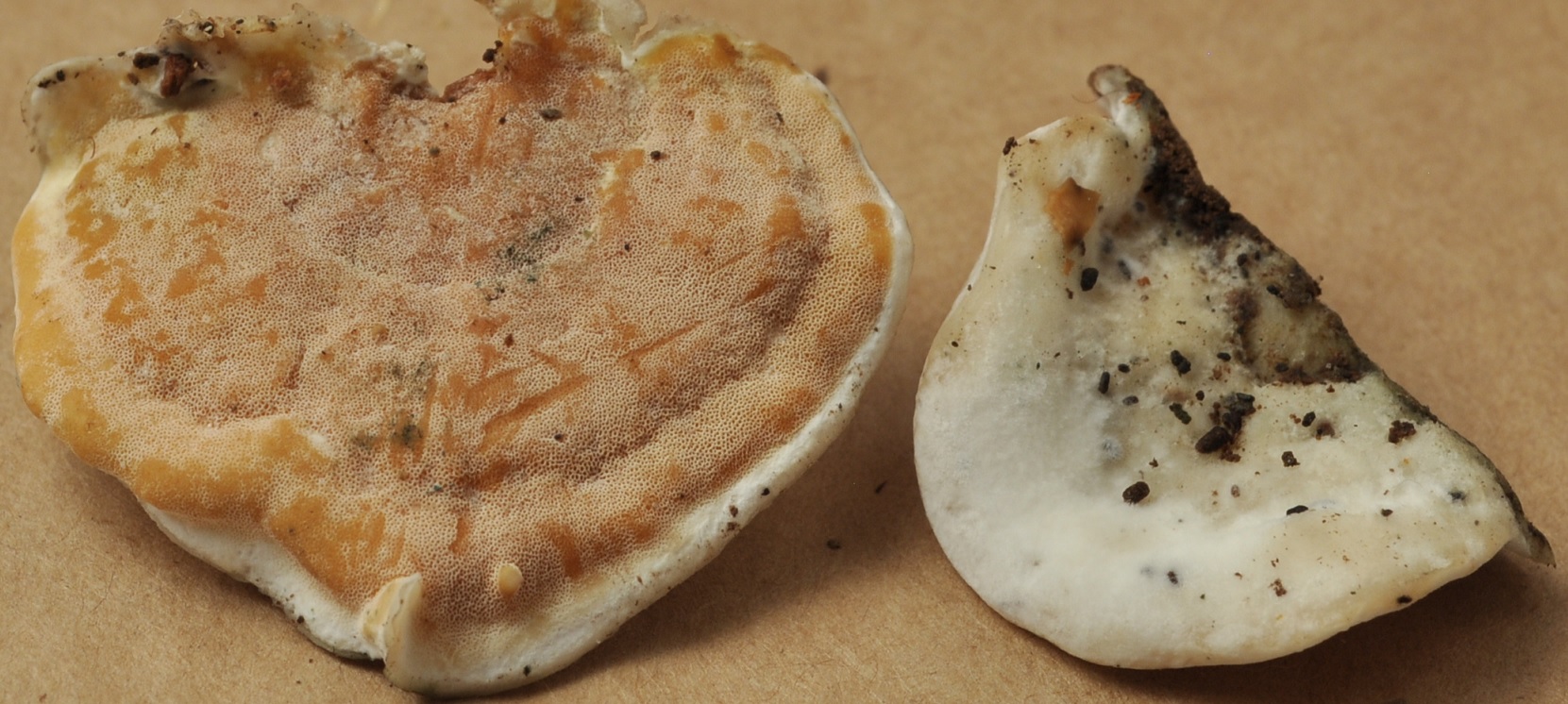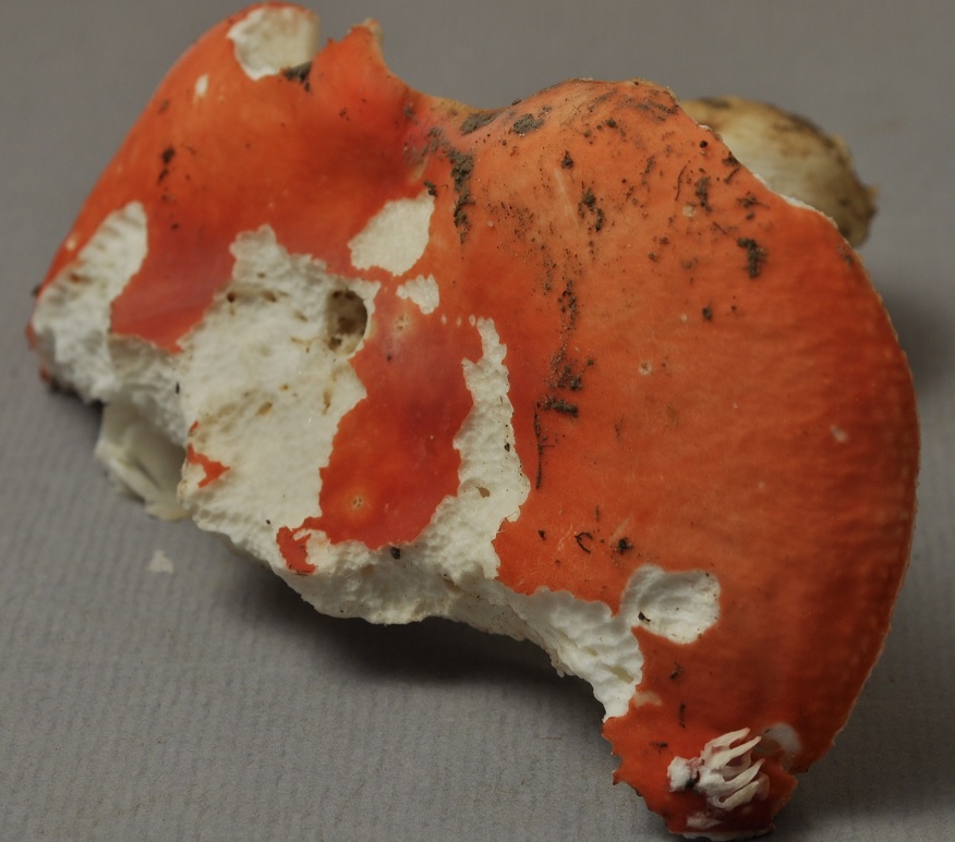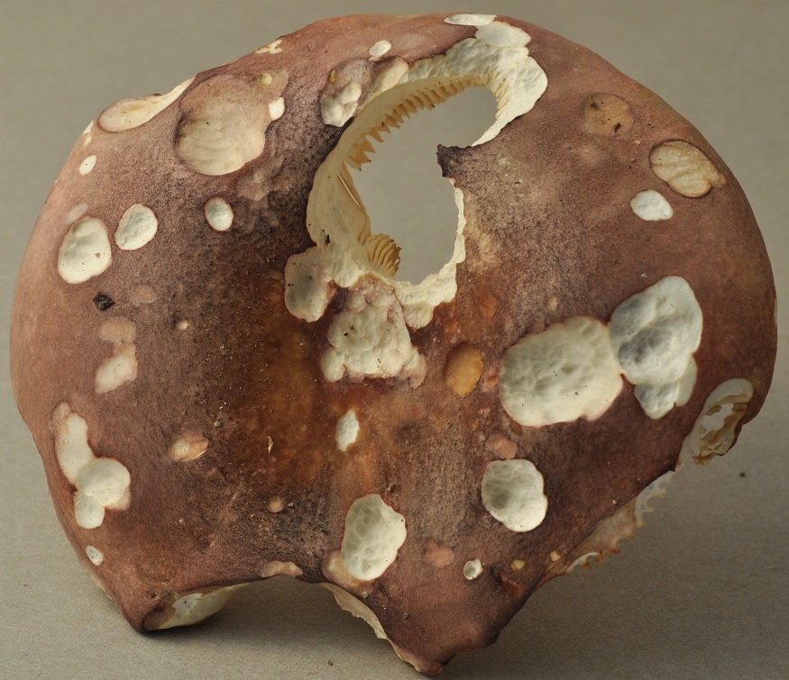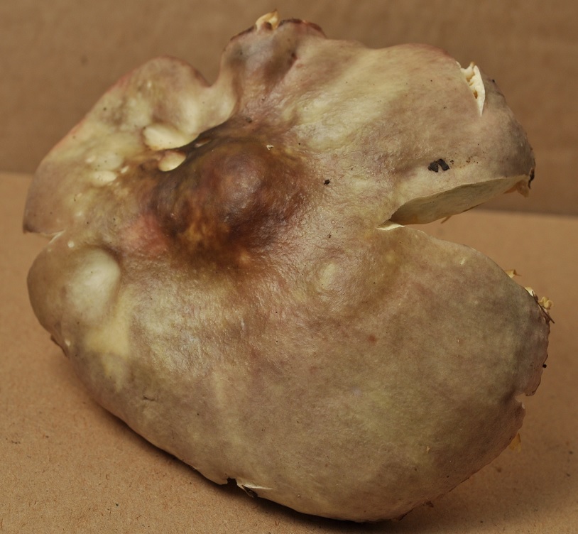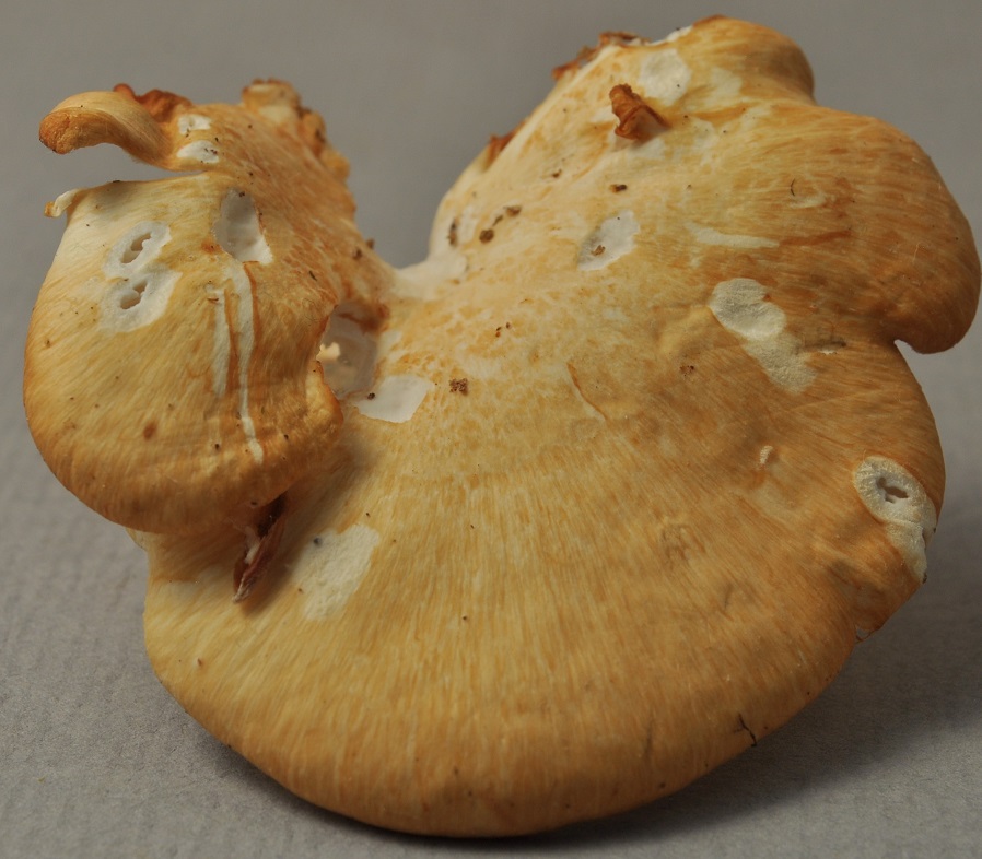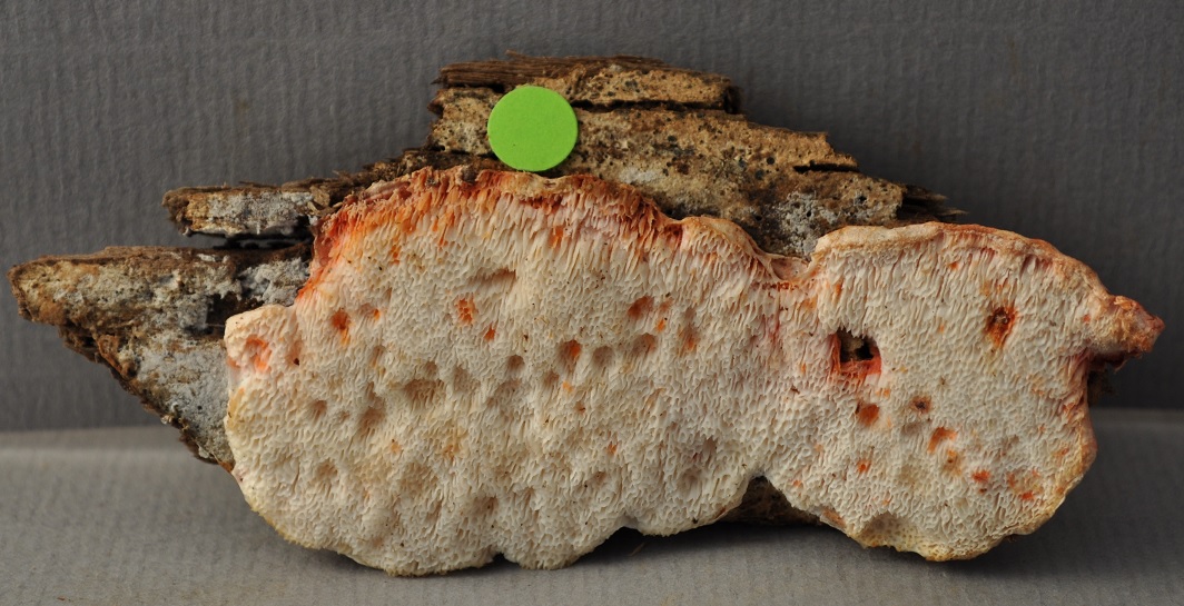 dessous, CD-F6 11/12. Chapeau blanchâtre, taché de rougeâtre, cuticule détachable. Stipe blanc, cylindrique, un peu rétrécit et courbé en bas. Lames blanches, fourchues, denses, anastomosées localement, avec lamellules. Odeur fruitée, agréable. Saveur douce (chair, lames). Gaiac S0 L0 C0, Fe pâle orange.