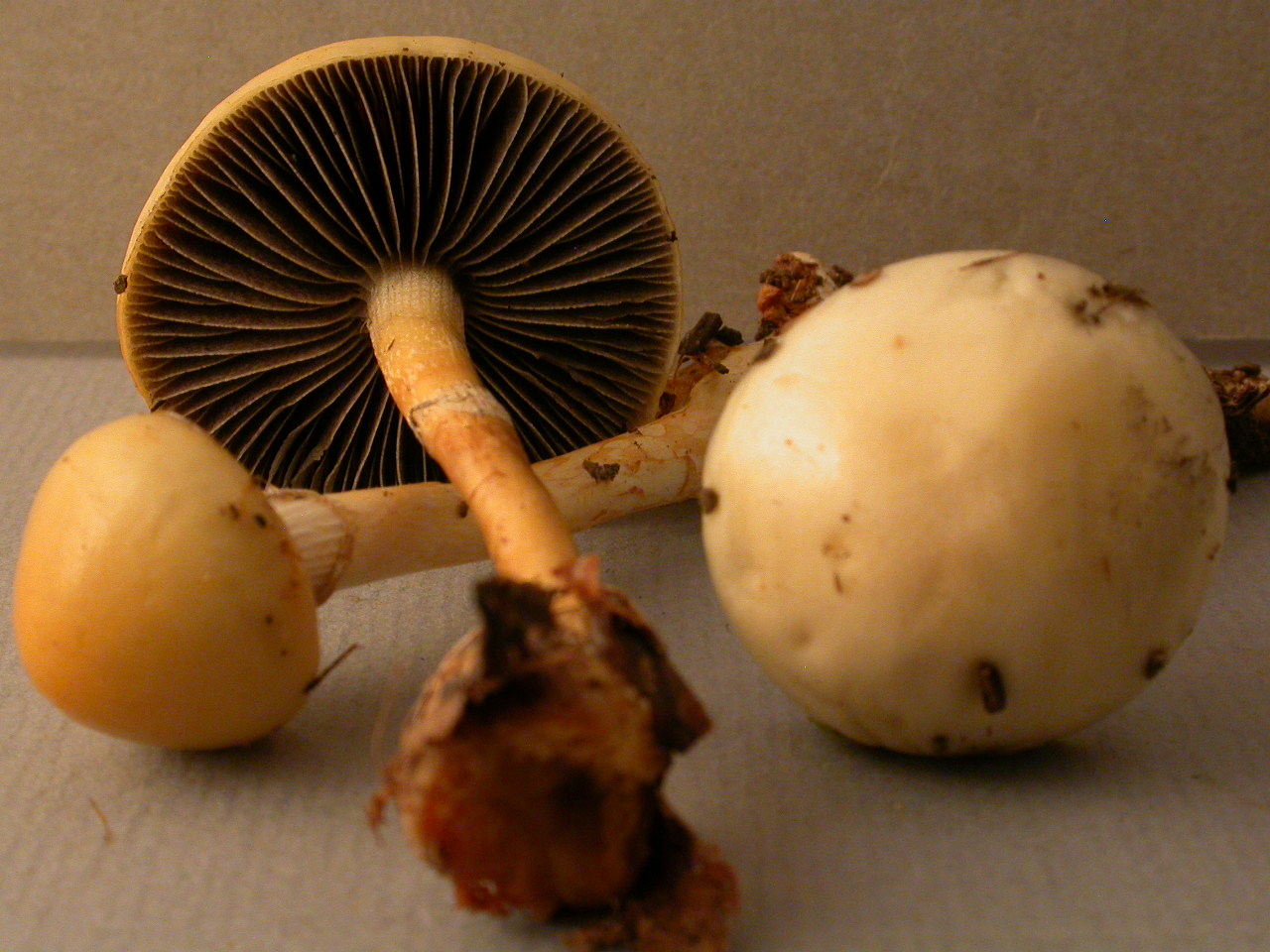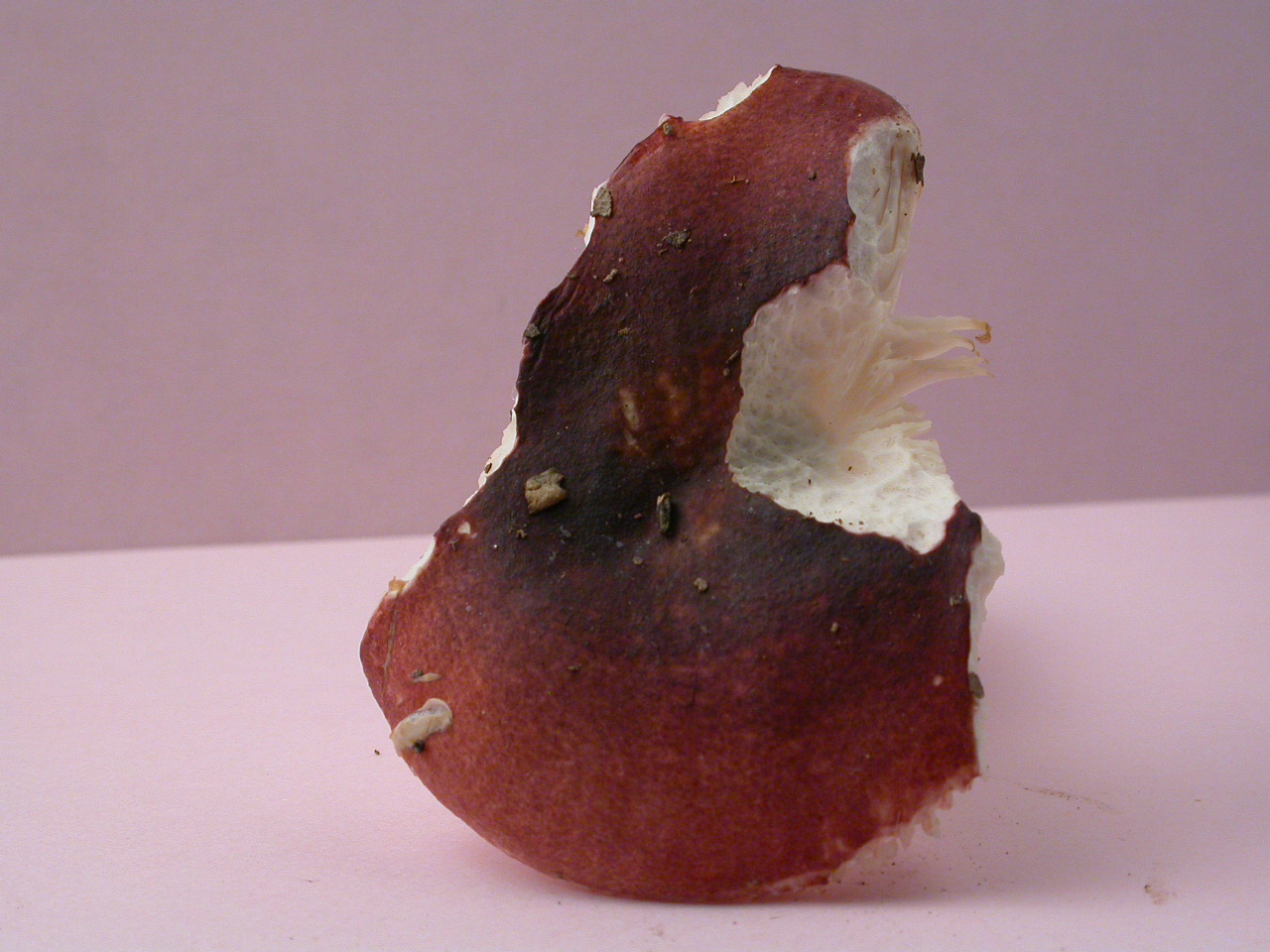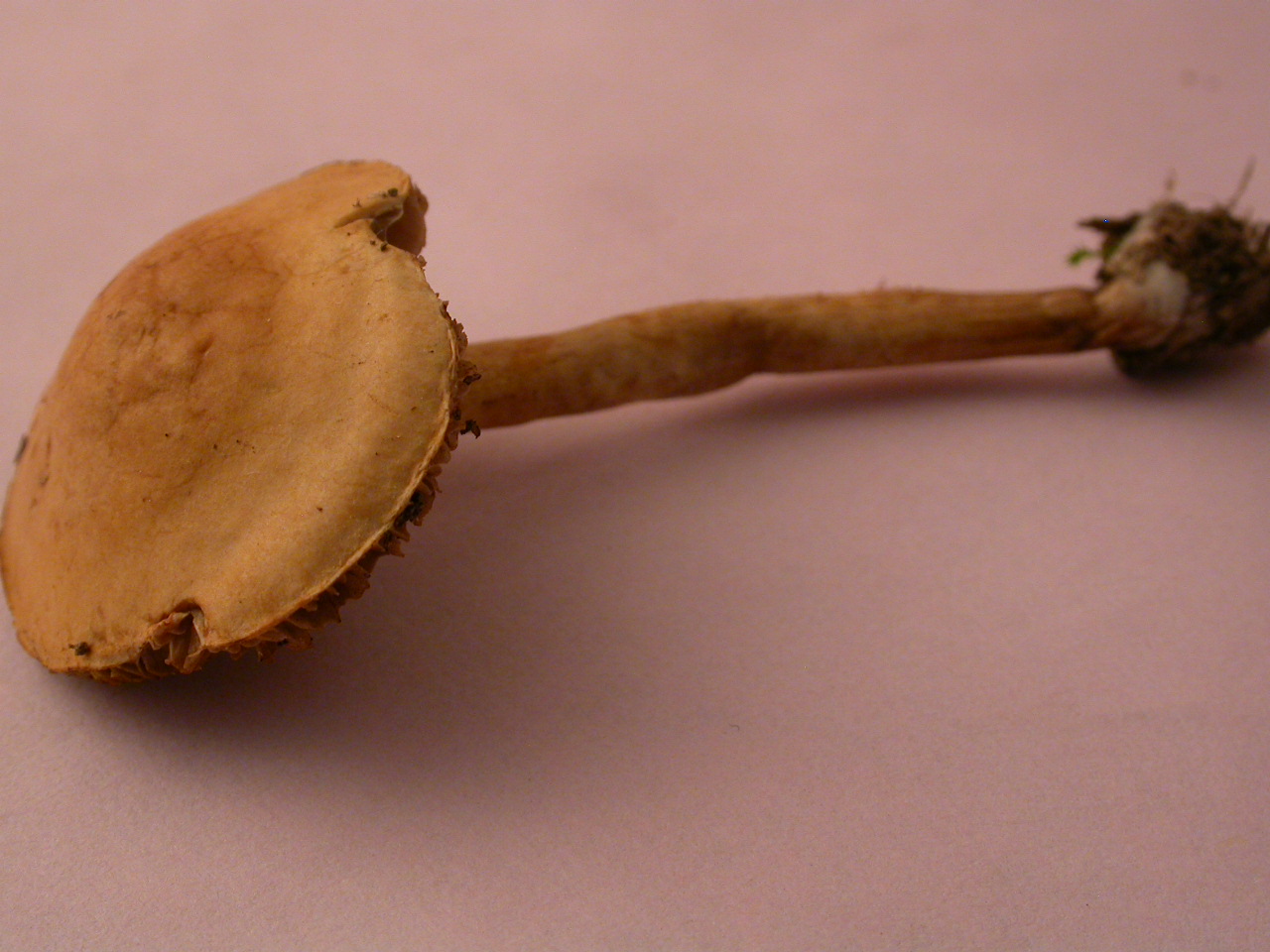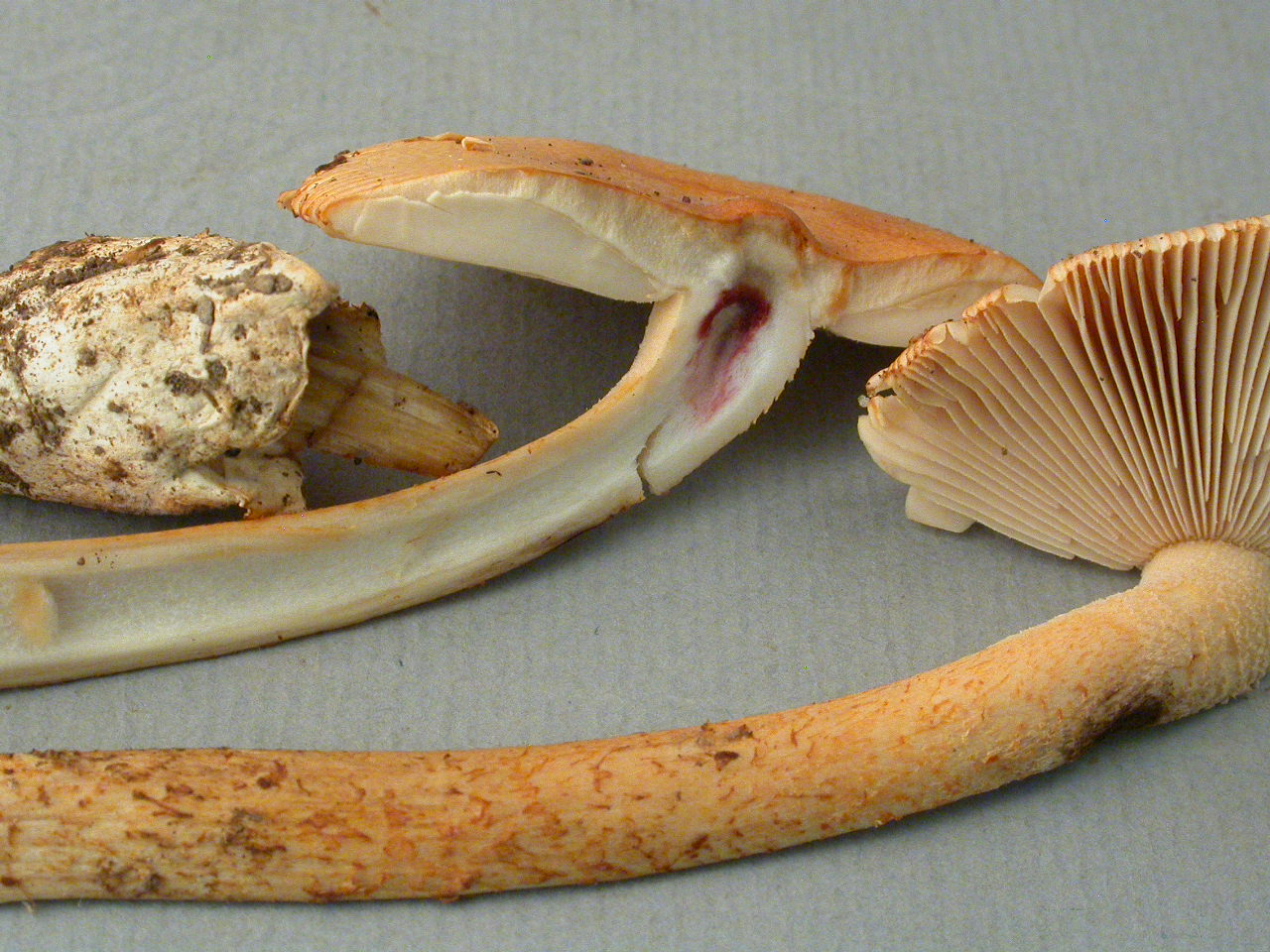 photo, CD7-6 3. Chapeau mamelonné, lames nettement jaunes, fimbriées, stipe chiné sauf à l'apex, tomenteux en haut (s.l), volve sans orange à l'extérieur comme à l'intérieur. Phénol rouge groseille (chair haut du stipe, 5').