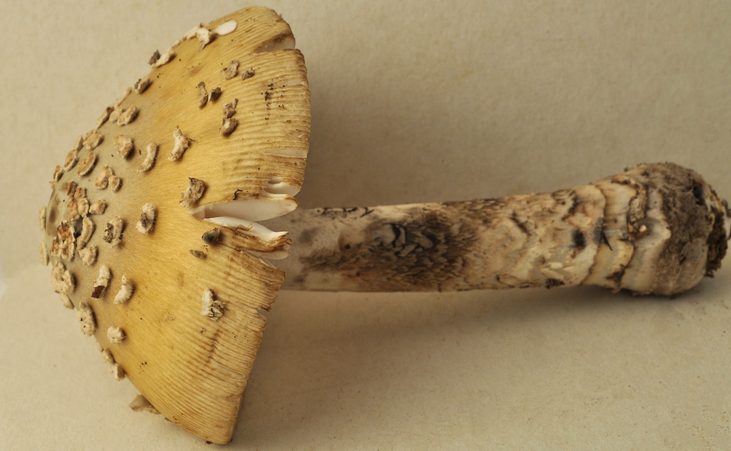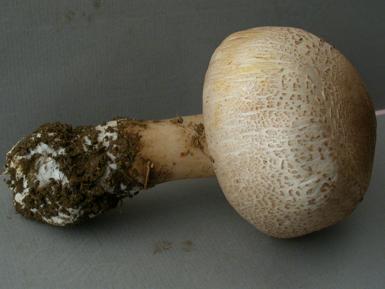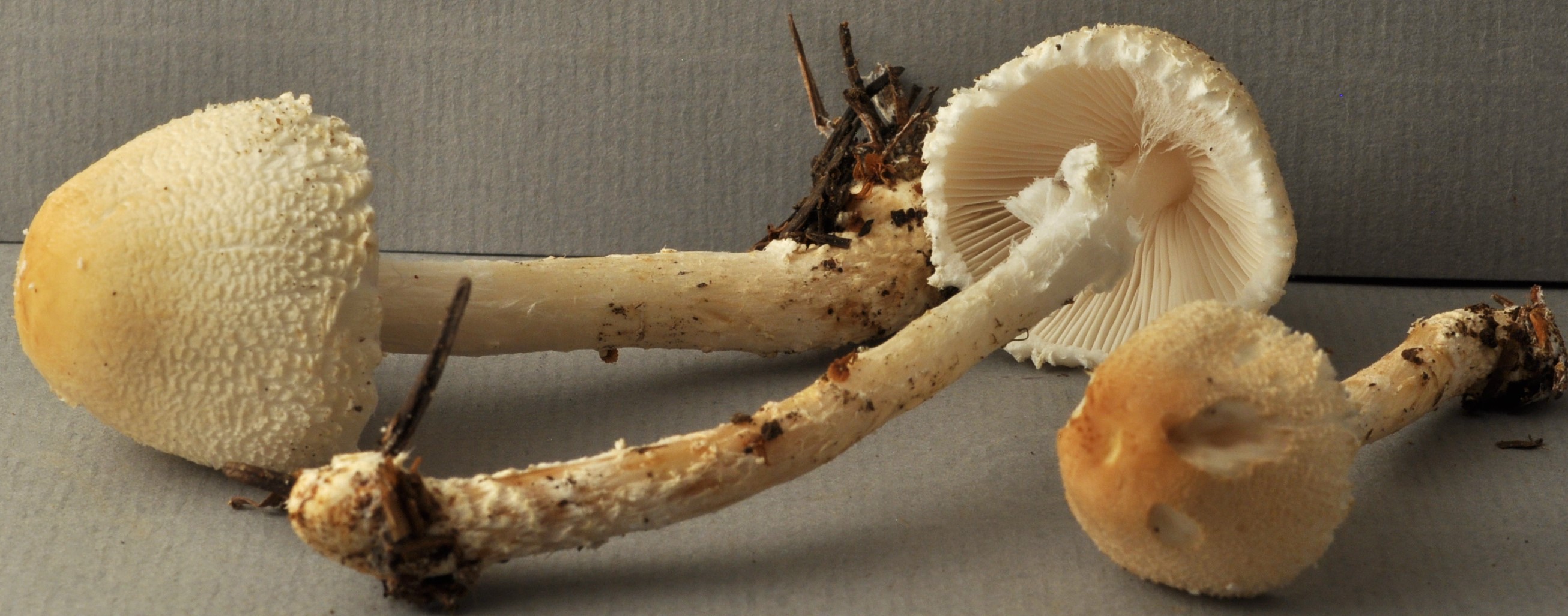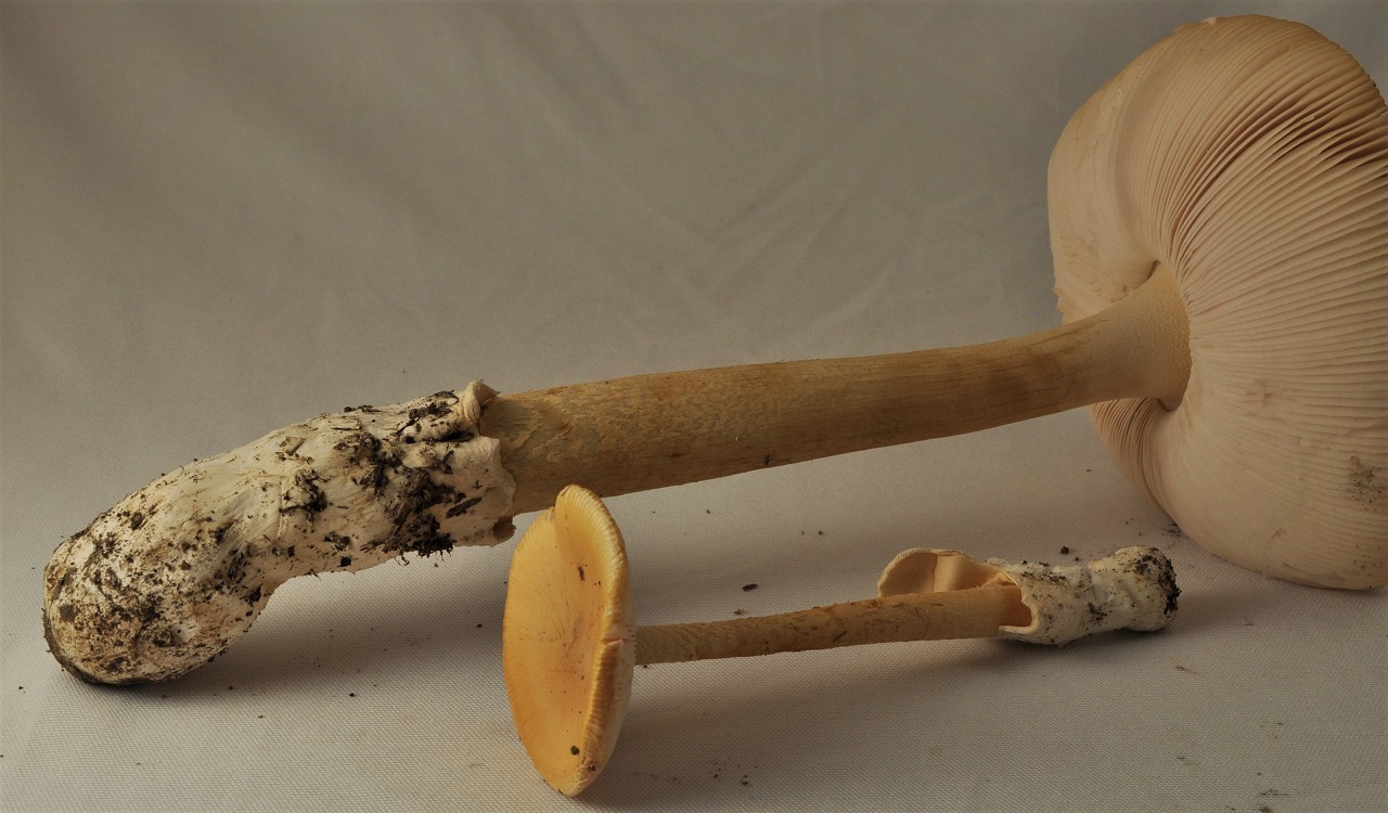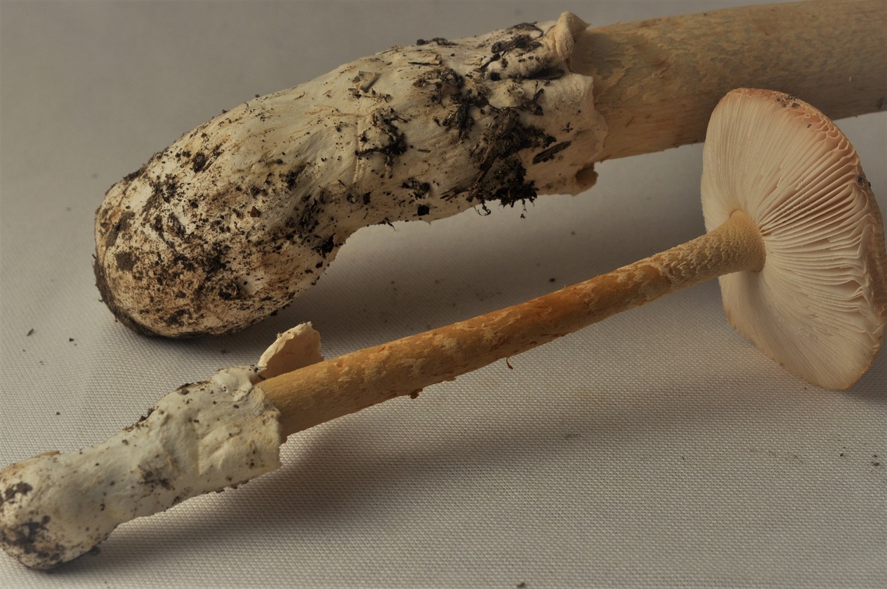 photo, CD7-6 3. Chapeau mamelonné, lames nettement jaunes, fimbriées, stipe chiné sauf à l'apex, tomenteux en haut (s.l), volve sans orange à l'extérieur comme à l'intérieur. Phénol rouge groseille (chair haut du stipe, 5').