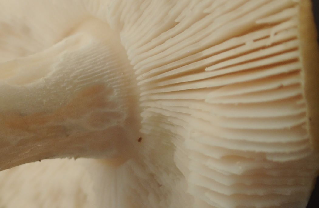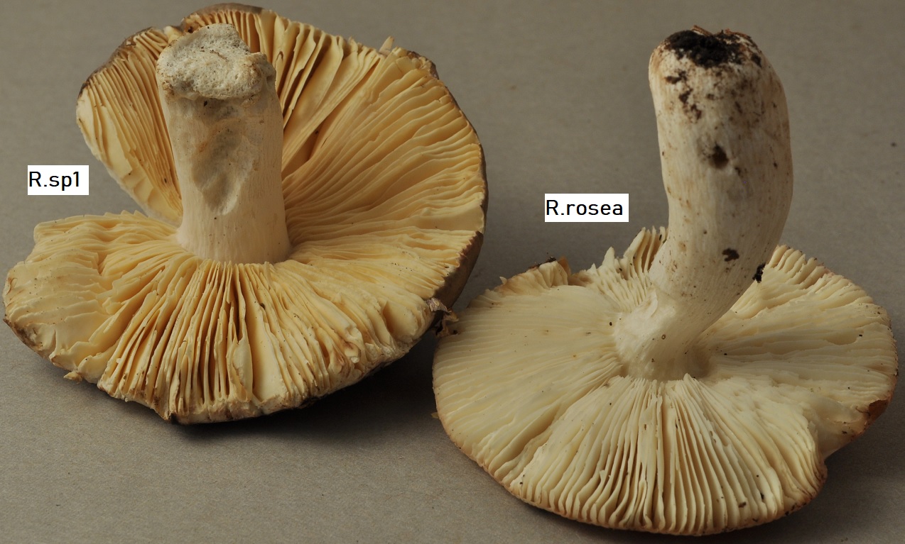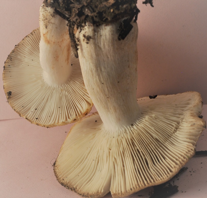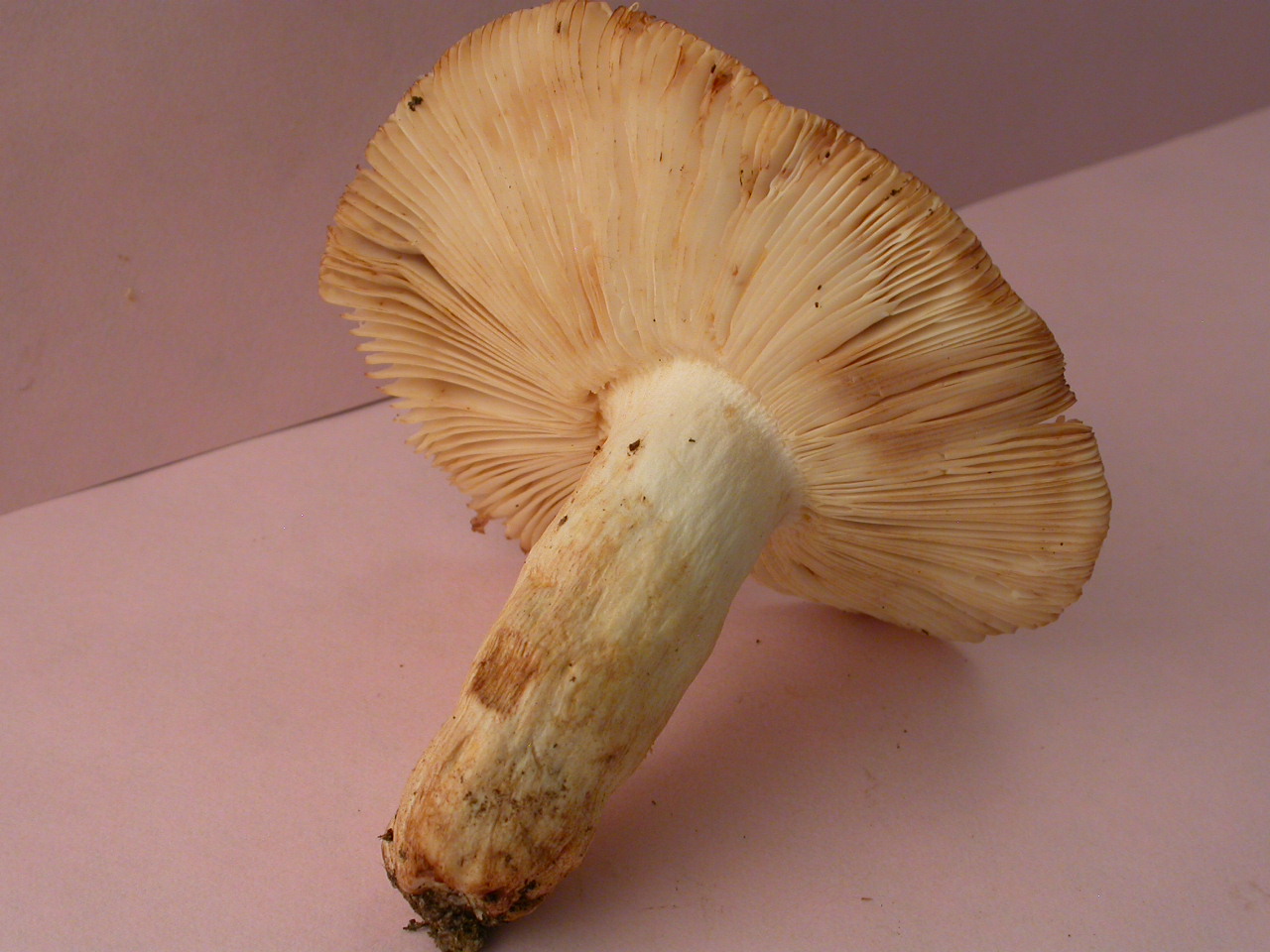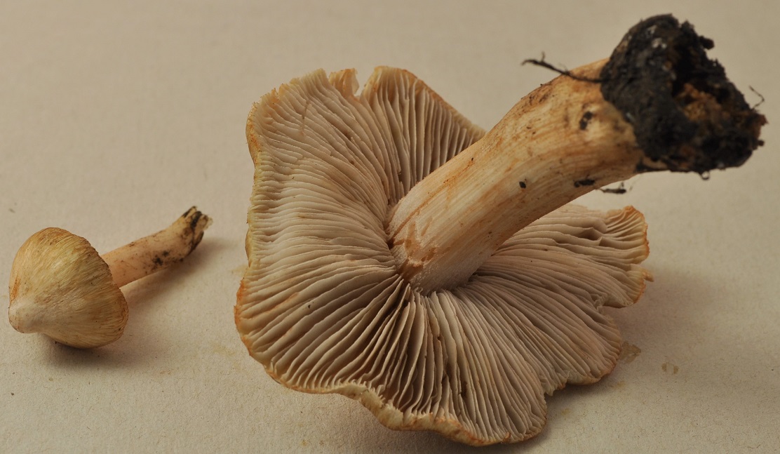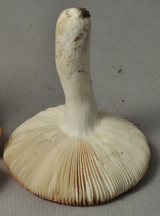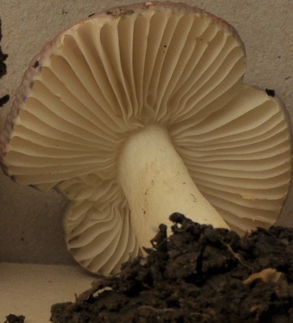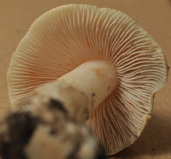 dessous, CD8-F11 3/4. Chapeau rose jambon, marge courtement et légèrement cannelée. Stipe blanc, dur, pointu-recourbé en bas. Lames crèmes (Rom-267 OK), régulières, en U, 8-9 au bord, épaisses, fourchues (à partir de R/2), non anastomosées.