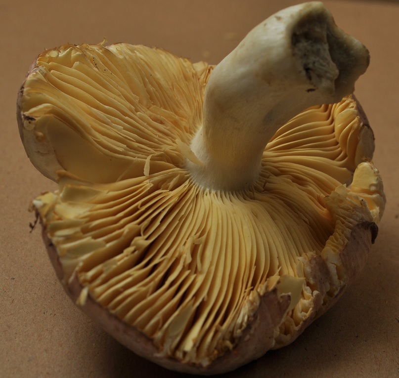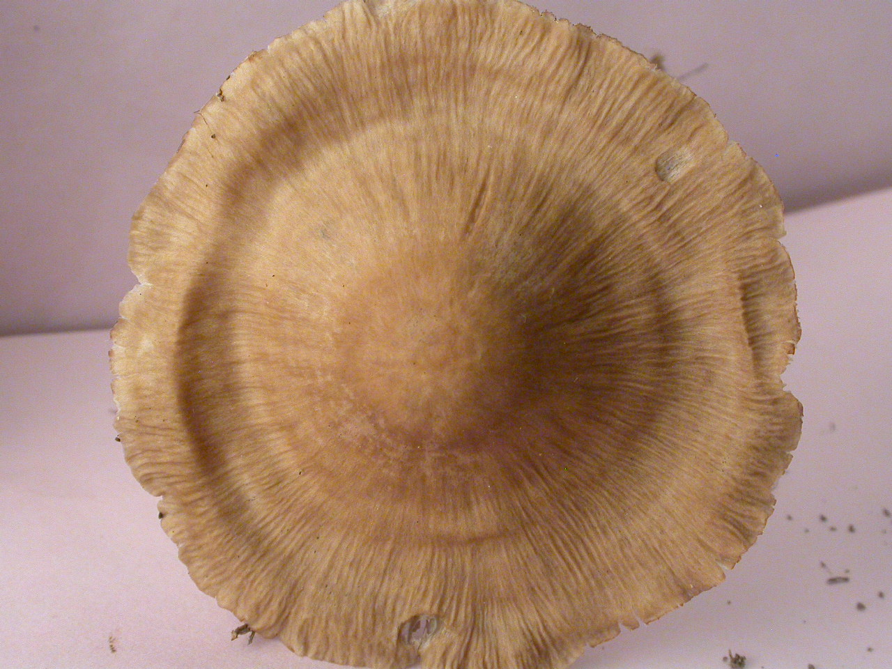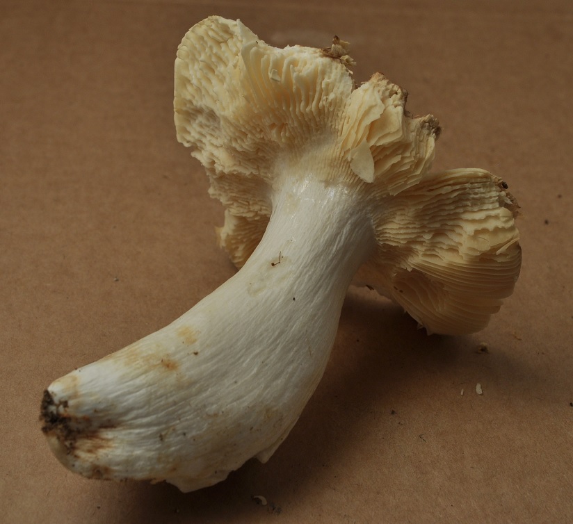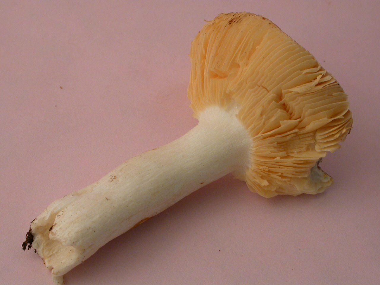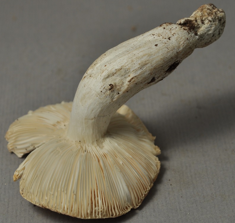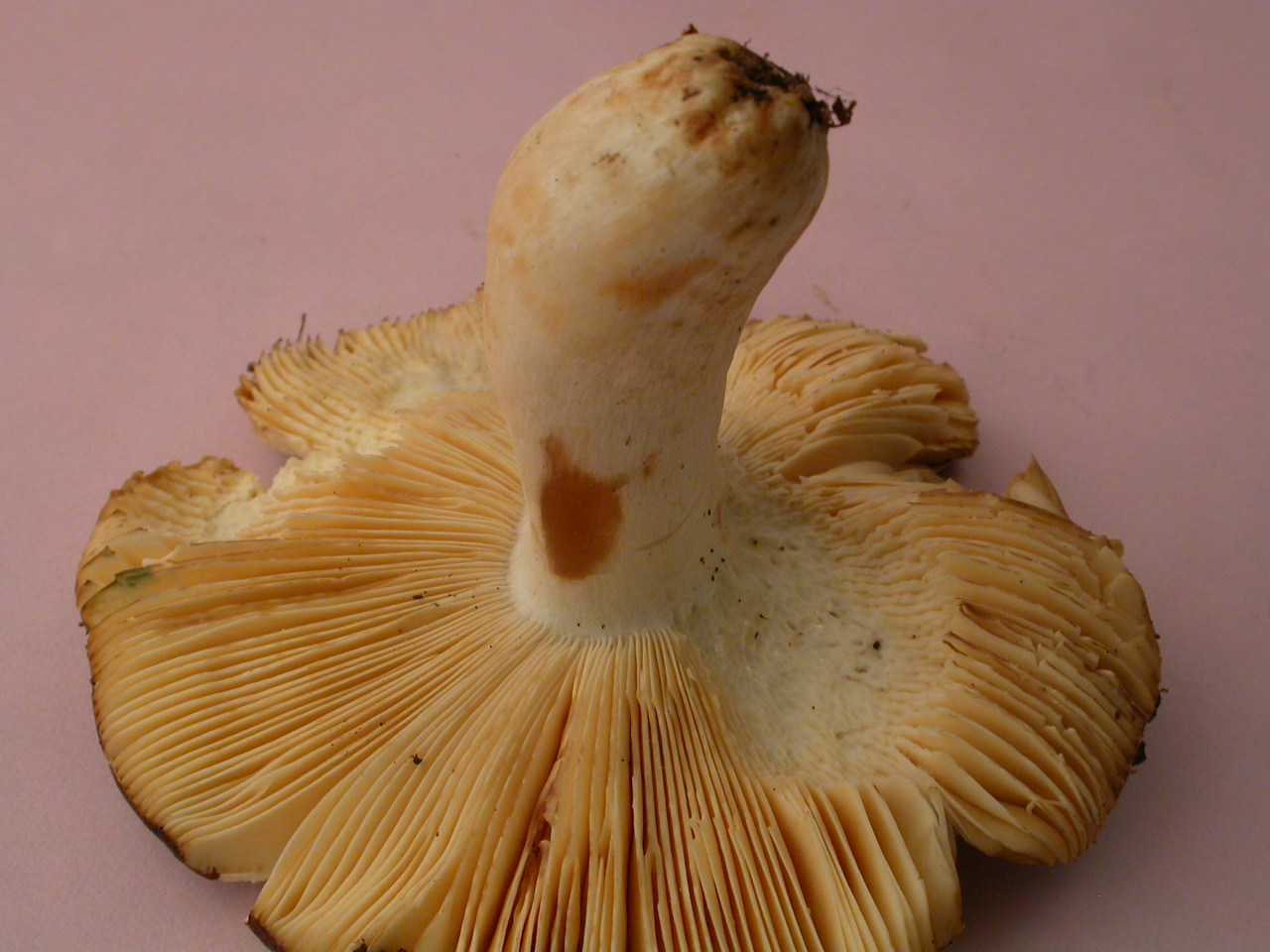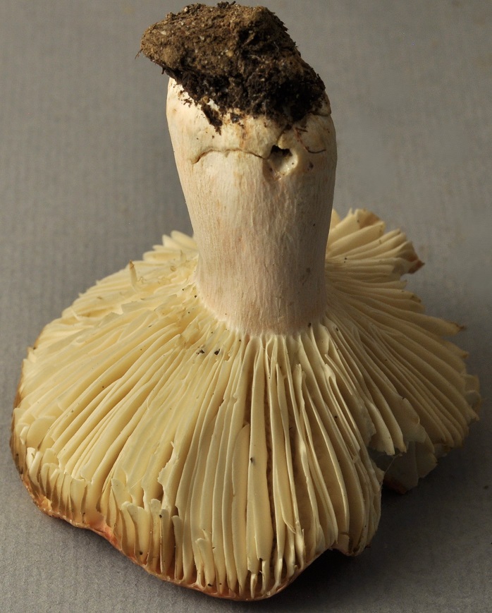 dessous, CD8-F11 3/4. Chapeau rose jambon, marge courtement et légèrement cannelée. Stipe blanc, dur, pointu-recourbé en bas. Lames crèmes (Rom-267 OK), régulières, en U, 8-9 au bord, épaisses, fourchues (à partir de R/2), non anastomosées.