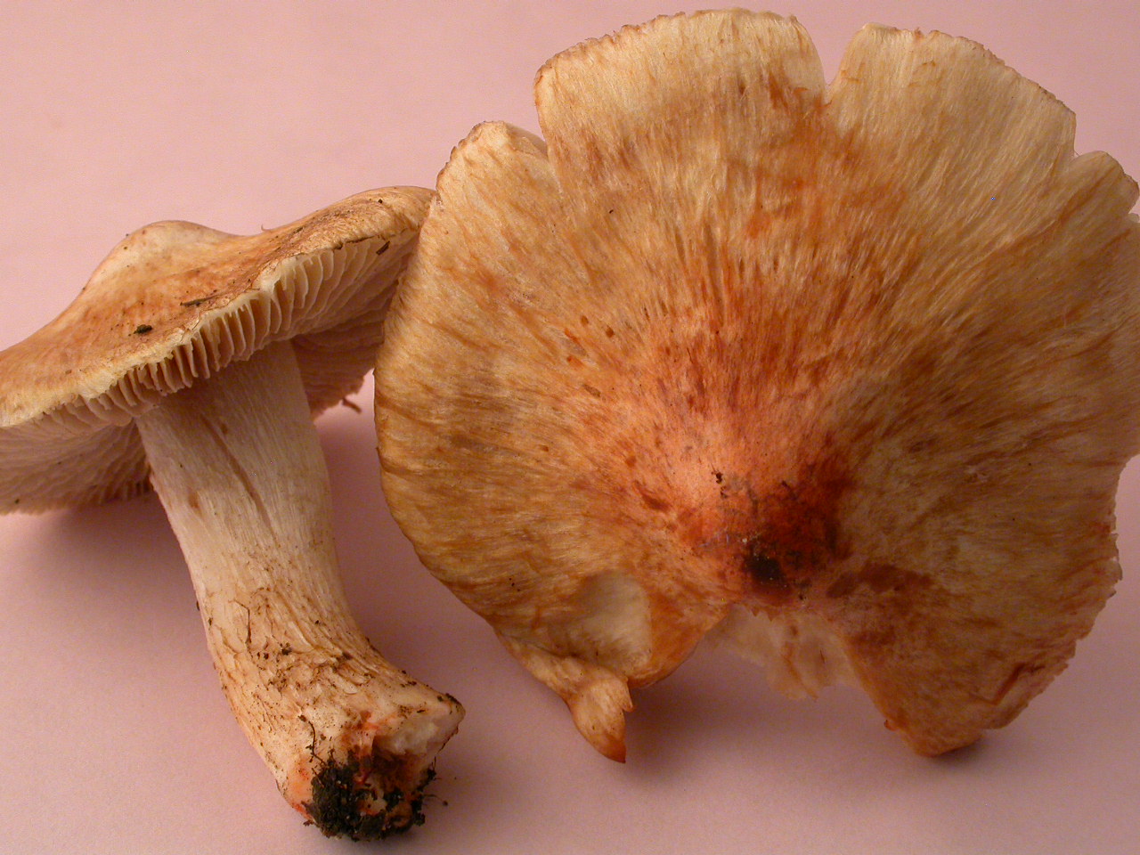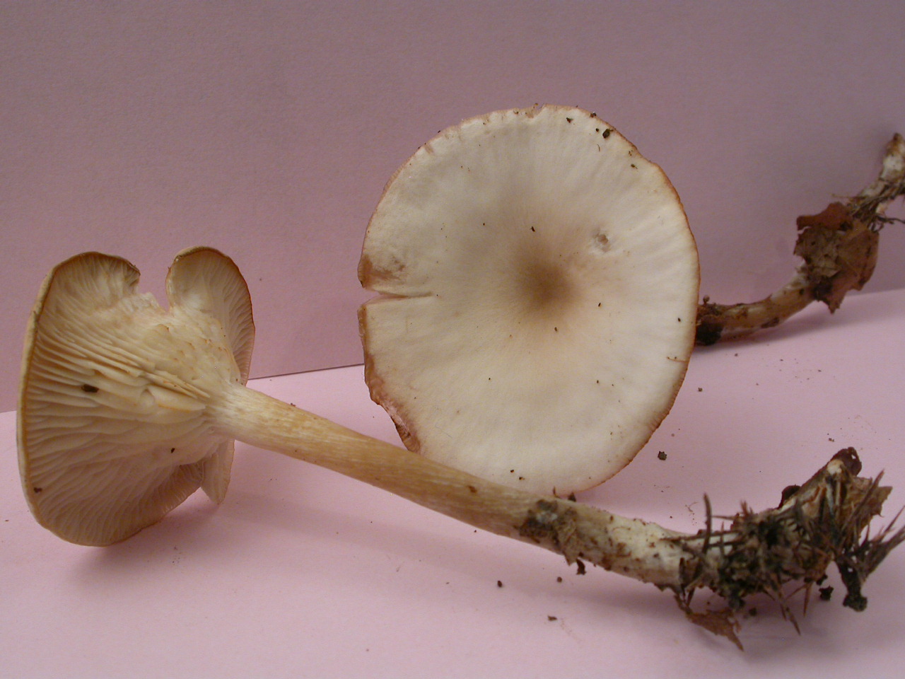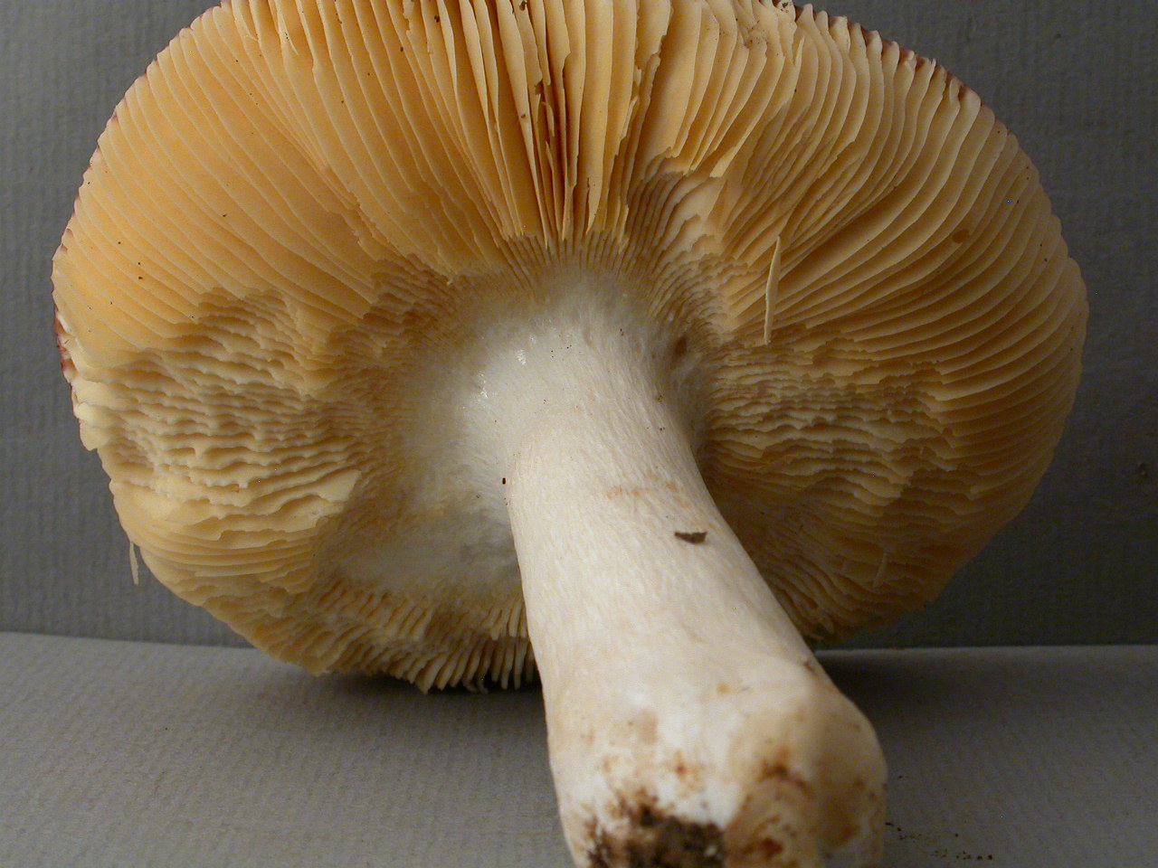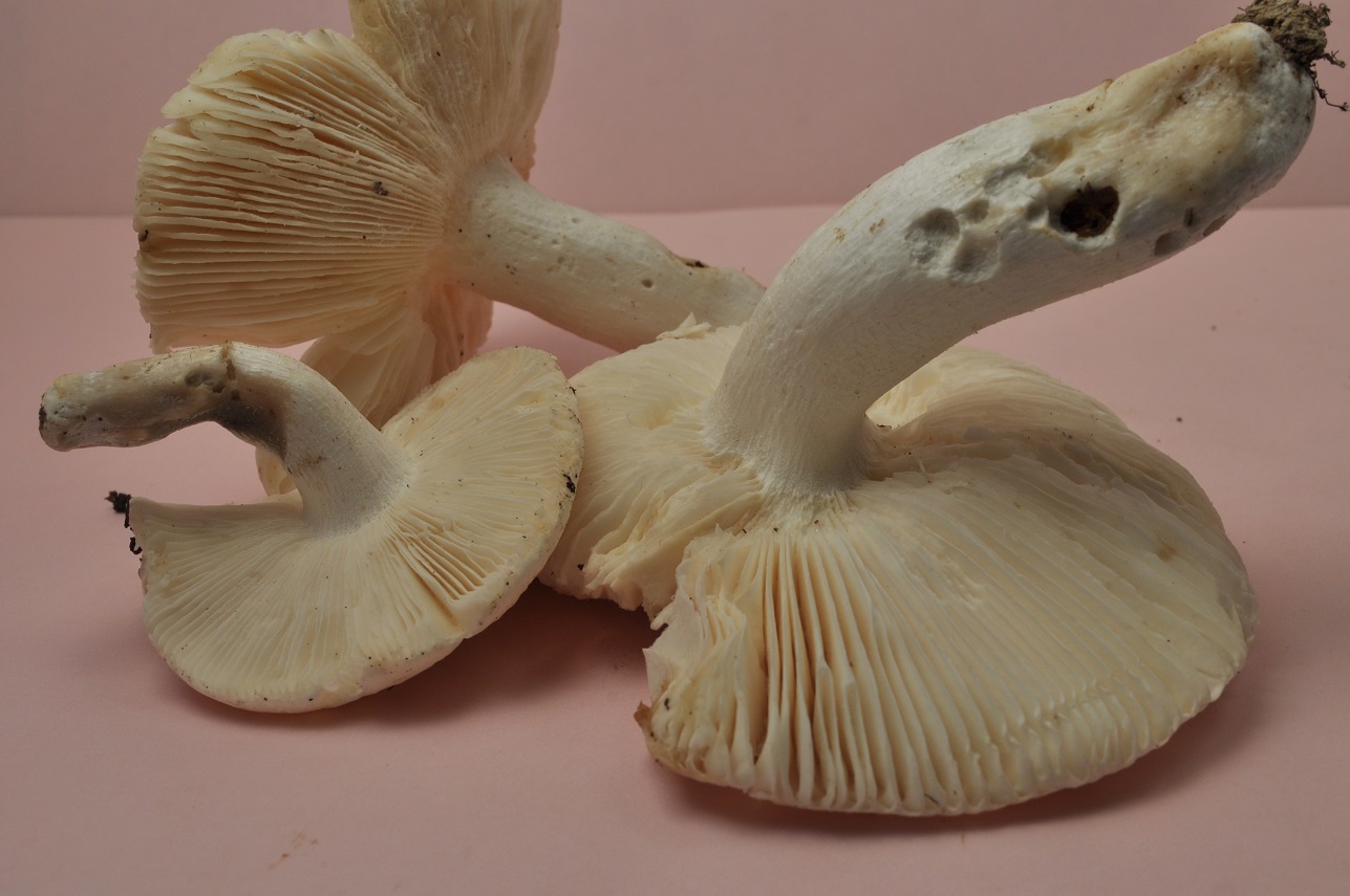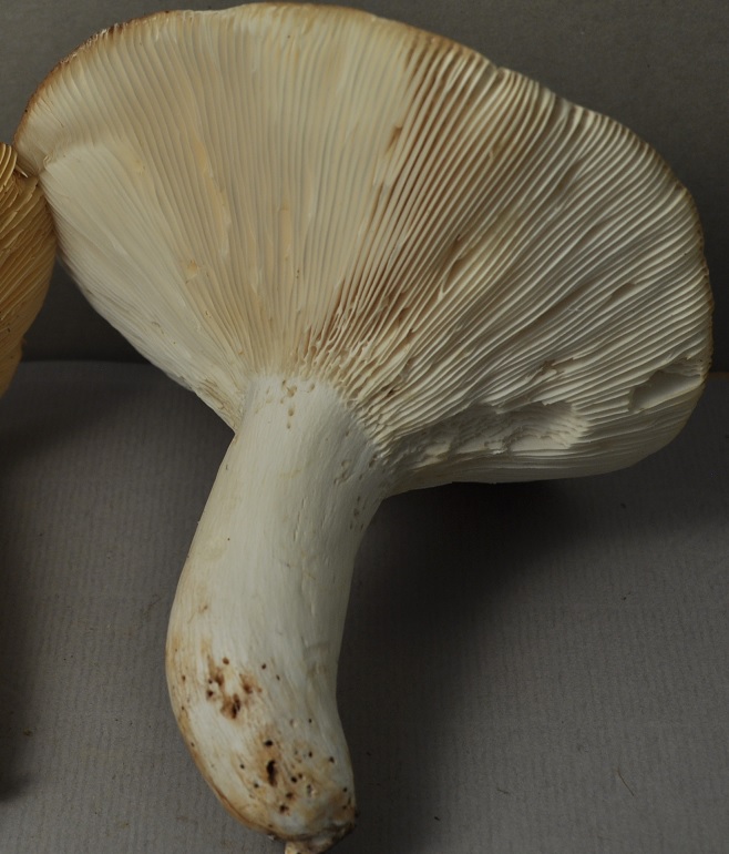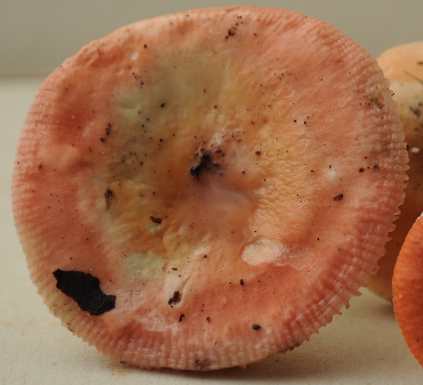 dessous, CD8-F11 3/4. Chapeau rose jambon, marge courtement et légèrement cannelée. Stipe blanc, dur, pointu-recourbé en bas. Lames crèmes (Rom-267 OK), régulières, en U, 8-9 au bord, épaisses, fourchues (à partir de R/2), non anastomosées.