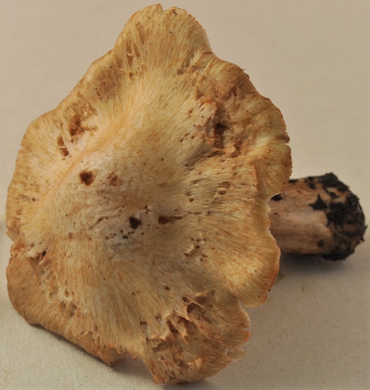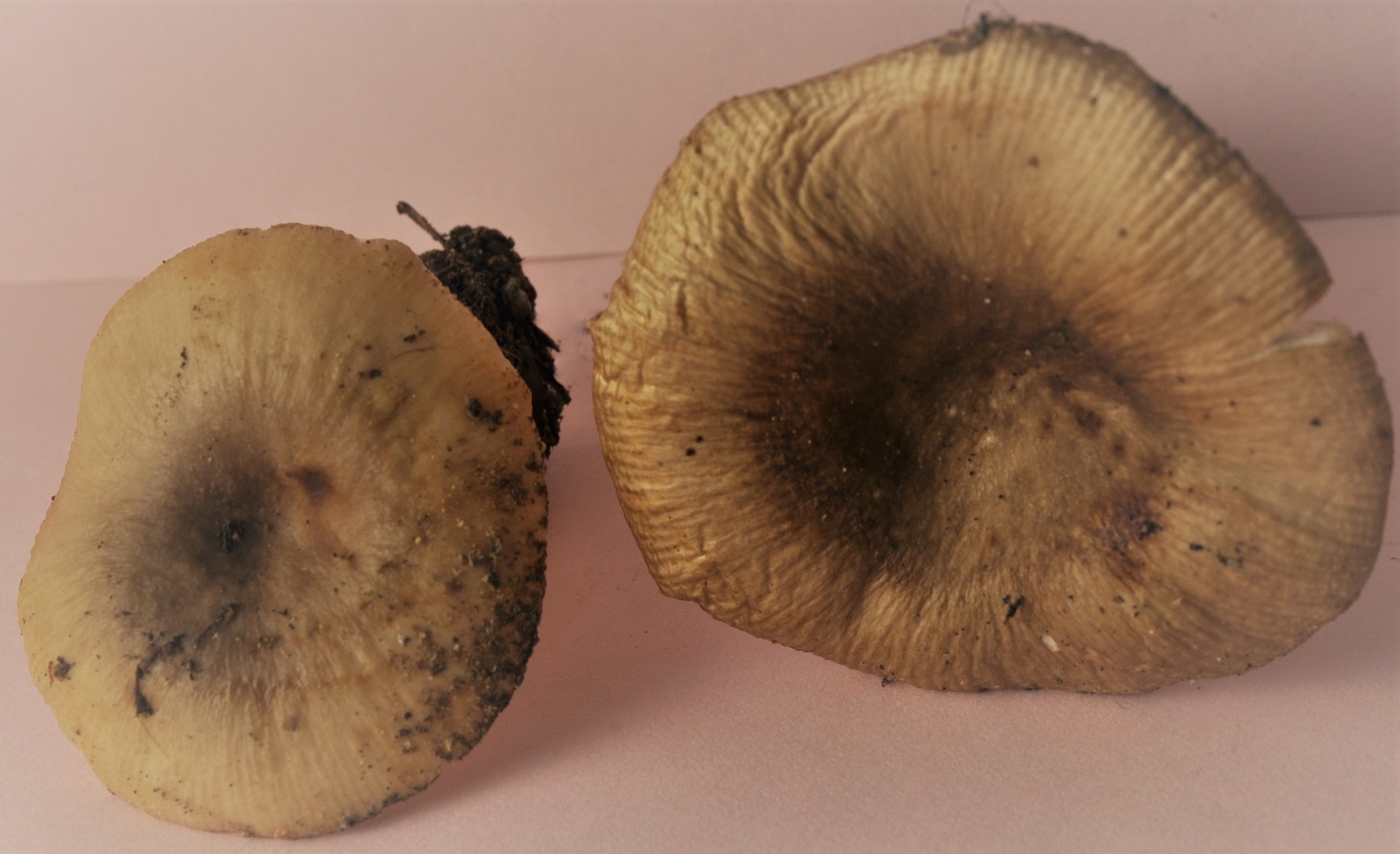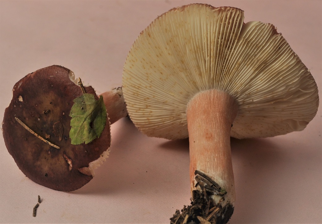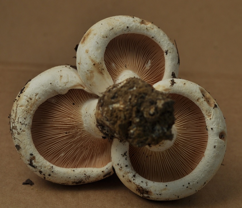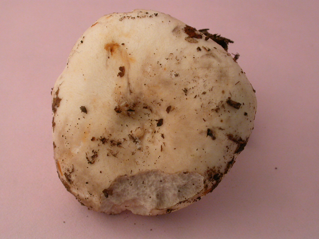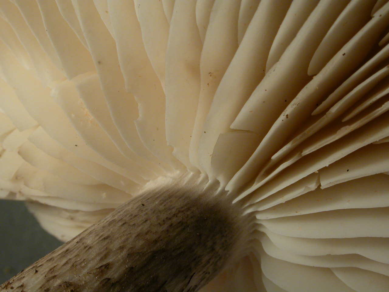 dessous, CD8-F11 3/4. Chapeau rose jambon, marge courtement et légèrement cannelée. Stipe blanc, dur, pointu-recourbé en bas. Lames crèmes (Rom-267 OK), régulières, en U, 8-9 au bord, épaisses, fourchues (à partir de R/2), non anastomosées.