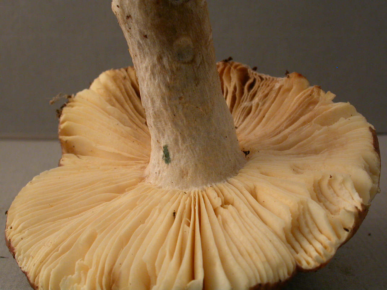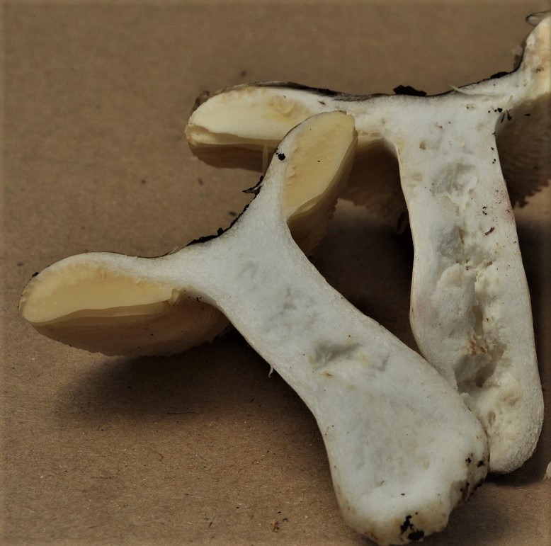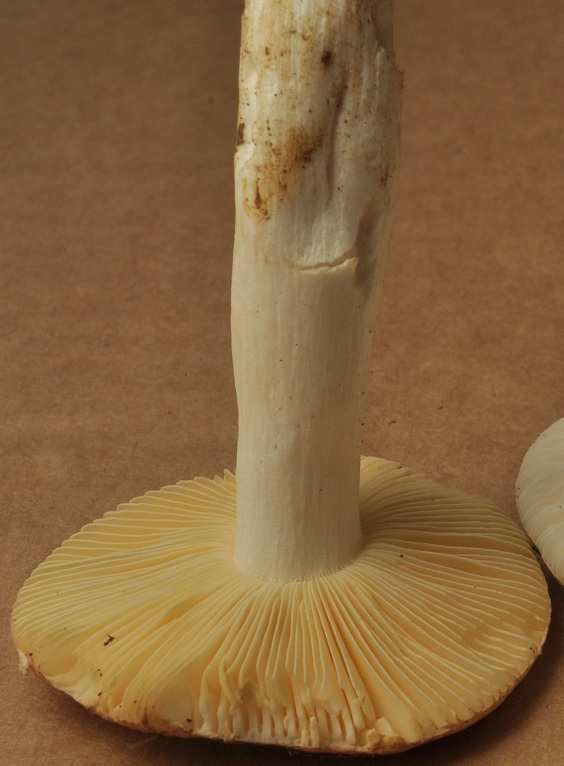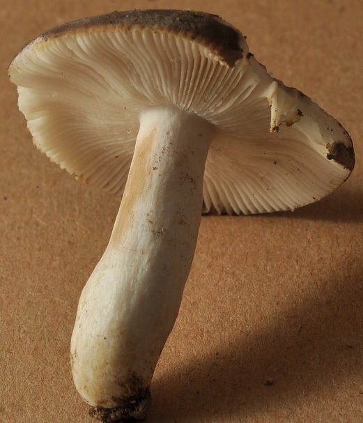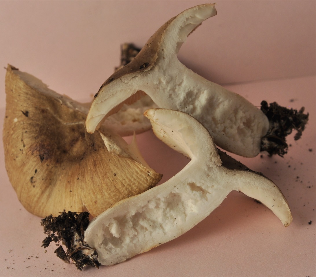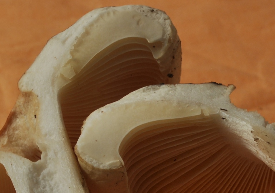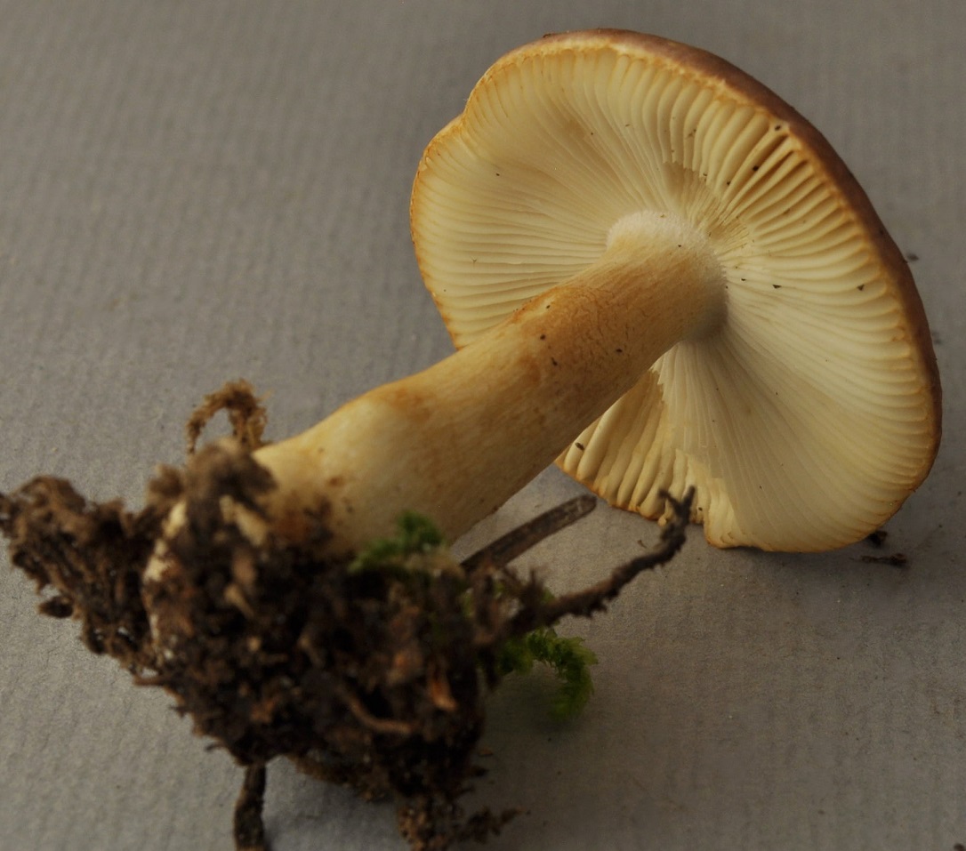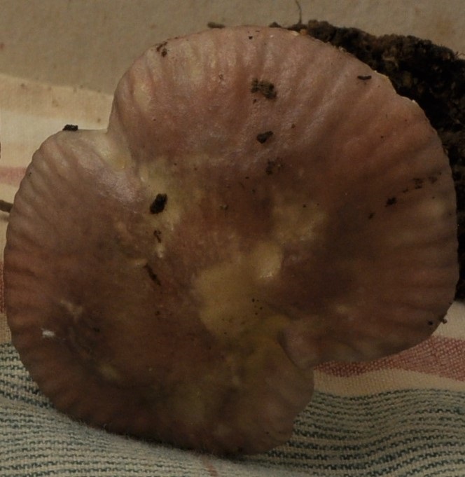 dessous, CD8-F11 3/4. Chapeau rose jambon, marge courtement et légèrement cannelée. Stipe blanc, dur, pointu-recourbé en bas. Lames crèmes (Rom-267 OK), régulières, en U, 8-9 au bord, épaisses, fourchues (à partir de R/2), non anastomosées.