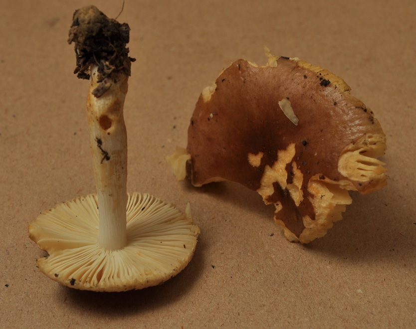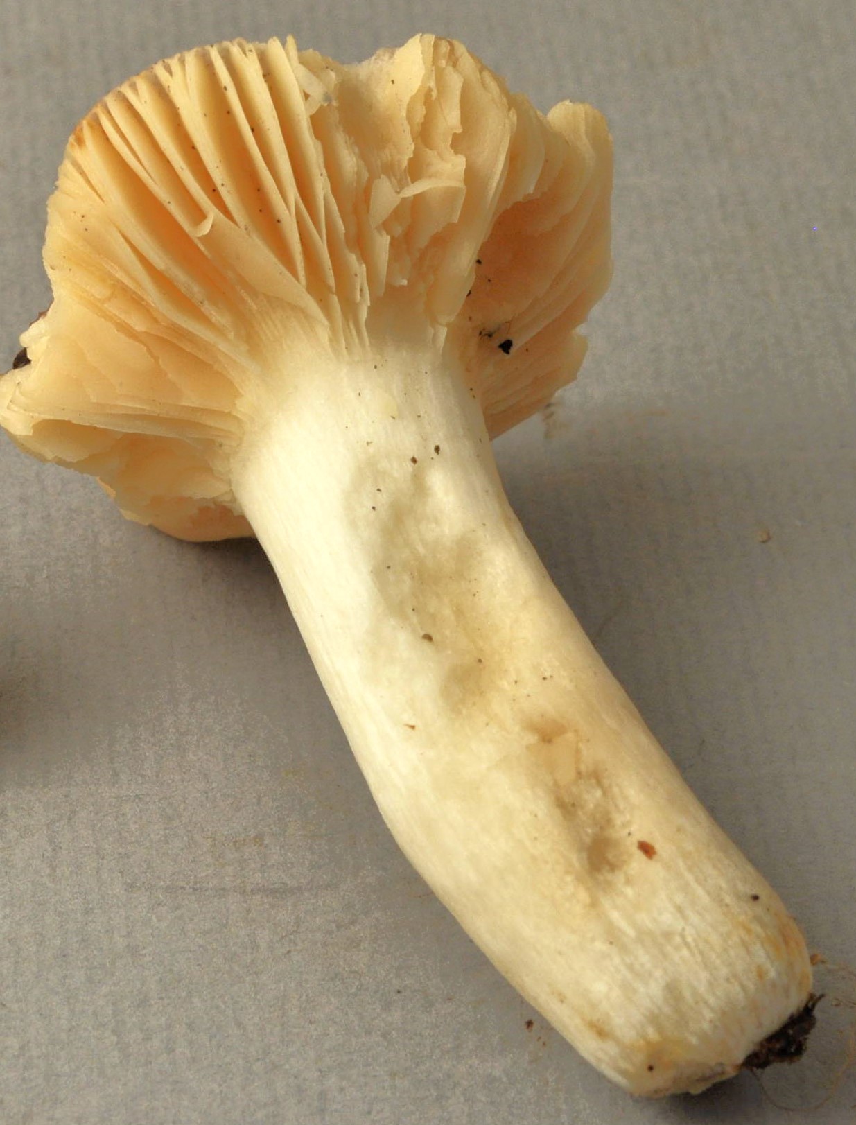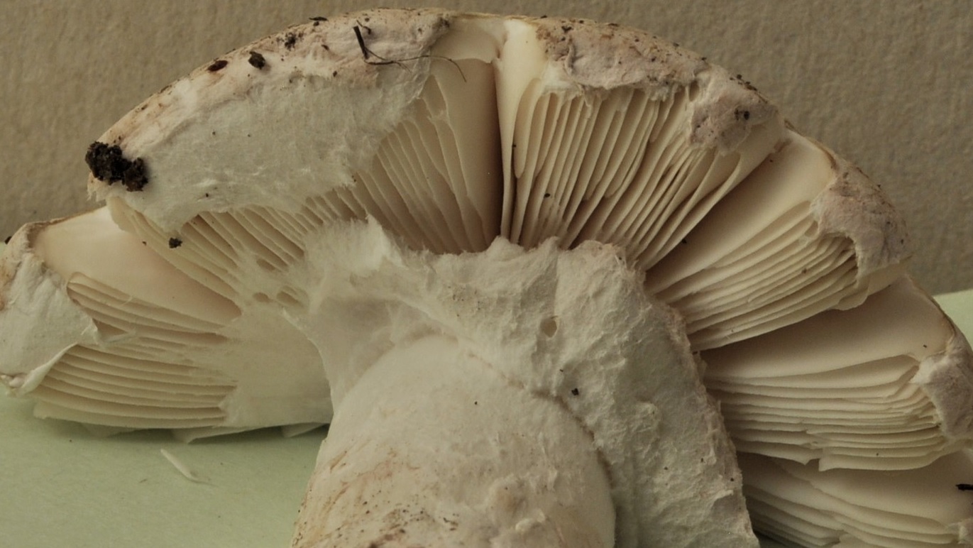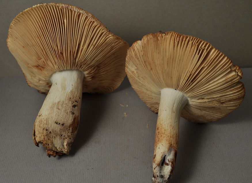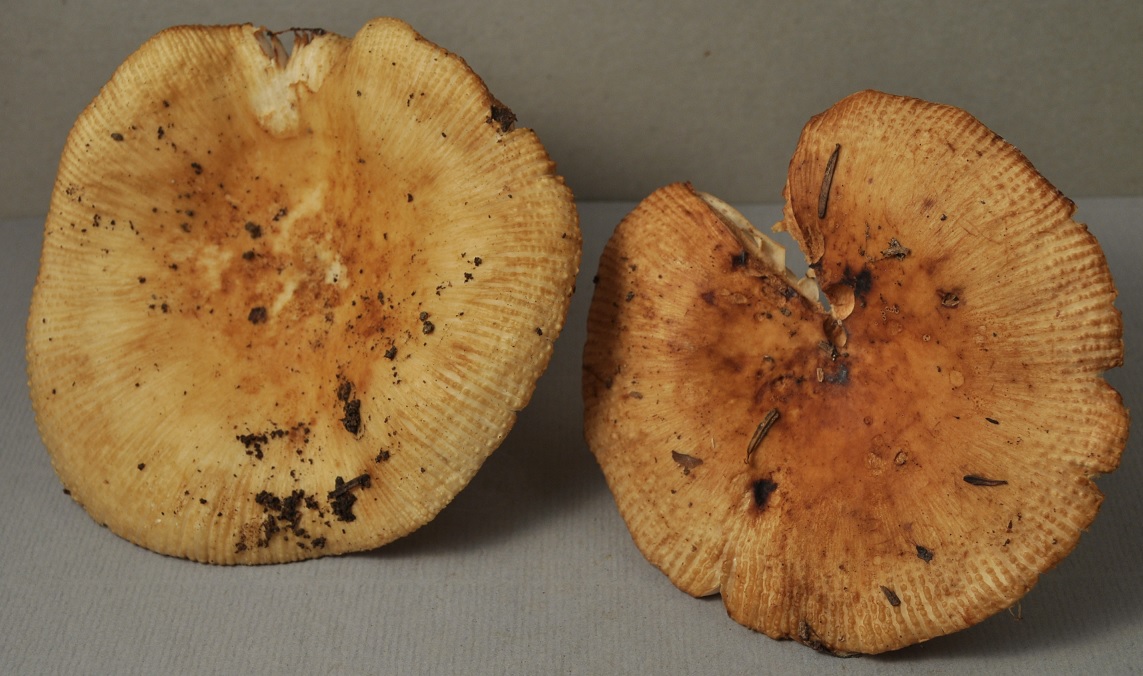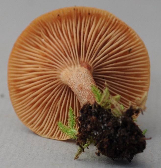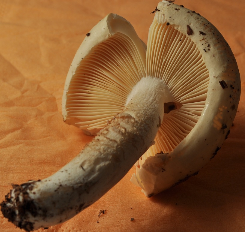 dessous, CD8-F11 3/4. Chapeau rose jambon, marge courtement et légèrement cannelée. Stipe blanc, dur, pointu-recourbé en bas. Lames crèmes (Rom-267 OK), régulières, en U, 8-9 au bord, épaisses, fourchues (à partir de R/2), non anastomosées.