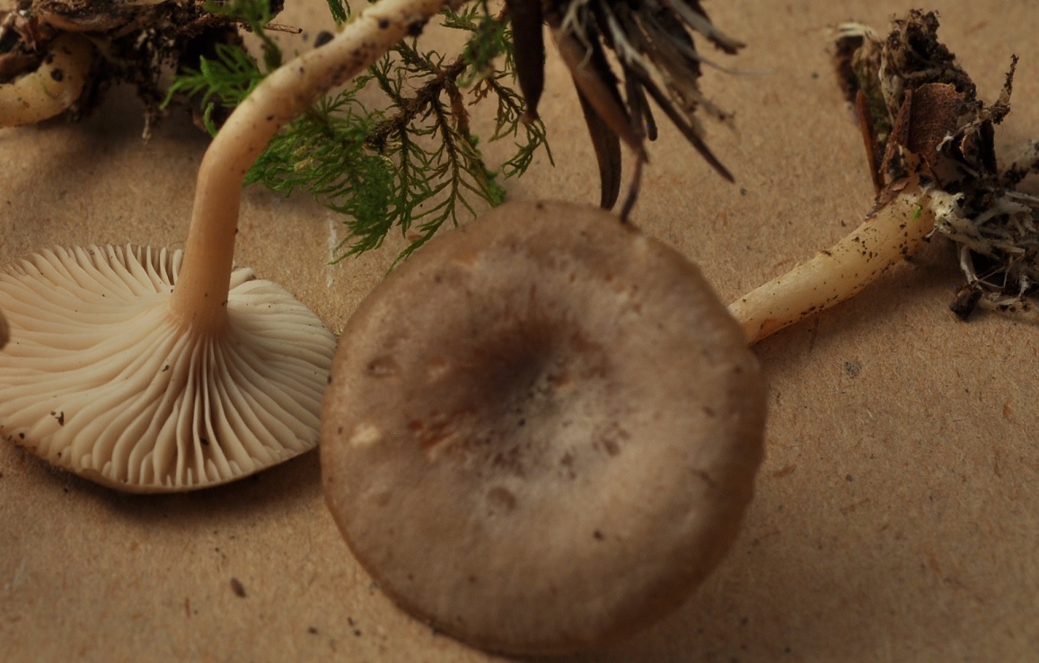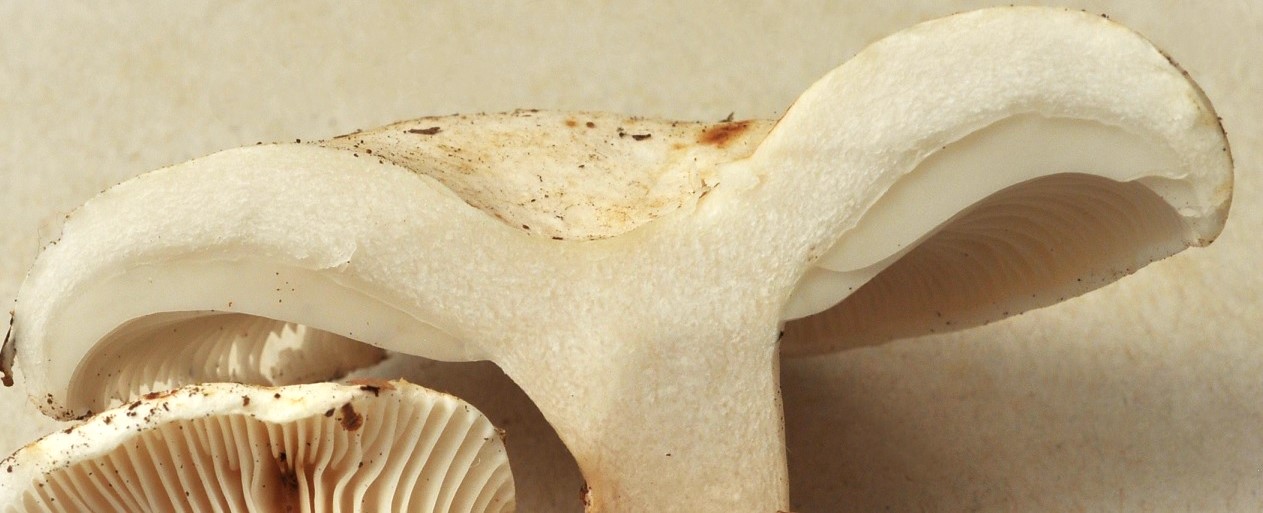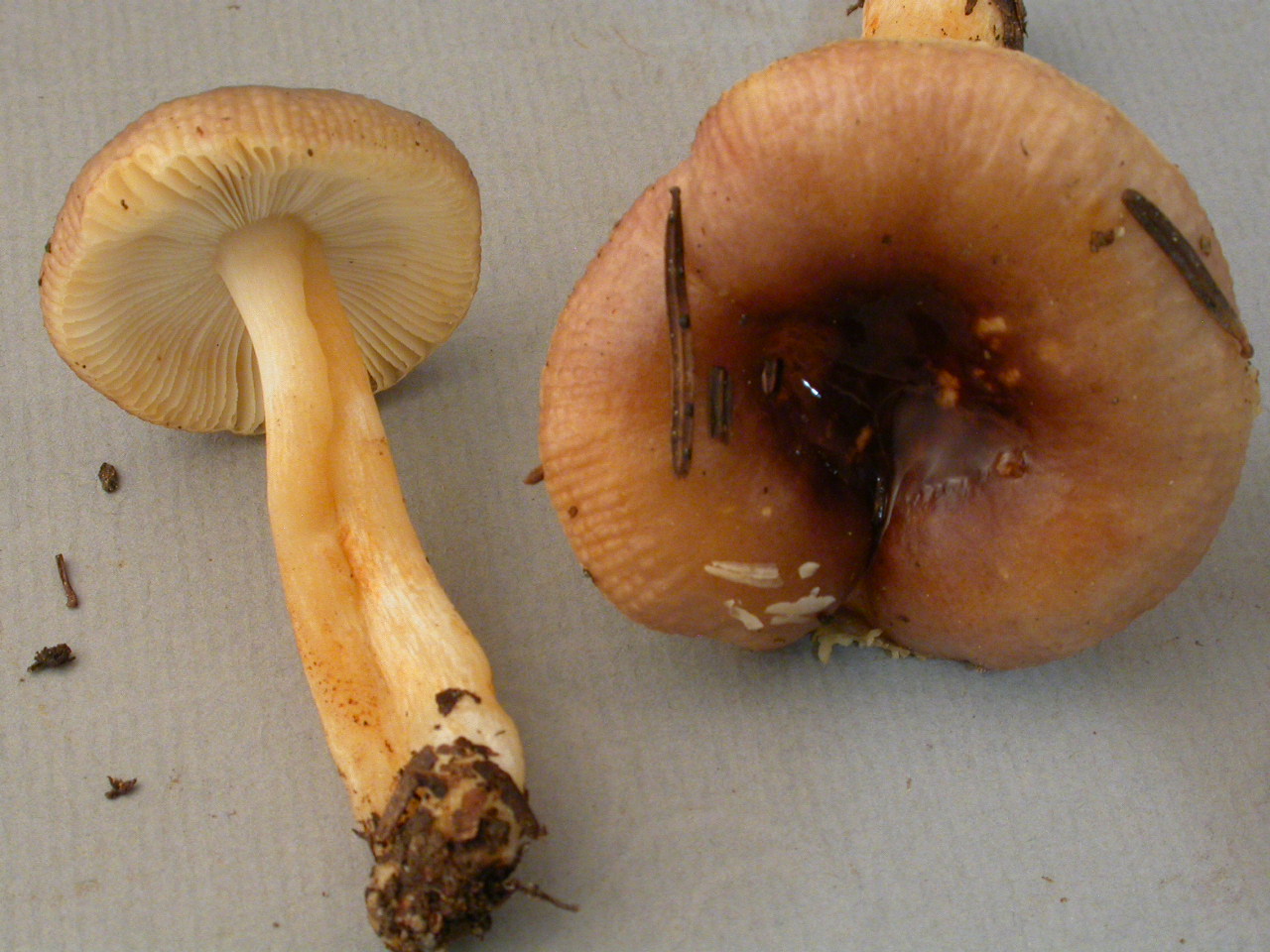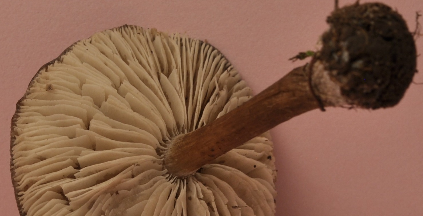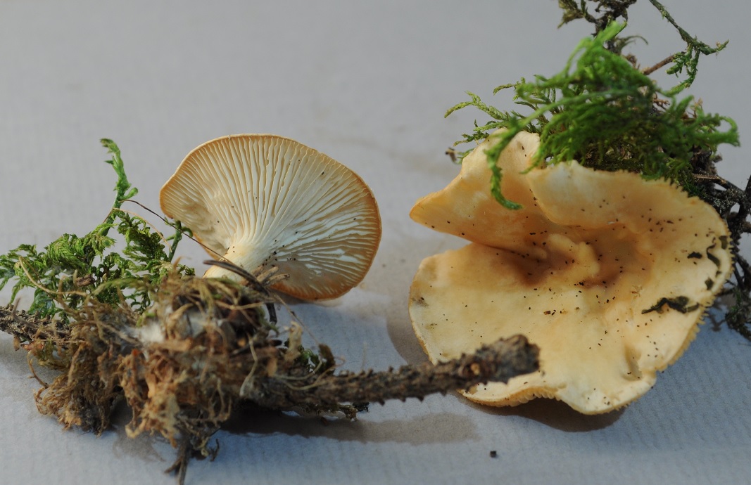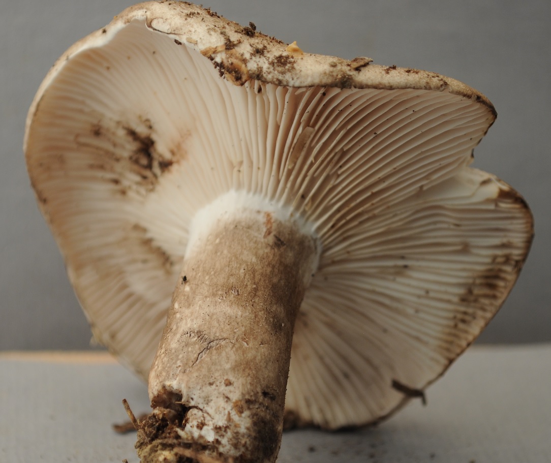 dessous, CD8-F11 3/4. Chapeau rose jambon, marge courtement et légèrement cannelée. Stipe blanc, dur, pointu-recourbé en bas. Lames crèmes (Rom-267 OK), régulières, en U, 8-9 au bord, épaisses, fourchues (à partir de R/2), non anastomosées.