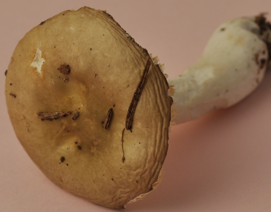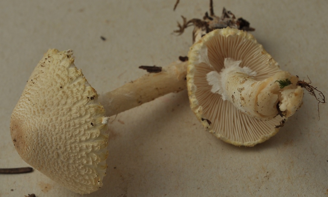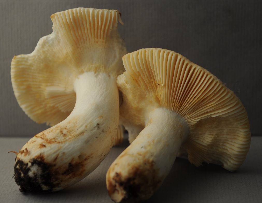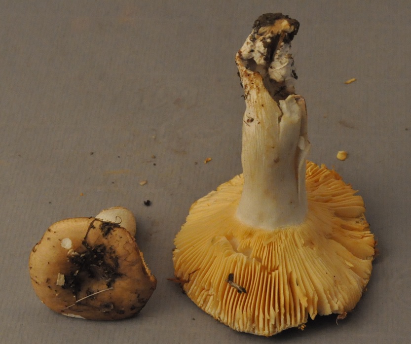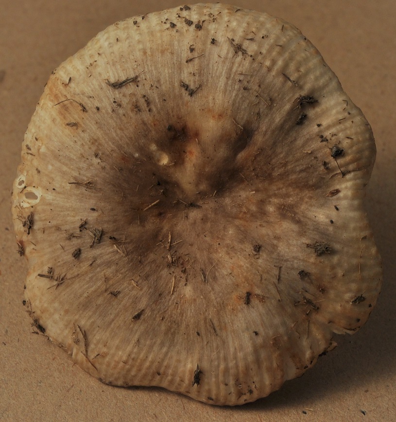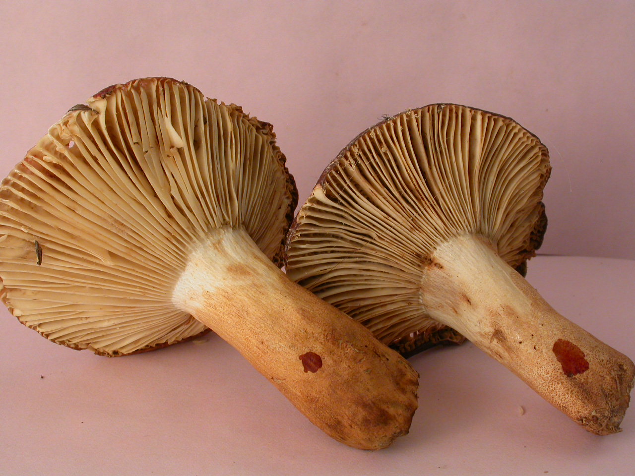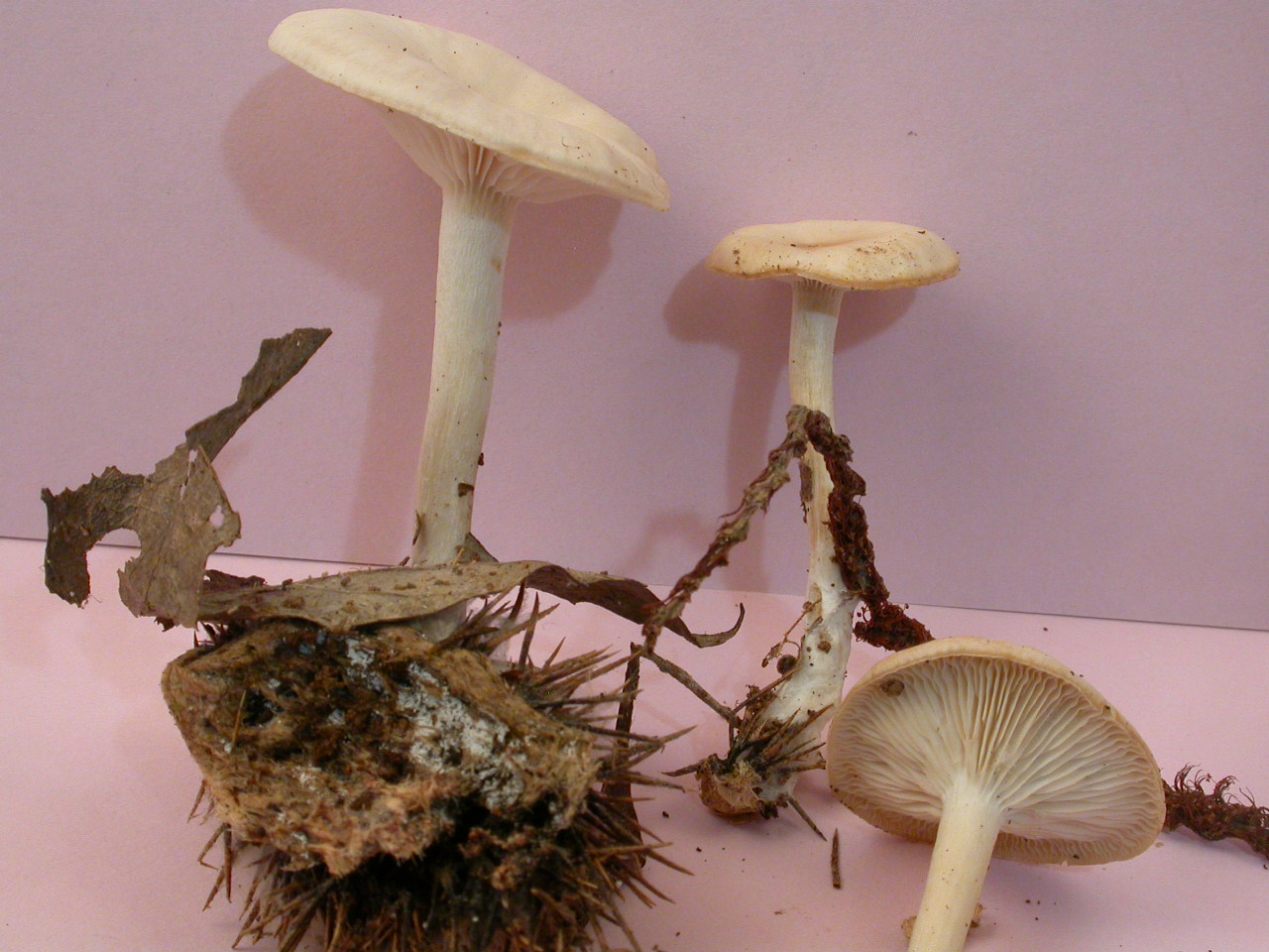 dessous, CD8-F11 3/4. Chapeau rose jambon, marge courtement et légèrement cannelée. Stipe blanc, dur, pointu-recourbé en bas. Lames crèmes (Rom-267 OK), régulières, en U, 8-9 au bord, épaisses, fourchues (à partir de R/2), non anastomosées.