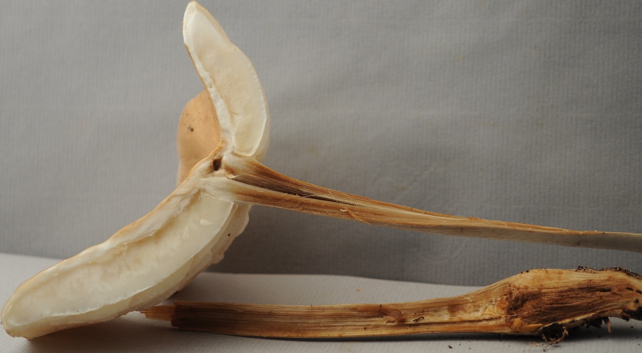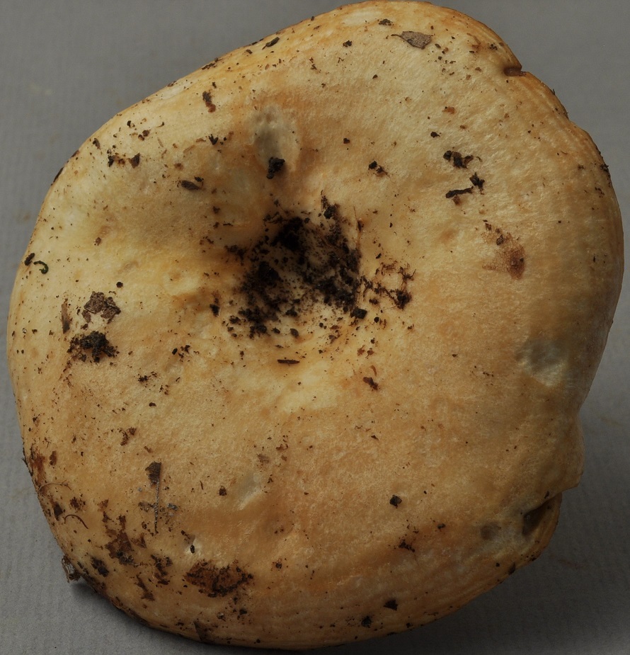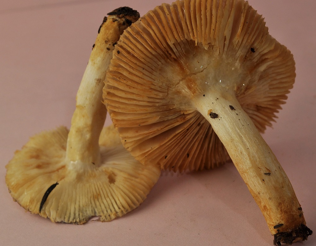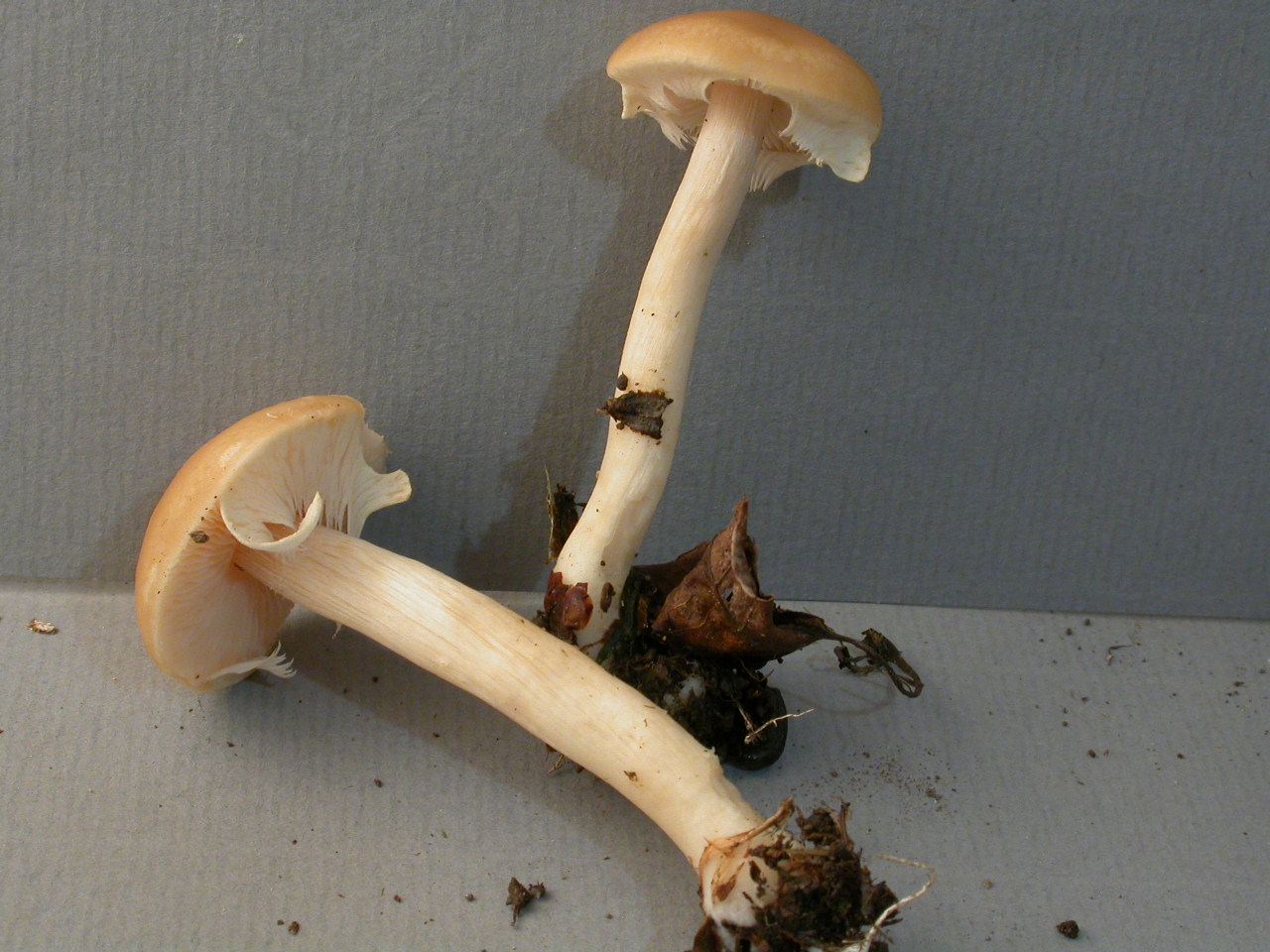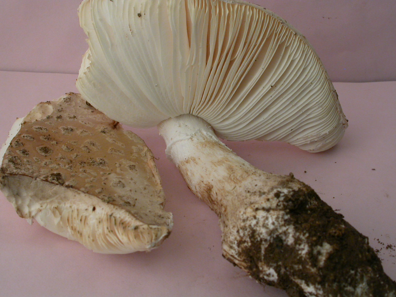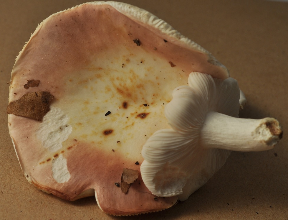 dessous, CD8-F11 3/4. Chapeau rose jambon, marge courtement et légèrement cannelée. Stipe blanc, dur, pointu-recourbé en bas. Lames crèmes (Rom-267 OK), régulières, en U, 8-9 au bord, épaisses, fourchues (à partir de R/2), non anastomosées.