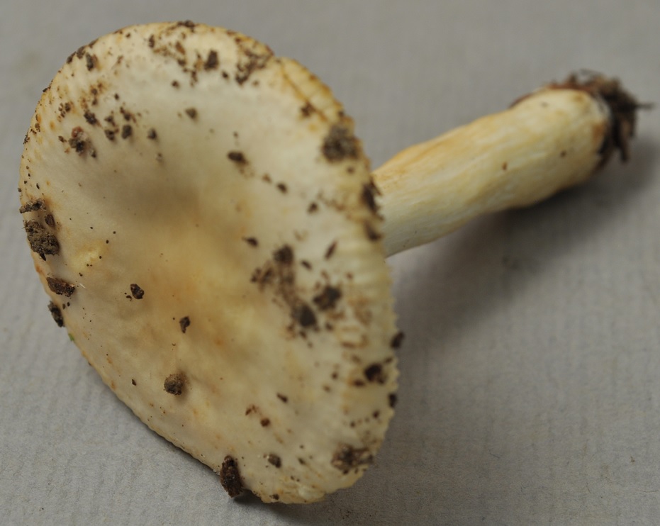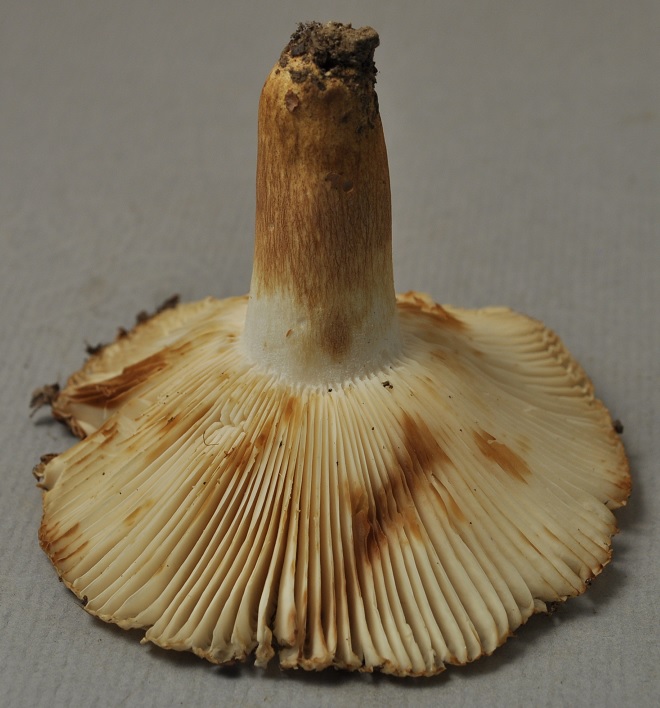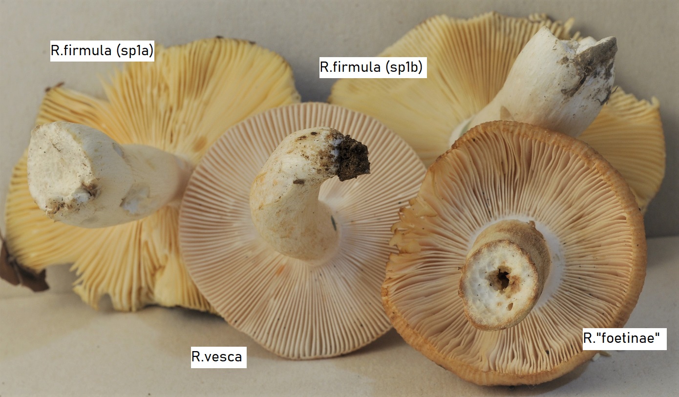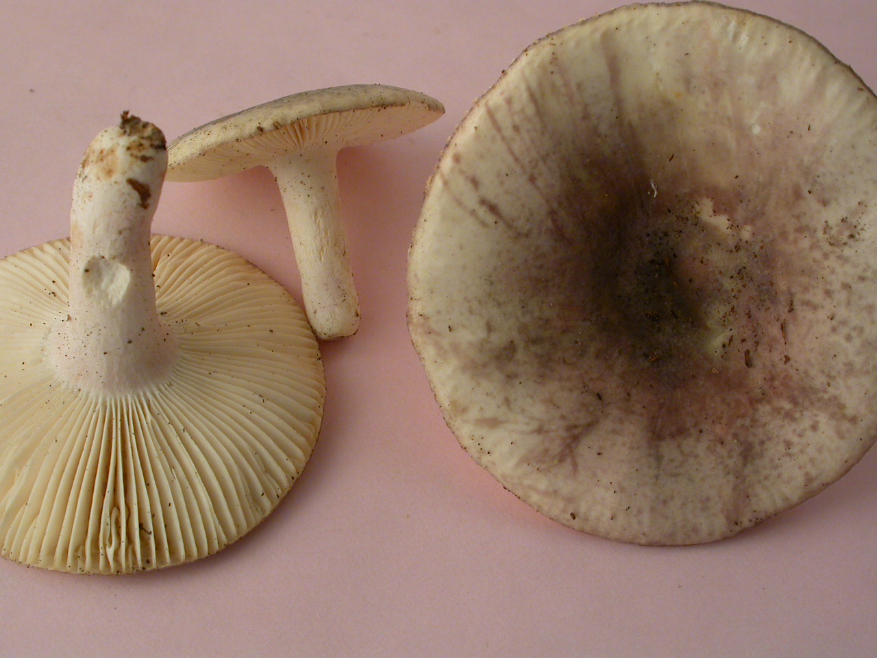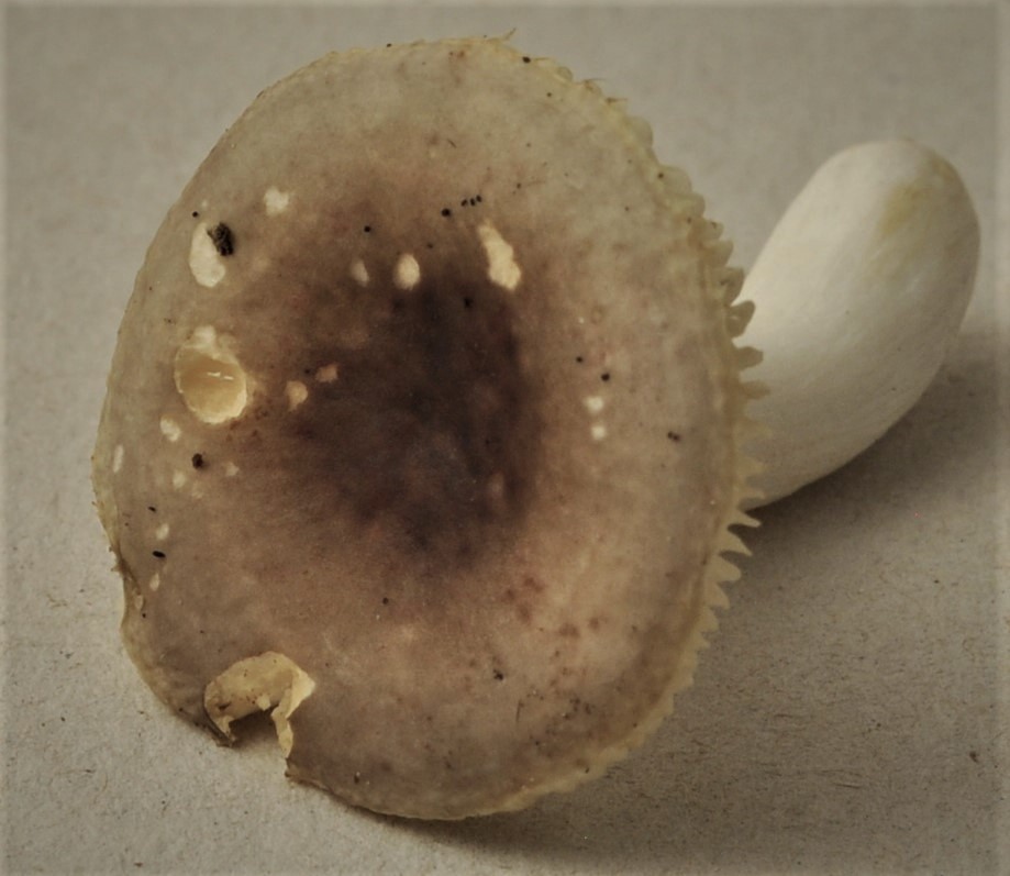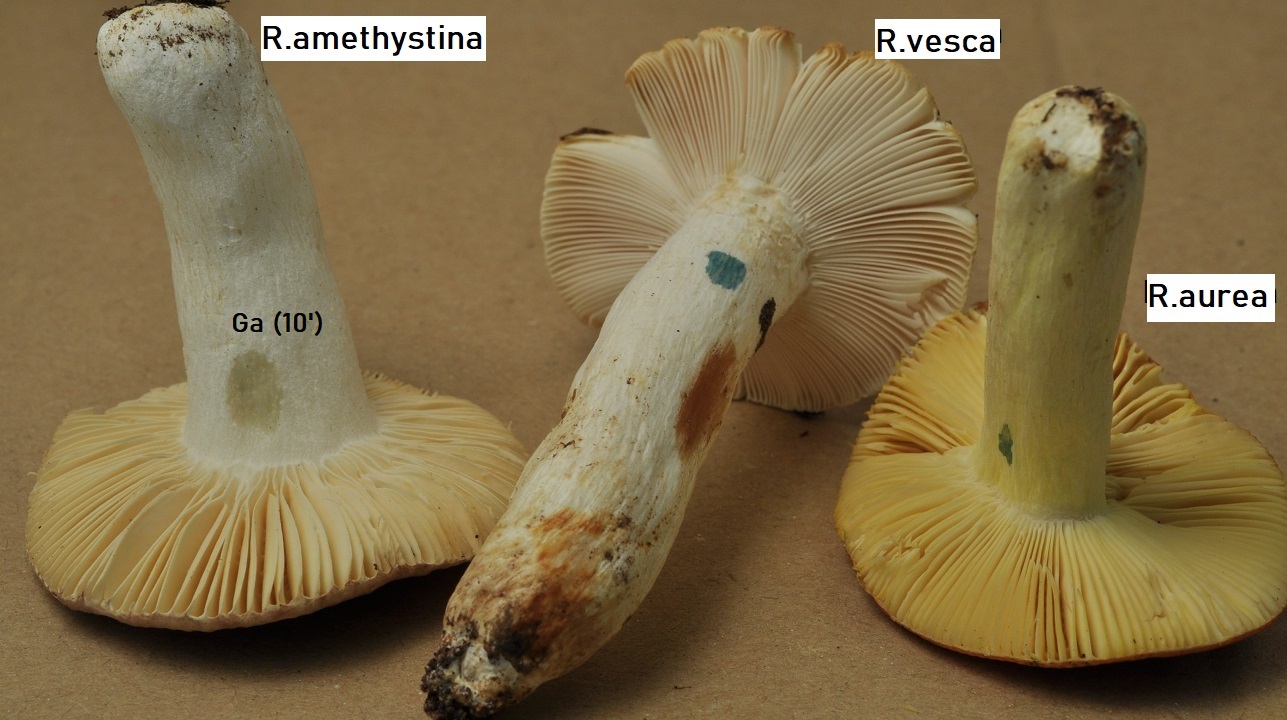 dessous , CD8-F12 50/51. Stipe blanchâtre, lames blanches, denses, lamellules, fourchues au niveau du stipe, chair dure. Lames crèmes en séchant. Ga S+++, Fe jaune orange (< 10"). Microspores 6 x 5 μ compatibles R.vesca mais recherche de crins négatives.