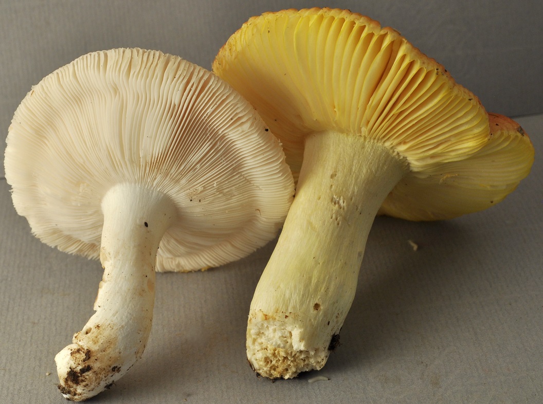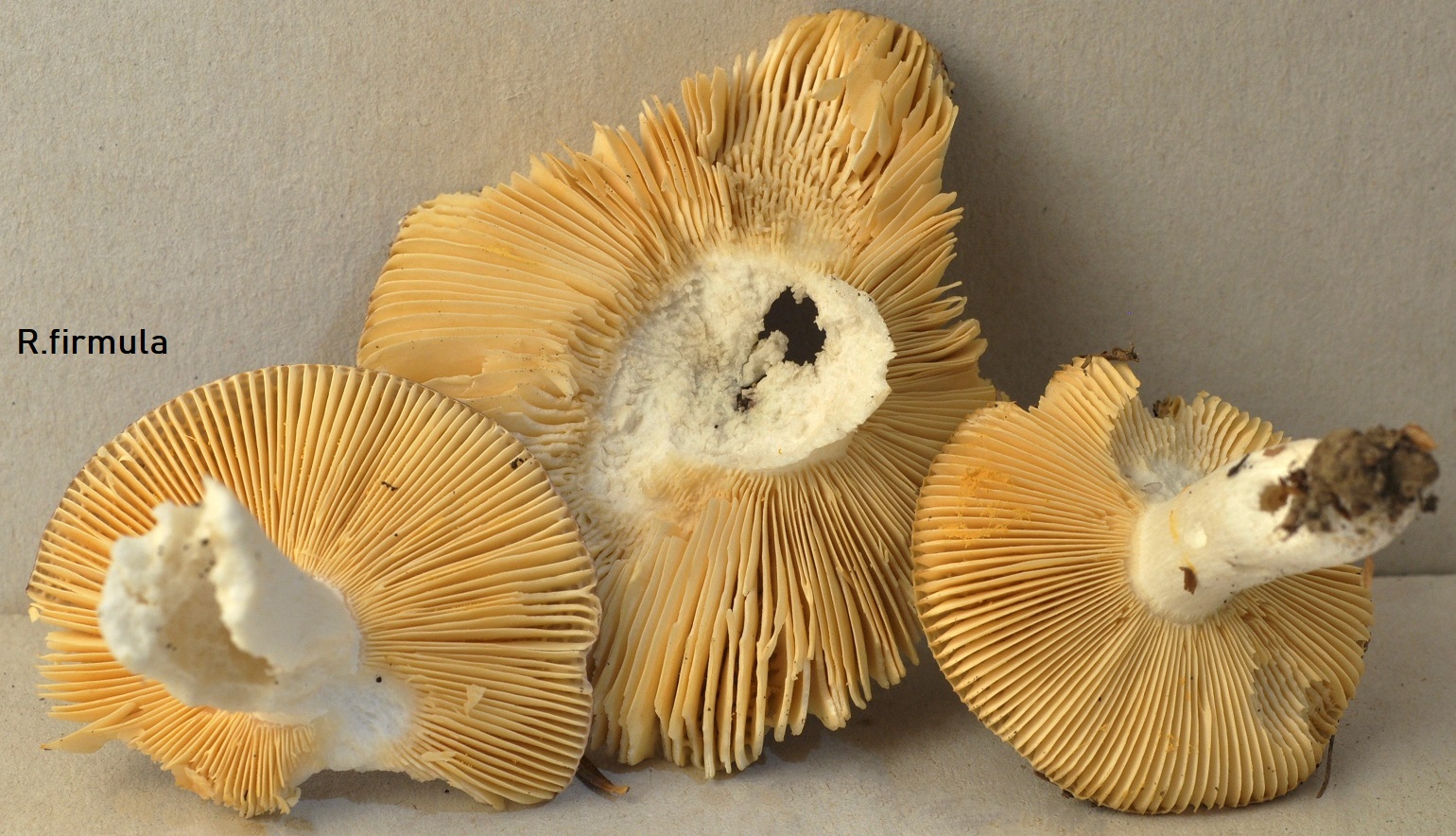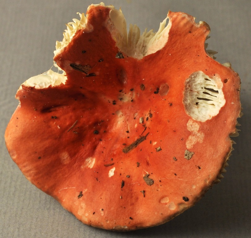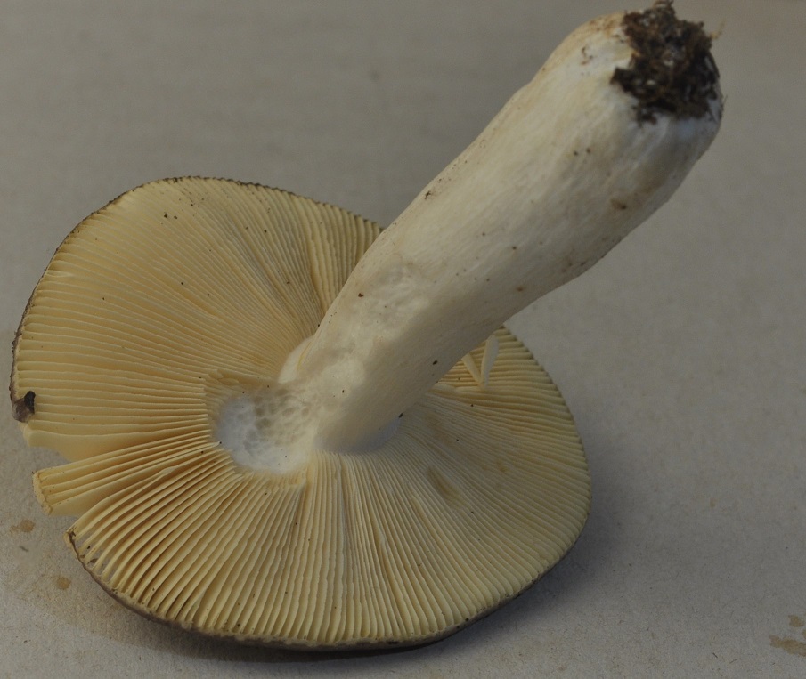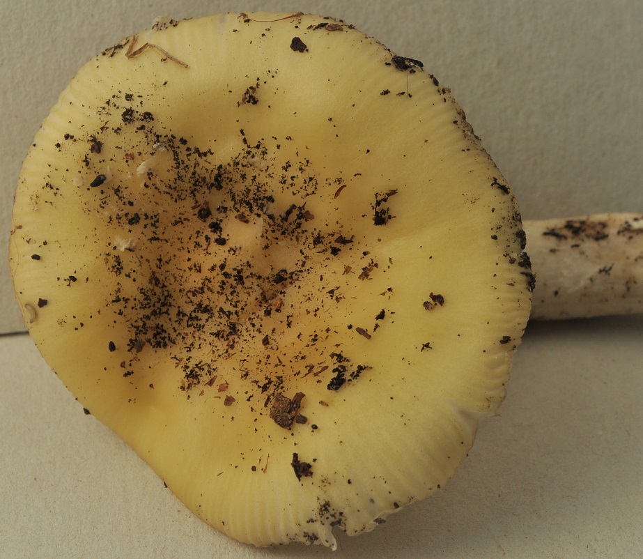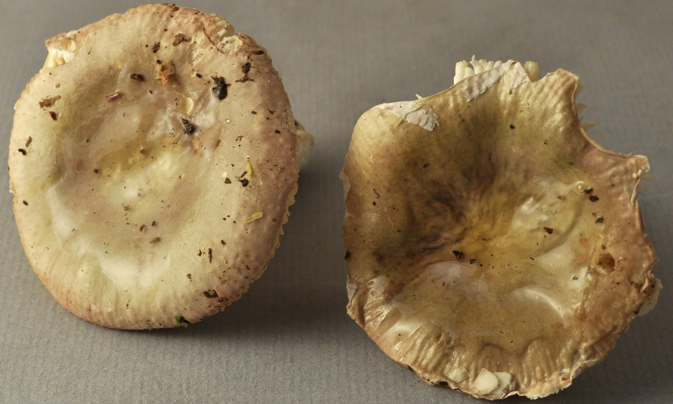 dessous , CD8-F12 50/51. Stipe blanchâtre, lames blanches, denses, lamellules, fourchues au niveau du stipe, chair dure. Lames crèmes en séchant. Ga S+++, Fe jaune orange (< 10"). Microspores 6 x 5 μ compatibles R.vesca mais recherche de crins négatives.