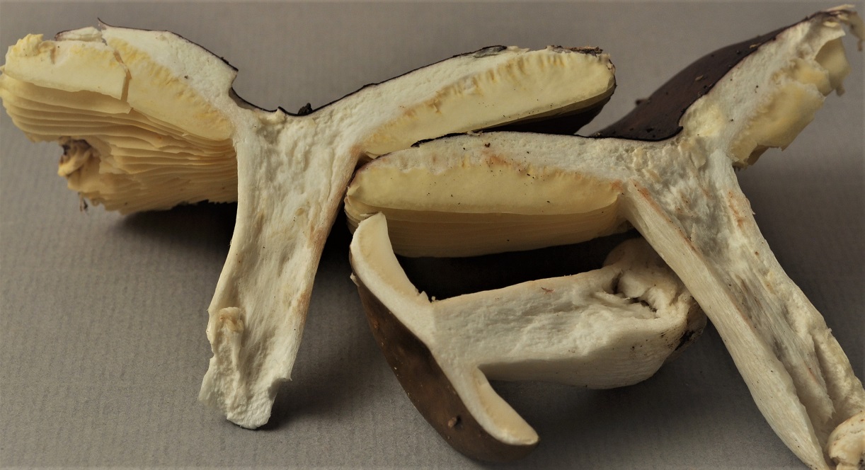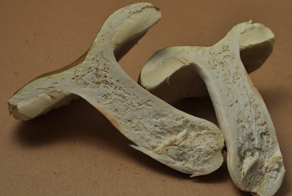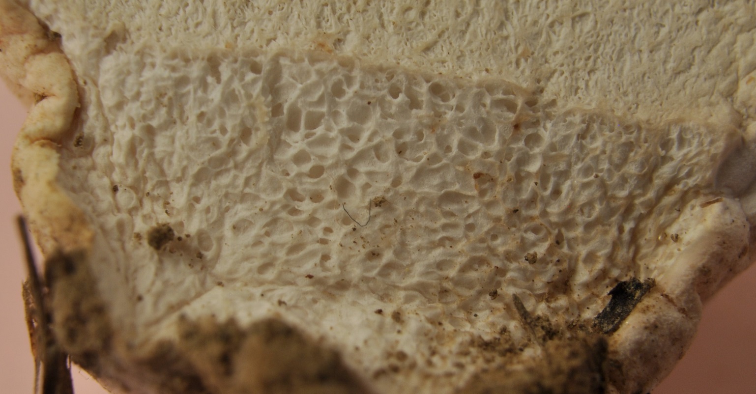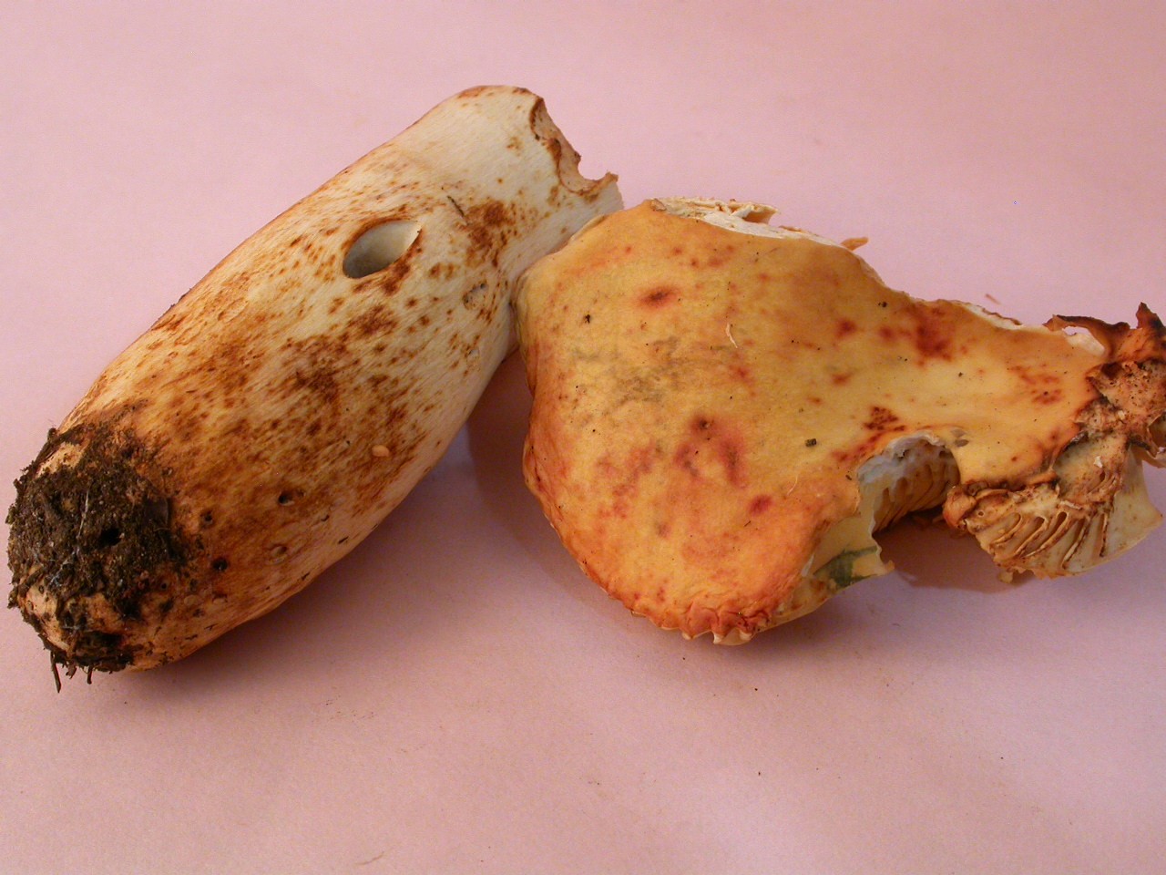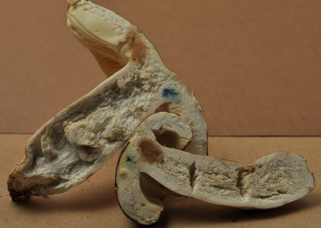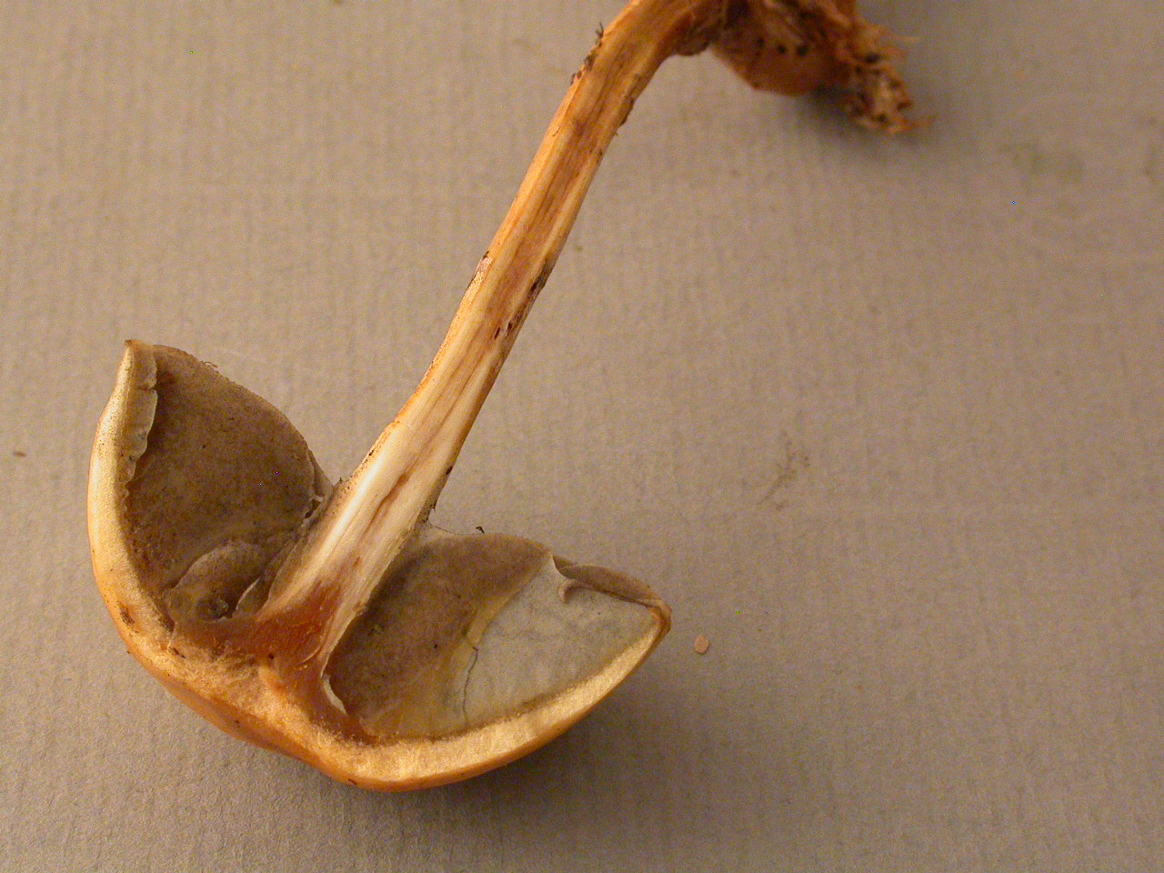 zoom, CD8-6 33. Gros exemplaires (~ 20 cm) observés sur site. Spores non lisses observées dans l'eau. Gléba devient jaune, subgléba reste blanche.