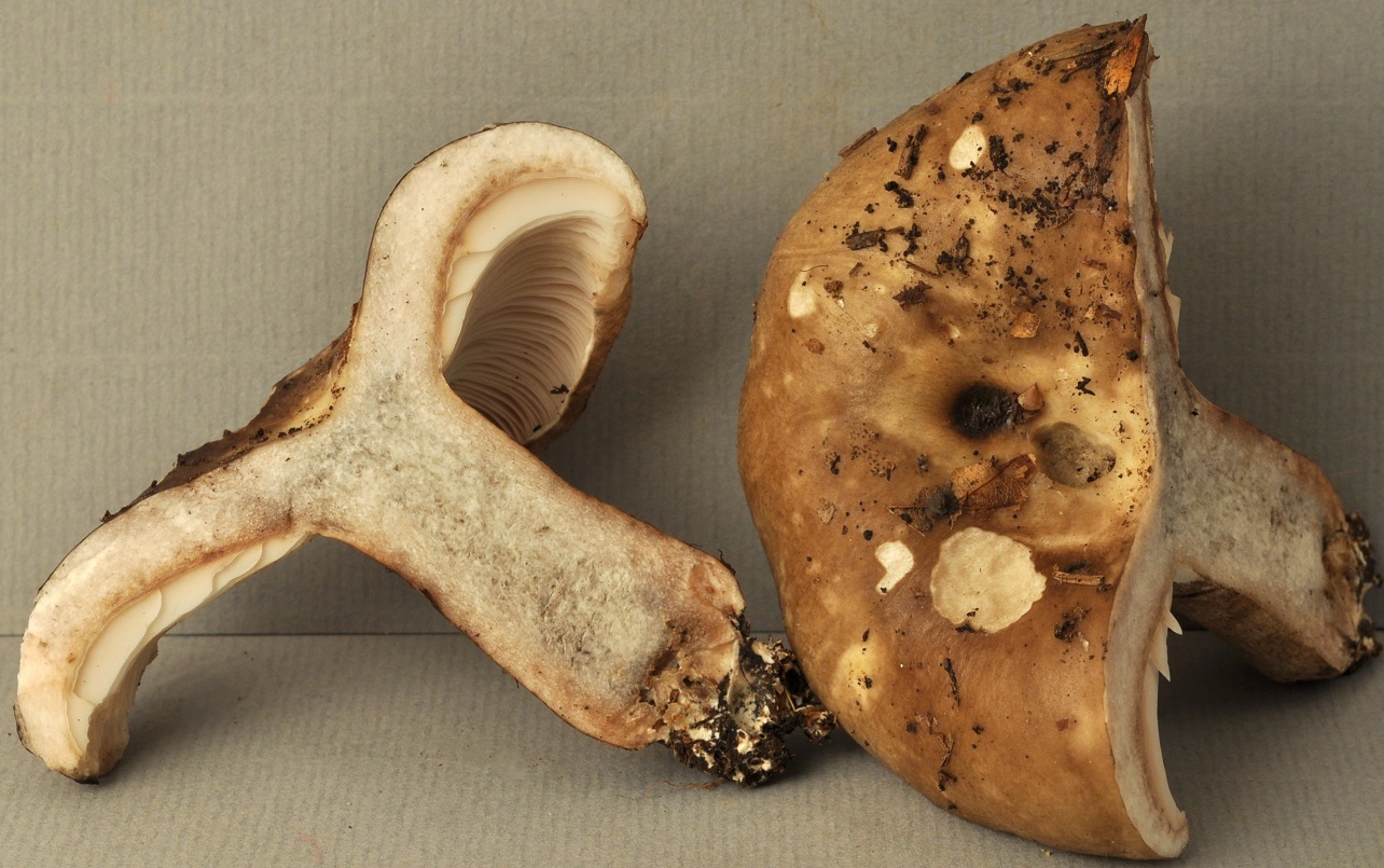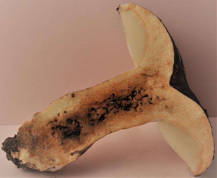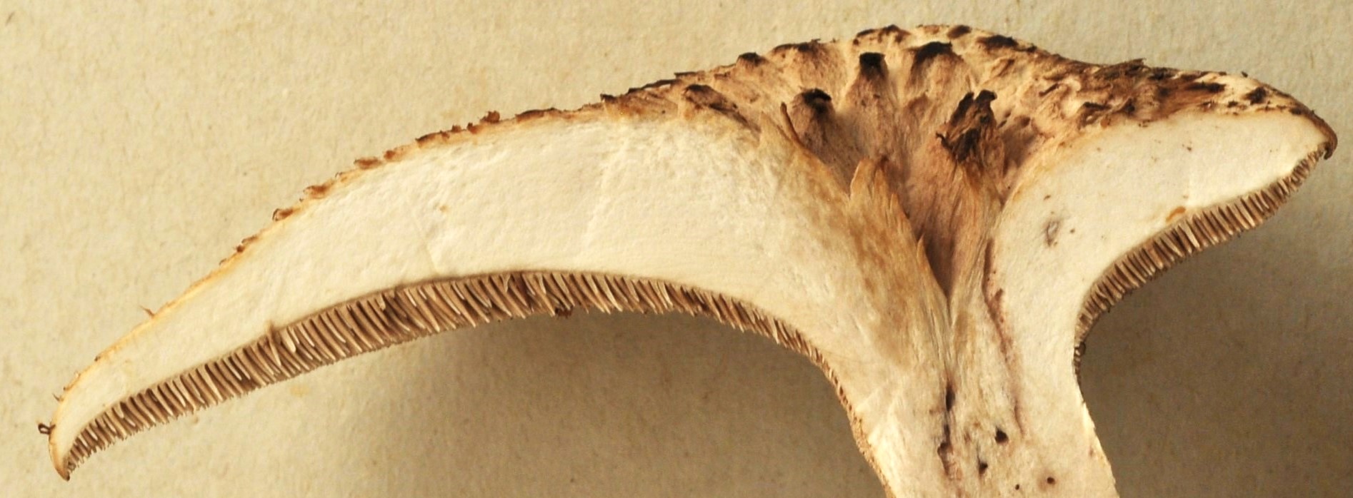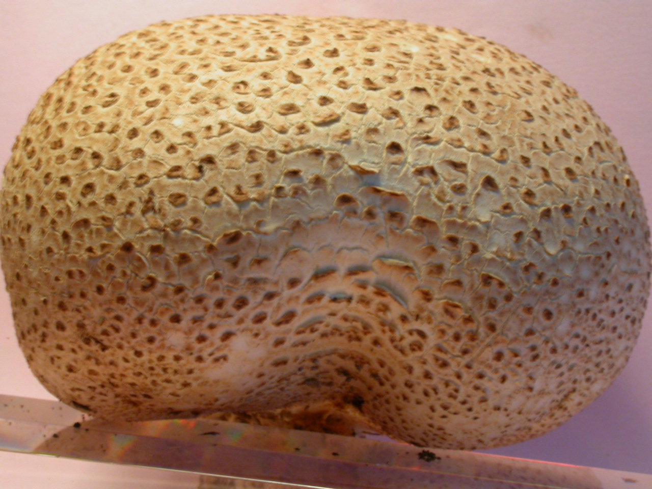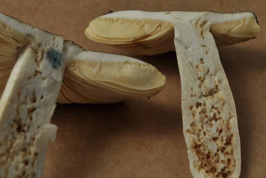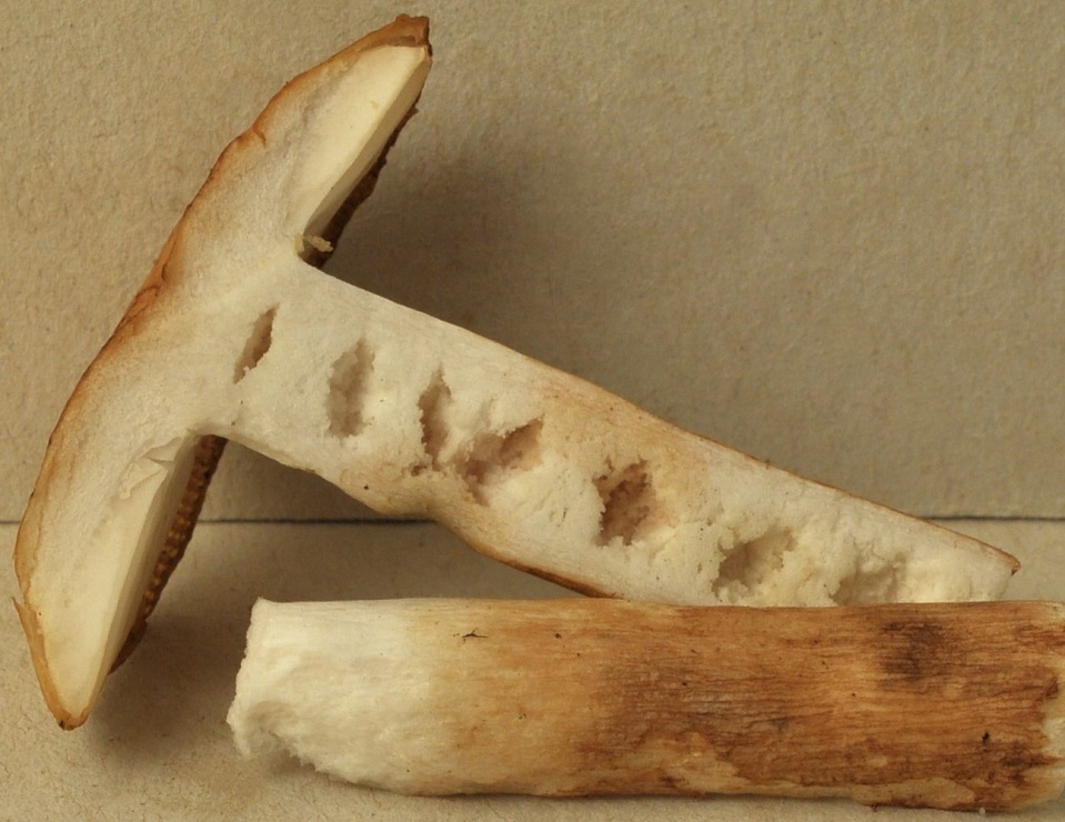 zoom, CD8-6 33. Gros exemplaires (~ 20 cm) observés sur site. Spores non lisses observées dans l'eau. Gléba devient jaune, subgléba reste blanche.