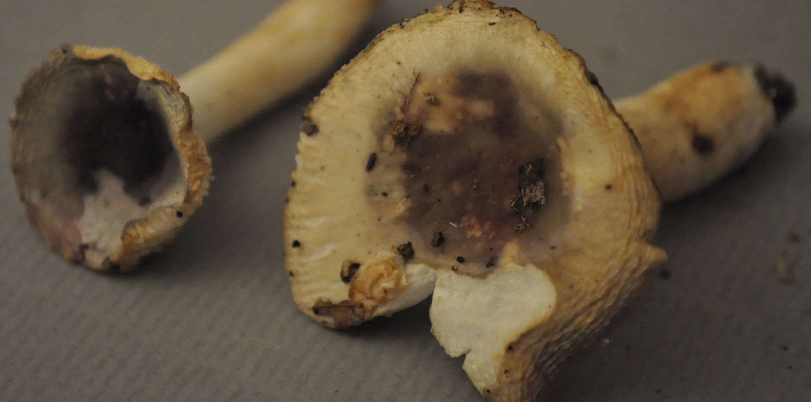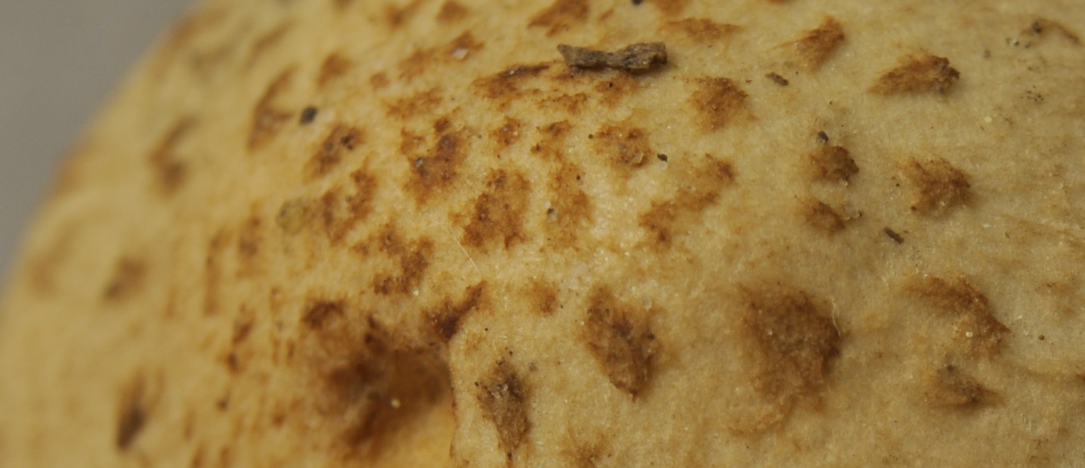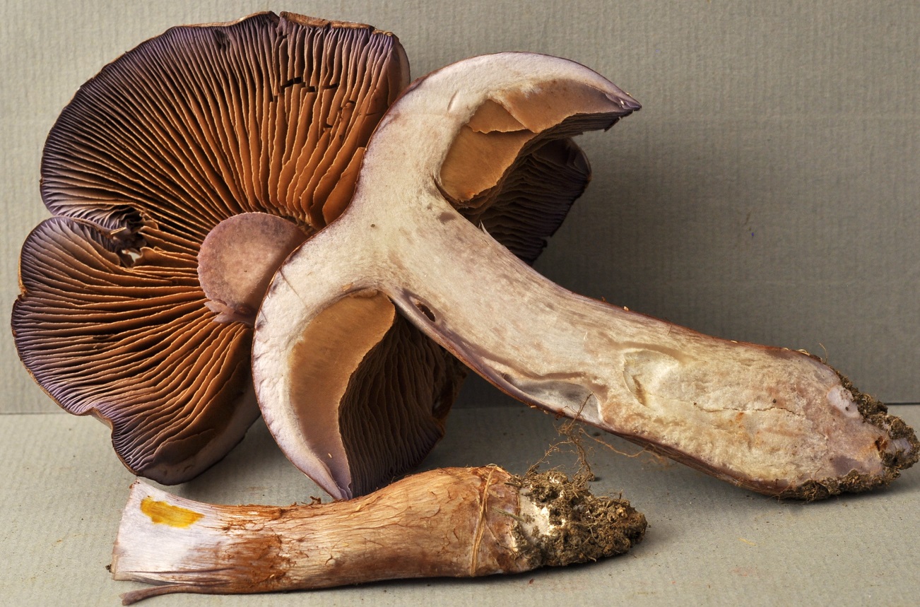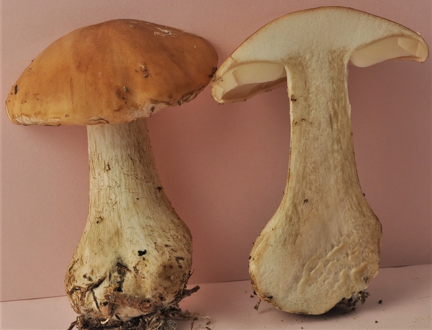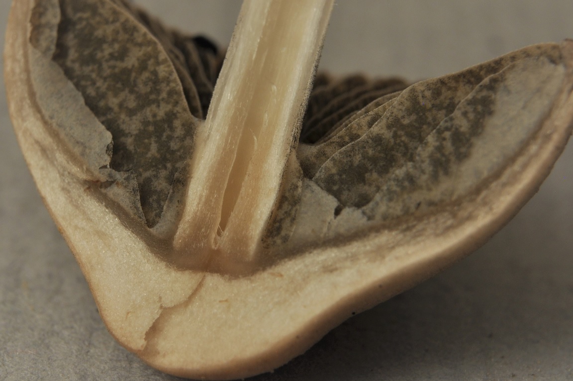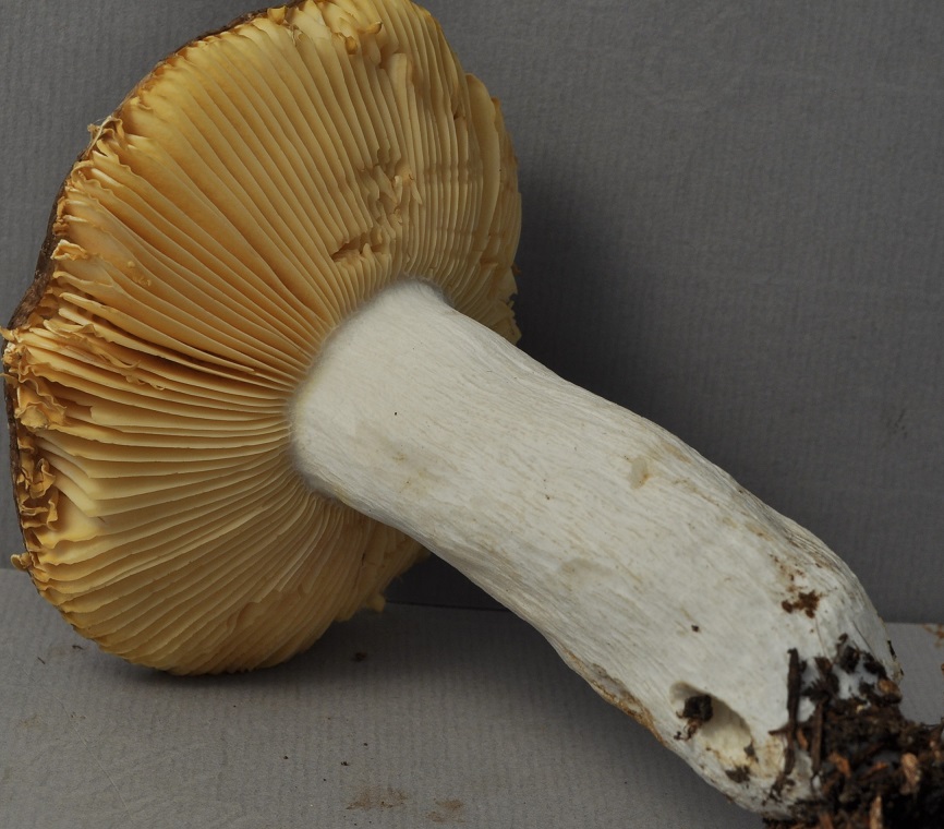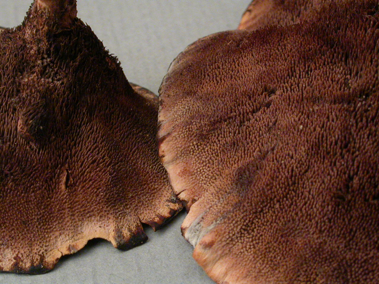 zoom, CD8-6 33. Gros exemplaires (~ 20 cm) observés sur site. Spores non lisses observées dans l'eau. Gléba devient jaune, subgléba reste blanche.
