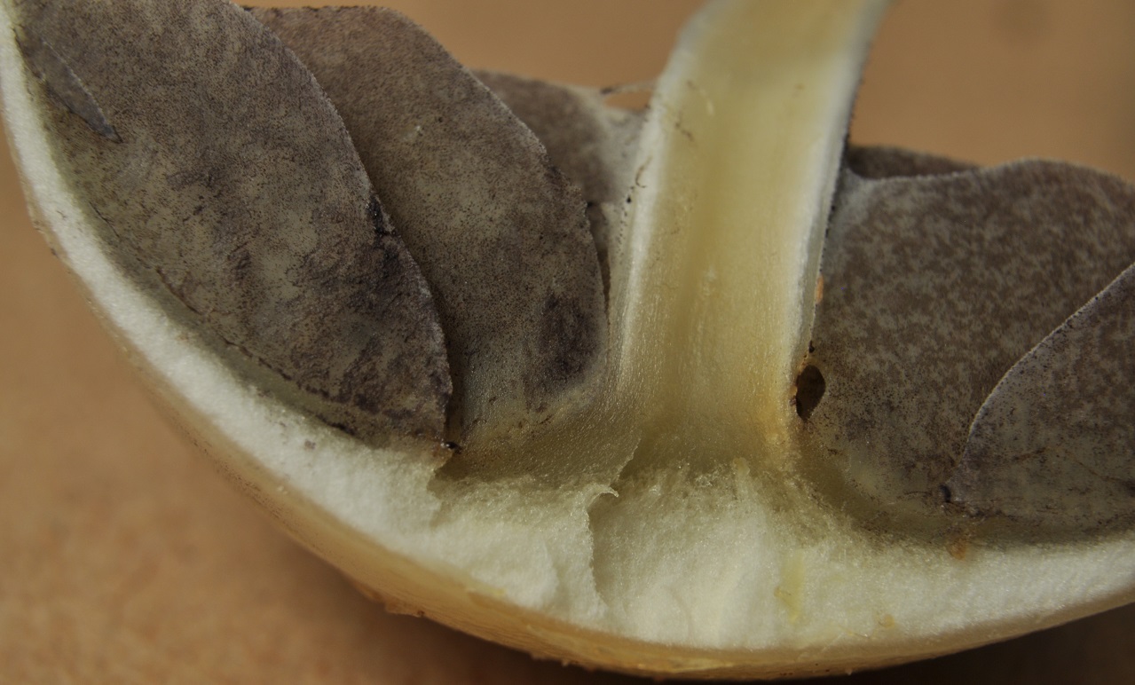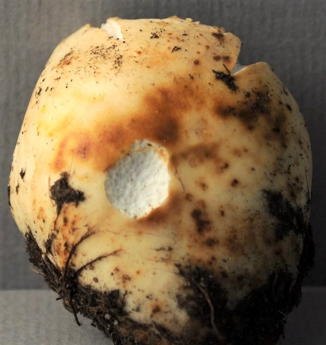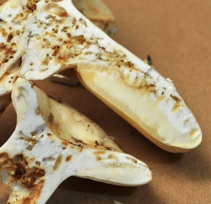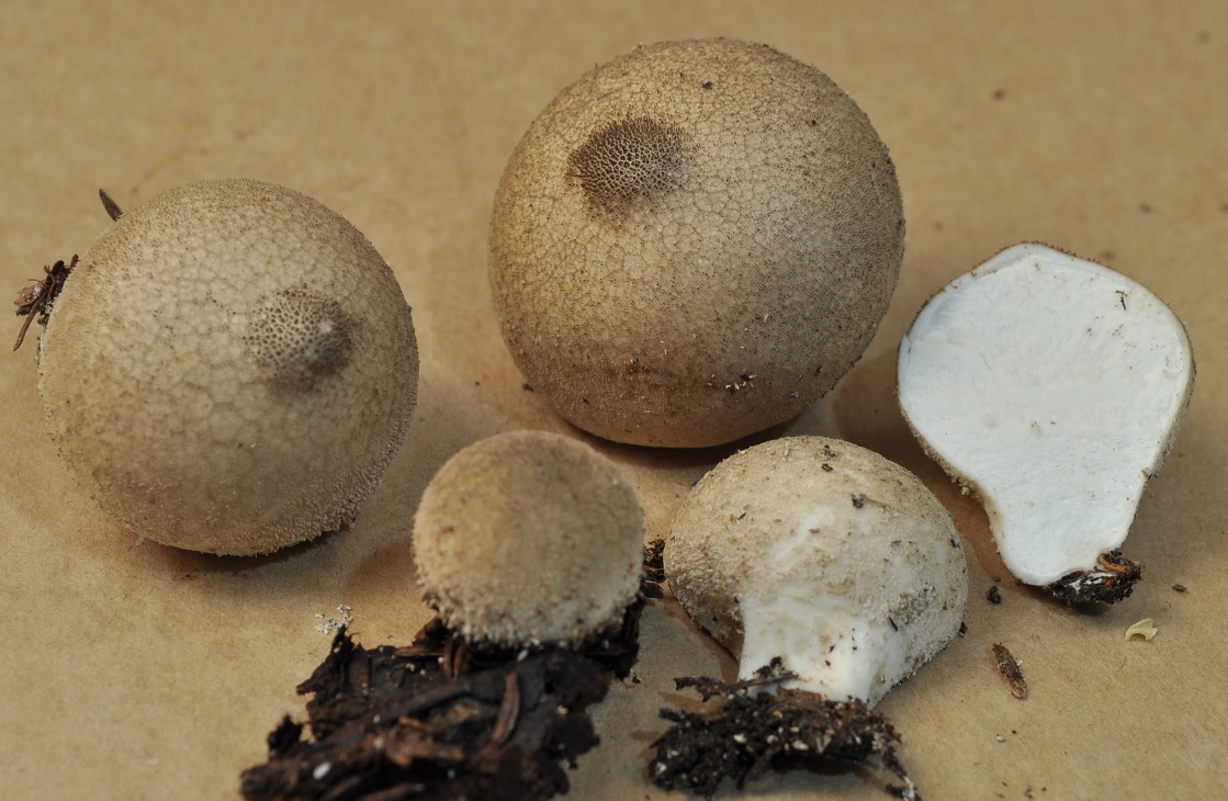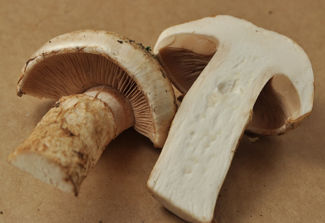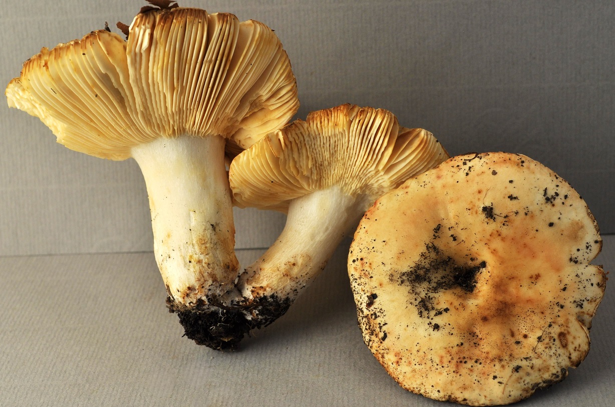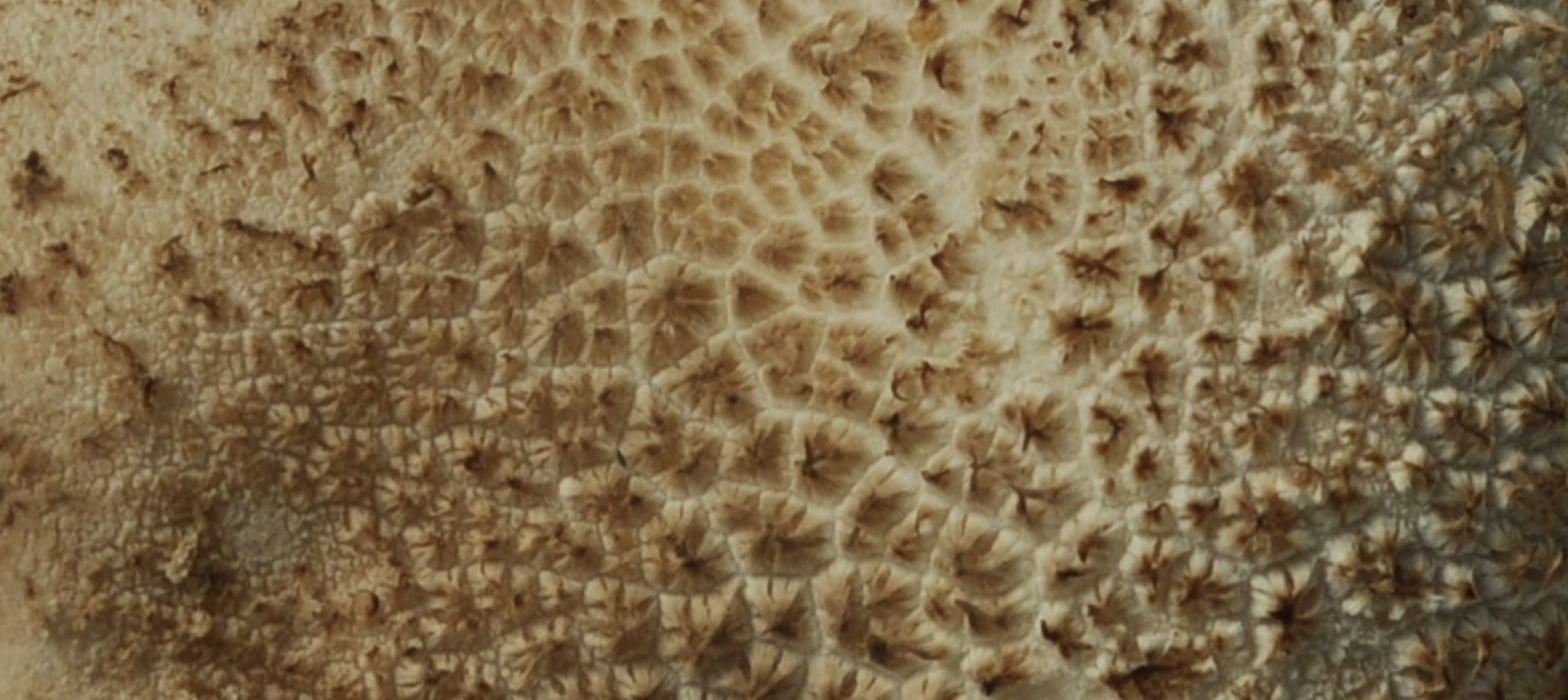 zoom, CD8-6 33. Gros exemplaires (~ 20 cm) observés sur site. Spores non lisses observées dans l'eau. Gléba devient jaune, subgléba reste blanche.