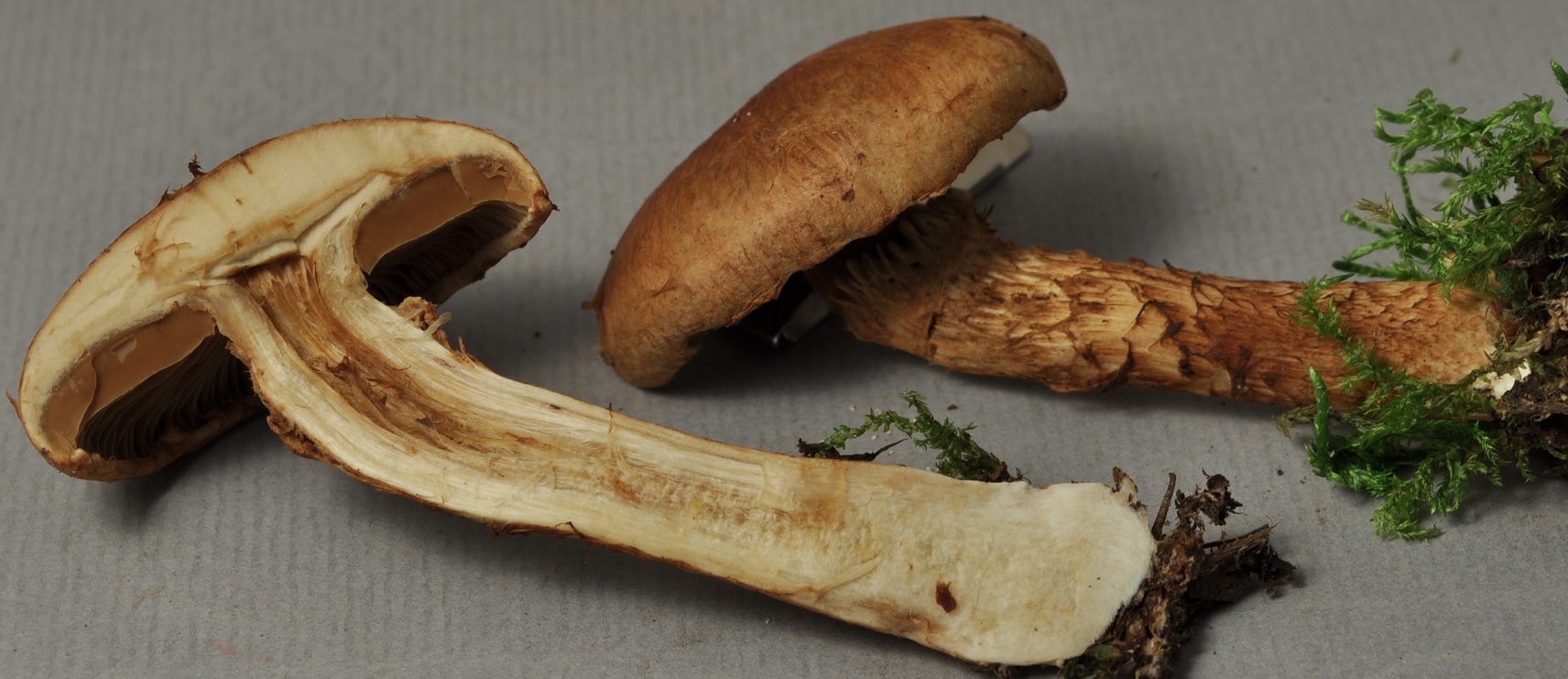 photo, CD8-6 36/37. Champignon brun à stipe hérissé d'écailles (armille). Lames brun sombre, émarginées, l/t 4/9 mm. Chair douce. Spores brunes (Agrocybe-like), parois épaisses, bien visibles.