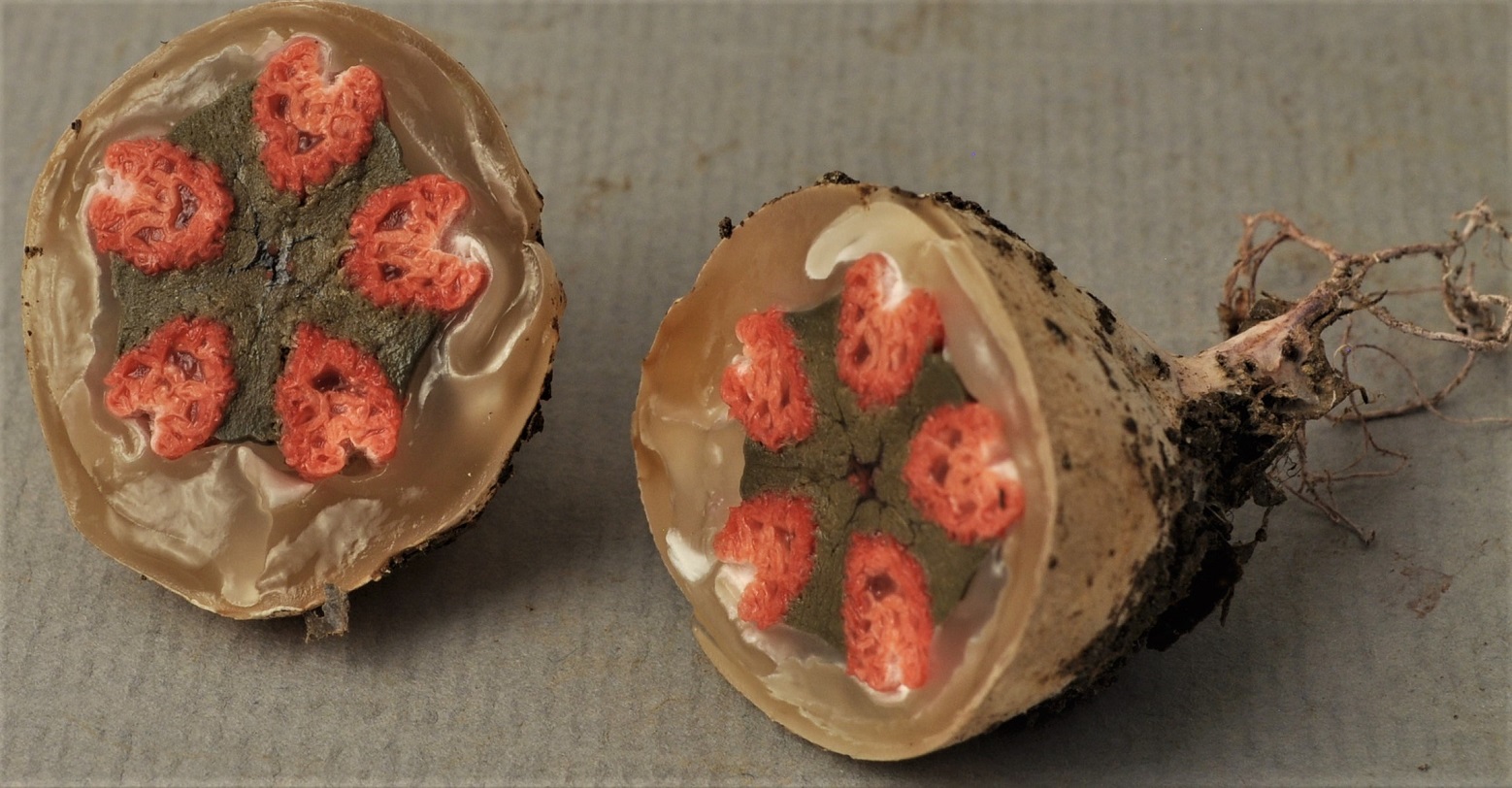 photo, CD8-F9 44/45. 2 ex. l'un Φ 155 mm, H 300 mm ! volve épaisse, colorée à l'intérieur, stipe chiné en partie.