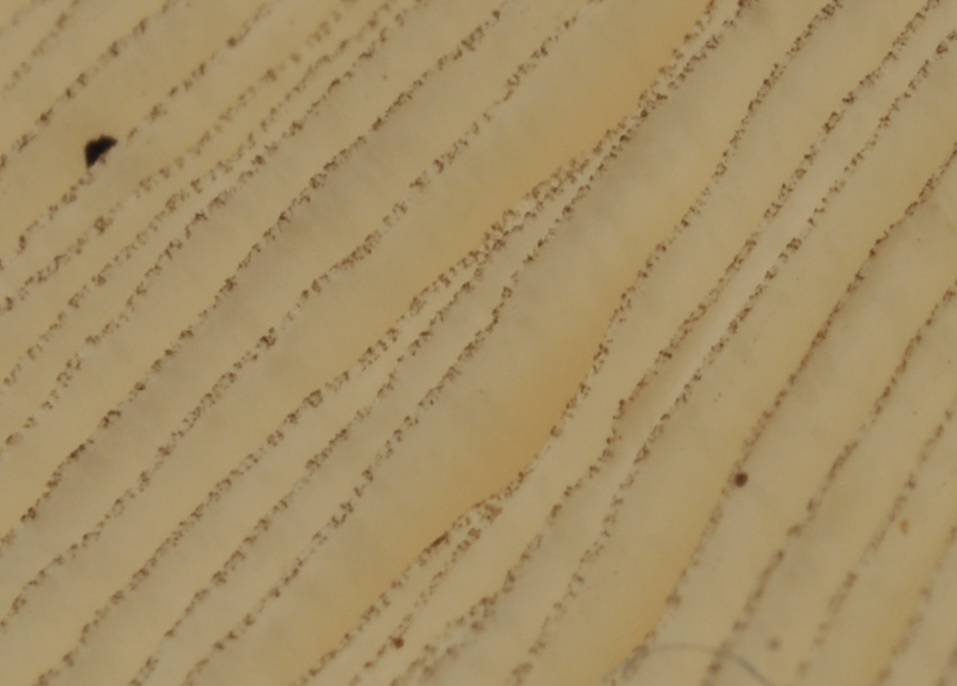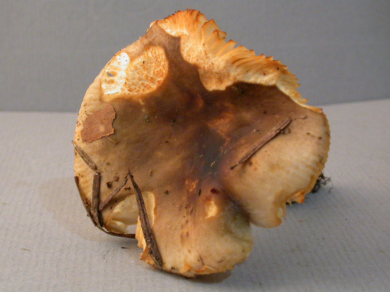 dessous, CD8-F6 23/24. Marge non striée. Lames blanc-crème, émarginées, qq fourchues, qq lamellules, l/t 6/12. Stipe concolore, clavé ( non appointi !). Odeur faible, agréable. Saveur douce. Ga S0 L+ (8-10") C0, Fe jaune orange (fort). Ga nul, pied non appointi, absence de crins sur le chapeau amènent qq doutes.