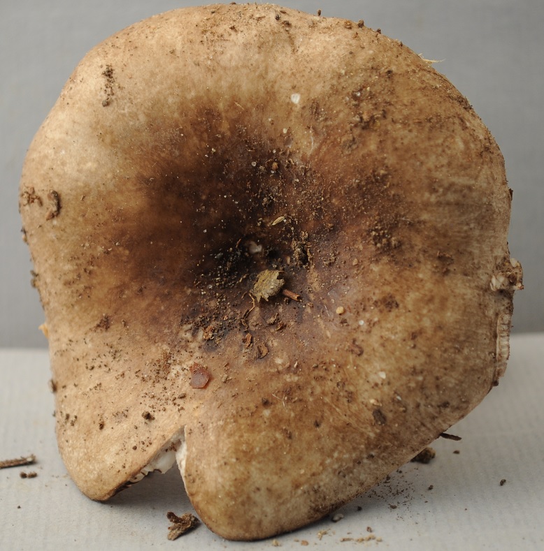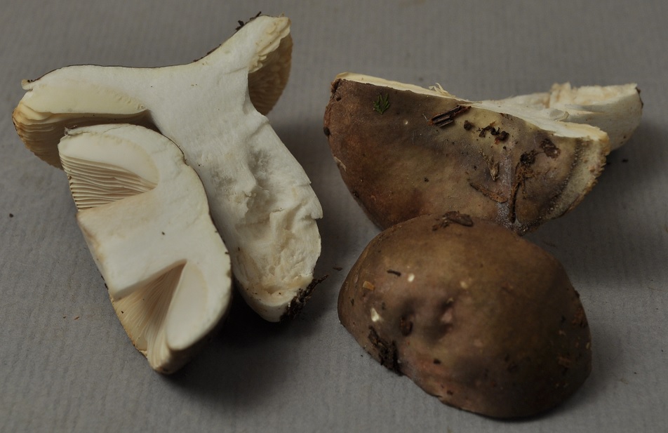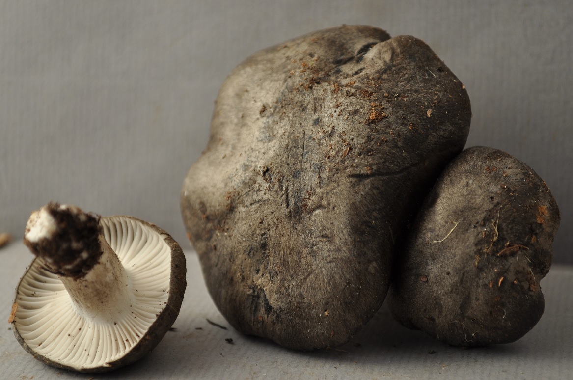 photo, CD8-F4 3/4. Chapeau gris sombre, vers les bruns au centre en séchant, mamelonné, fortement pruineux sur l'extérieur. Stipe glabre, luisant, pruineux en haut et en bas. Lames grises, non entières, libres, l/t 4.5/5. Chair blanche, contrastant avec la couleur du stipe (en particulier sous le mamelon), très mince hors mamelon; Odeur certaine (farine rance ?). Sporée blanche.