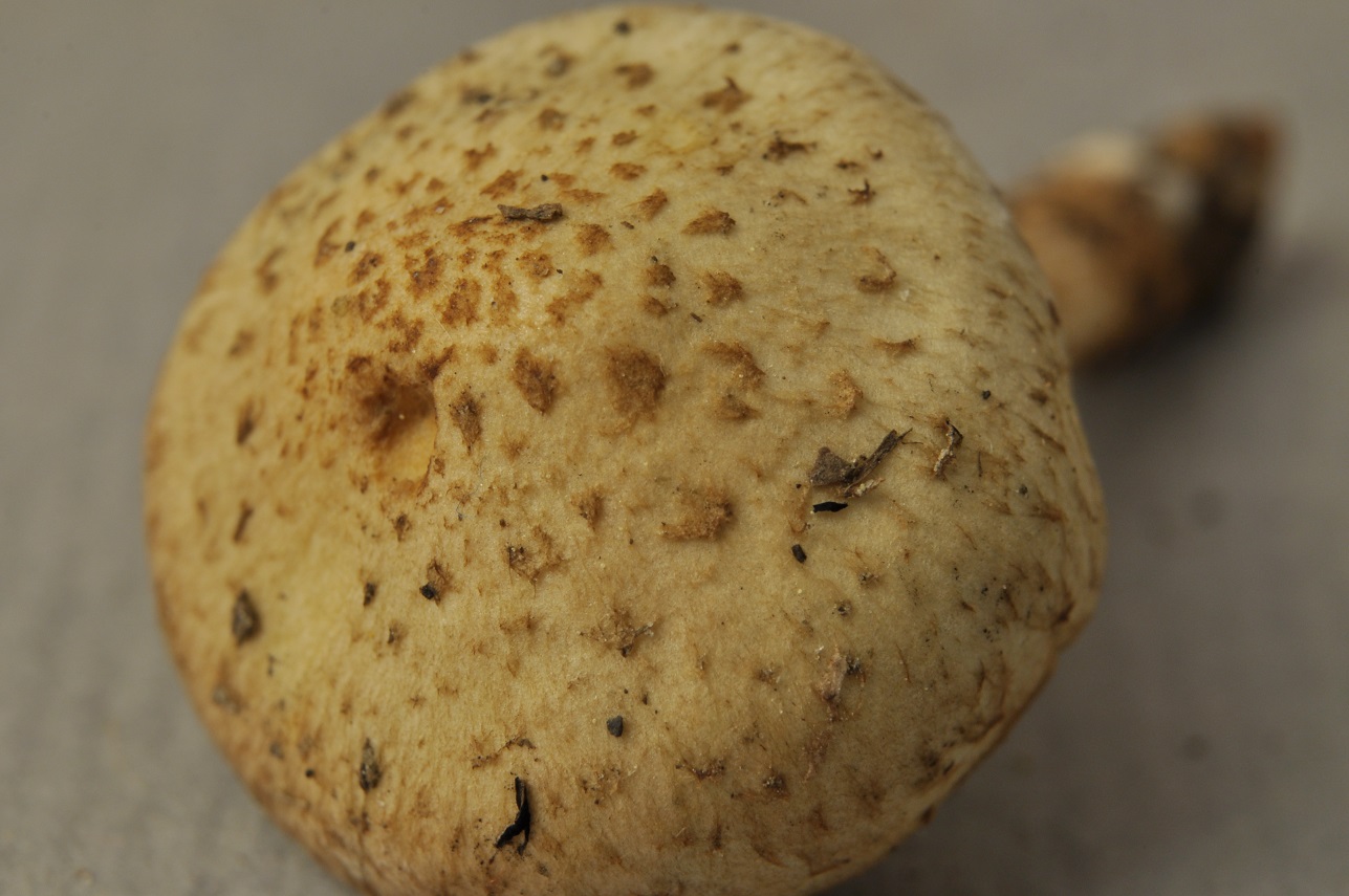 photo, CD8-F10 7. Chapeau convexe, blanchâtre. Stipe blanc (Φ 8 mm) avec rhizoïdes, voile membraneux, chair épaisse (l/t 4/9). Saveur amère. Trouvé dans l'herbe le long du chemin. Ressemble bien à Agrocybe molesta par la macro (chapeau blanc, chair épaisse, dans l'herbe) ou la micro (forme des cystides sur l'arête), mais il s'agit des plus petites spores rencontrées pour cette espèce et le pore germinatif est très peu visible.