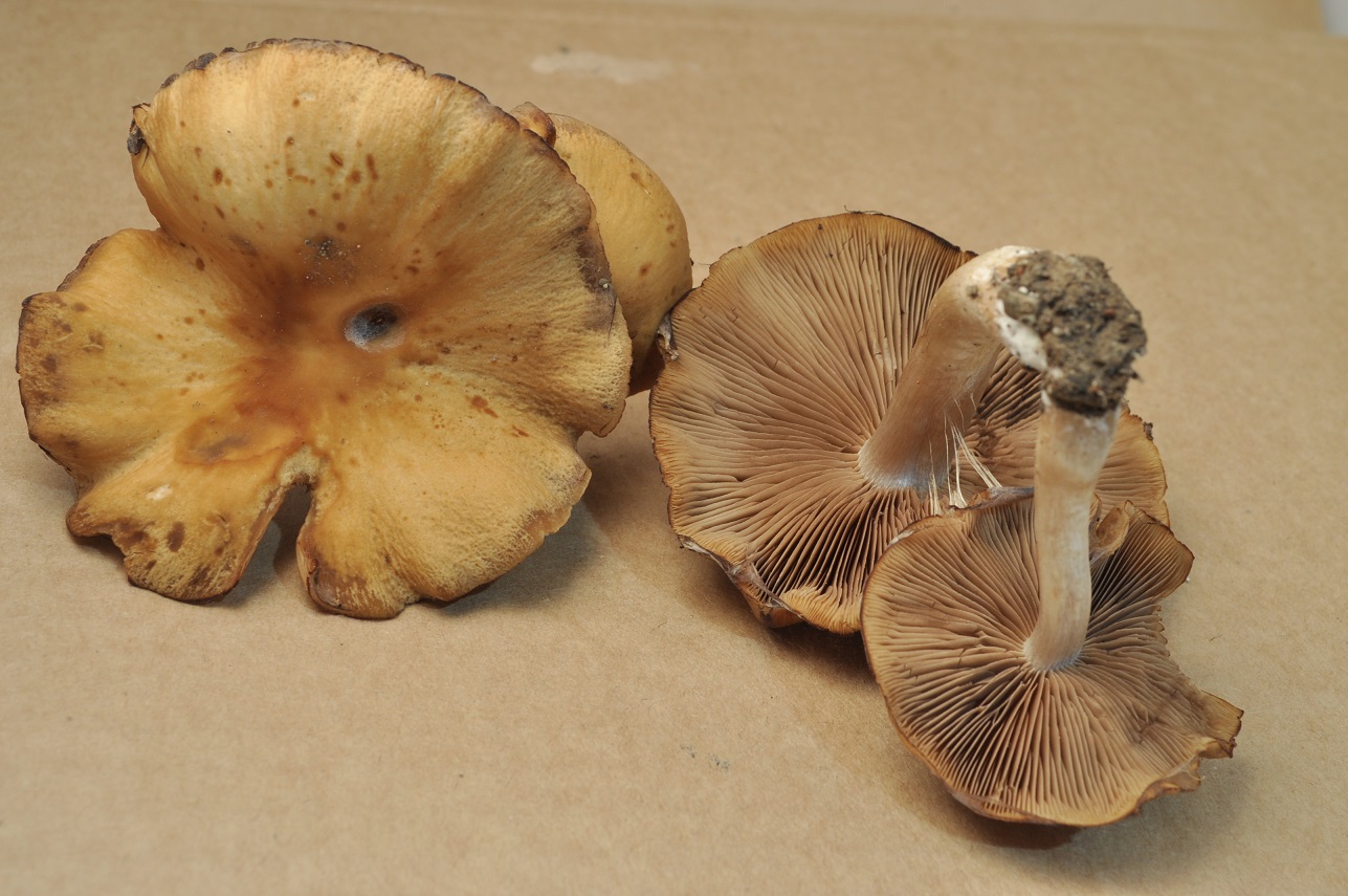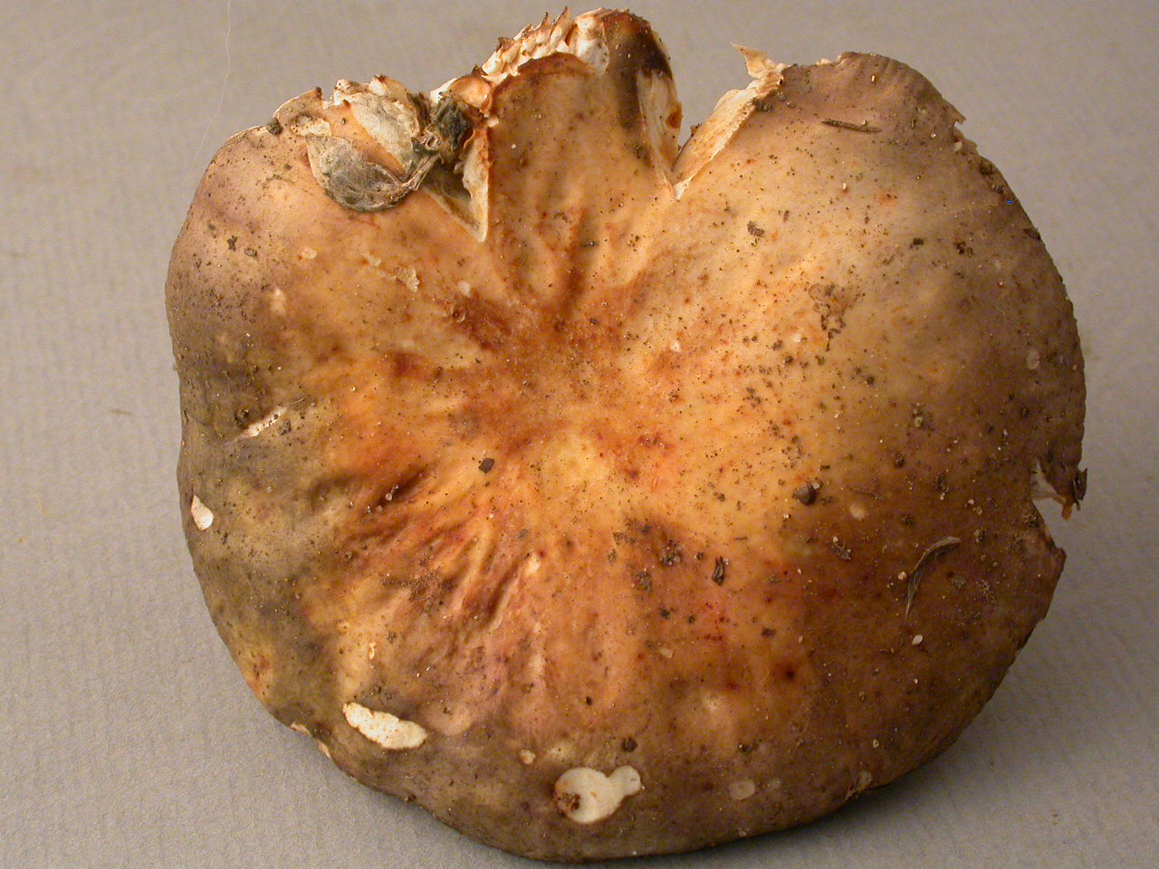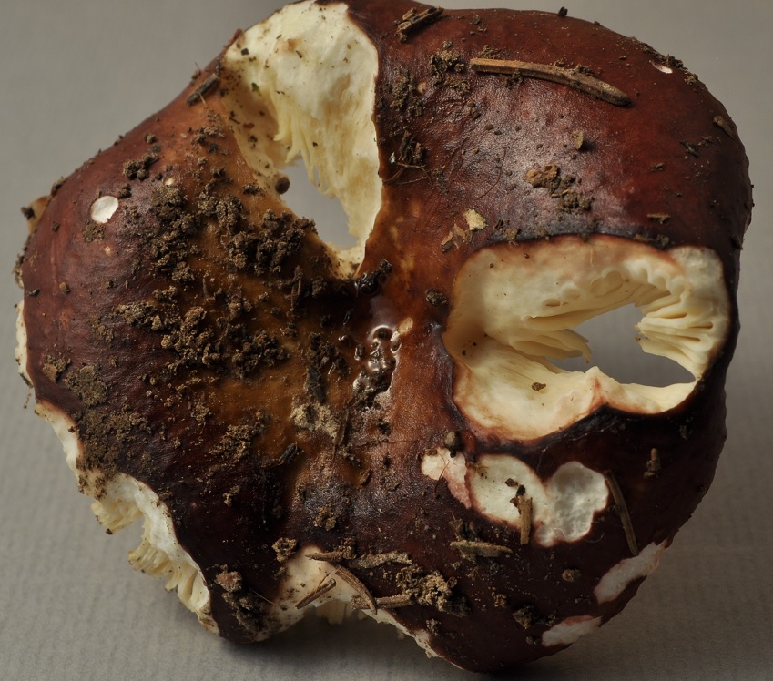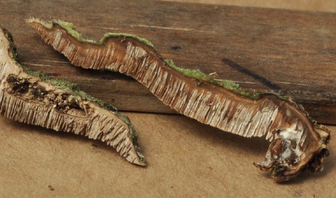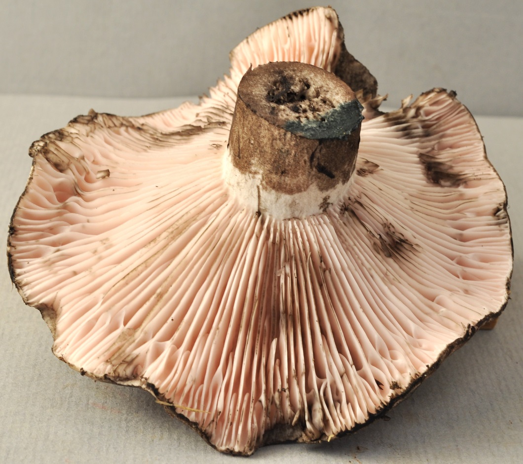 la station, CD8-F5 24/30. En nombre sur les copeaux autour d'un hortensia (Φ jusqu'à 50 mm). Saveur amère (lames et chair). Notez la chair sombre et les lames colorées.