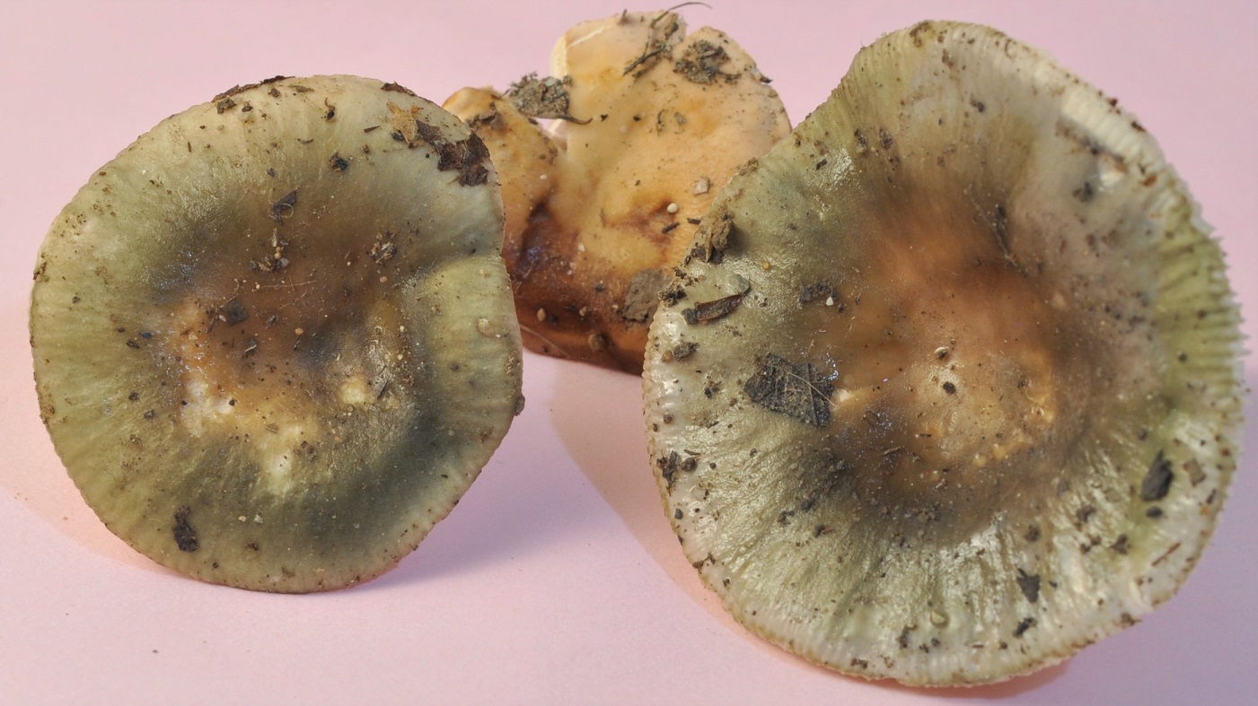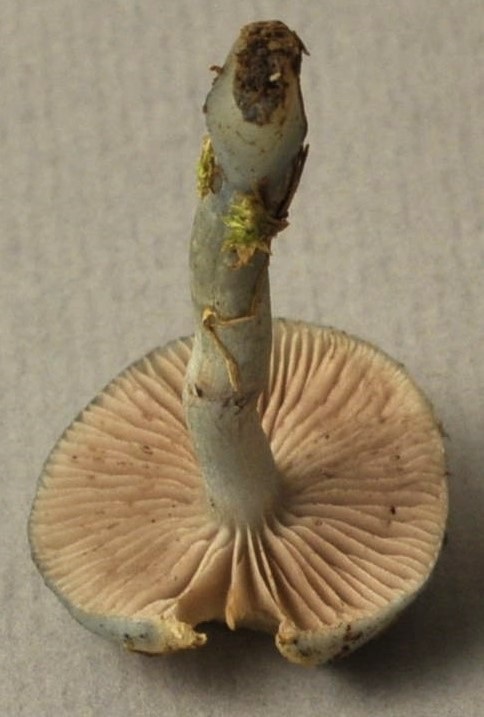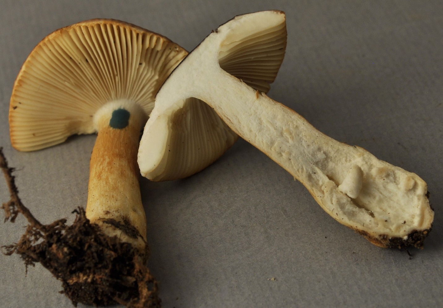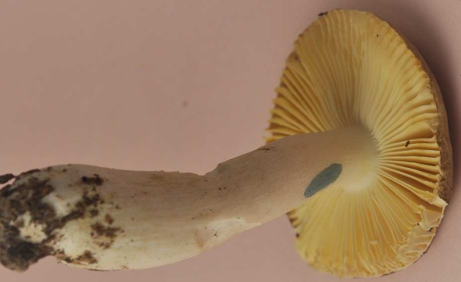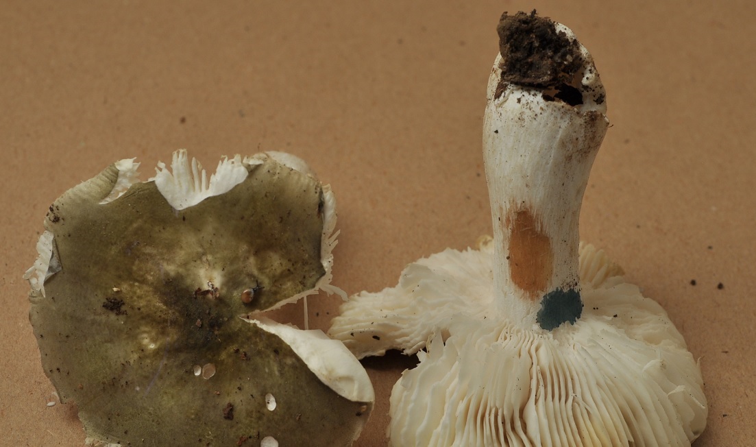 dessous, CD8-F11 100/101. Chapeau verdâtre-bleuâtre avec des plages ochracées. Lames émarginées, dentelées. Stipe pruineux en haut, restes de voile noirâtre, dessous, bas du pied bleuâtre-verdâtre.