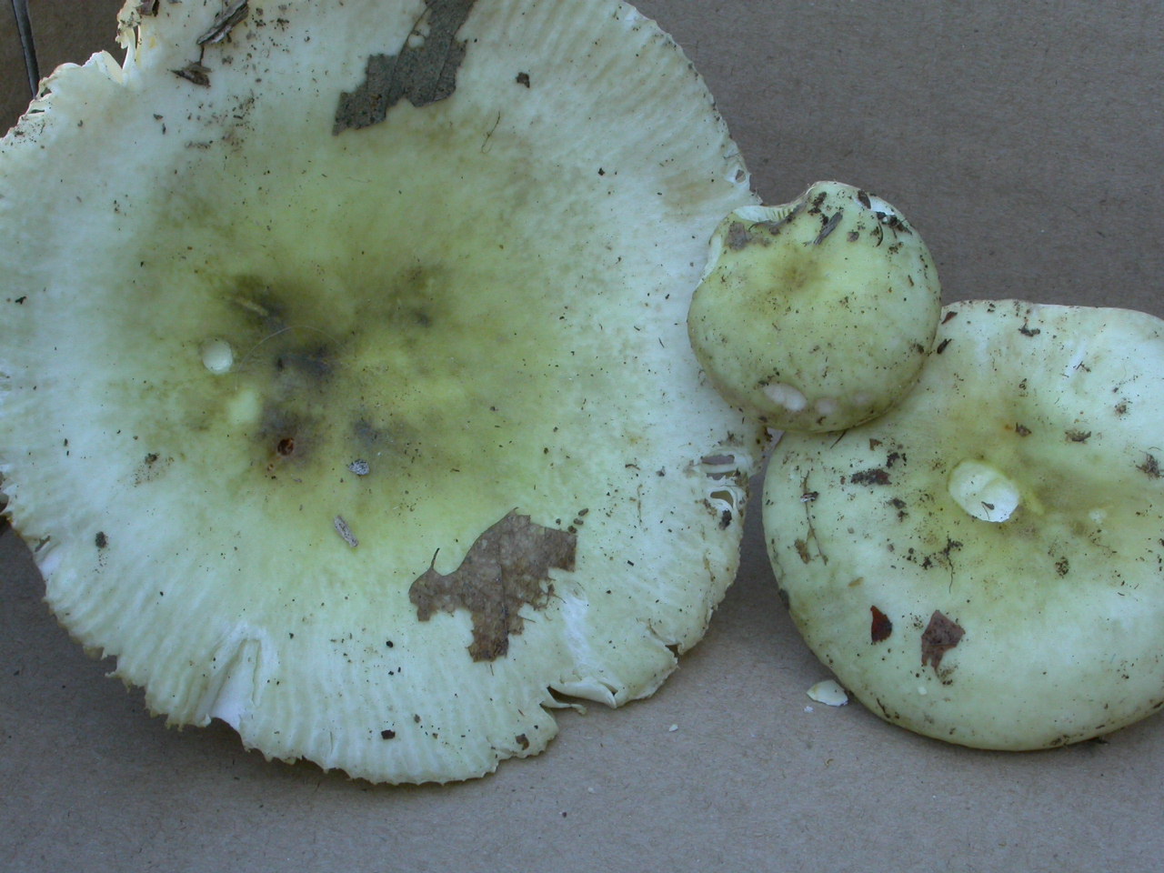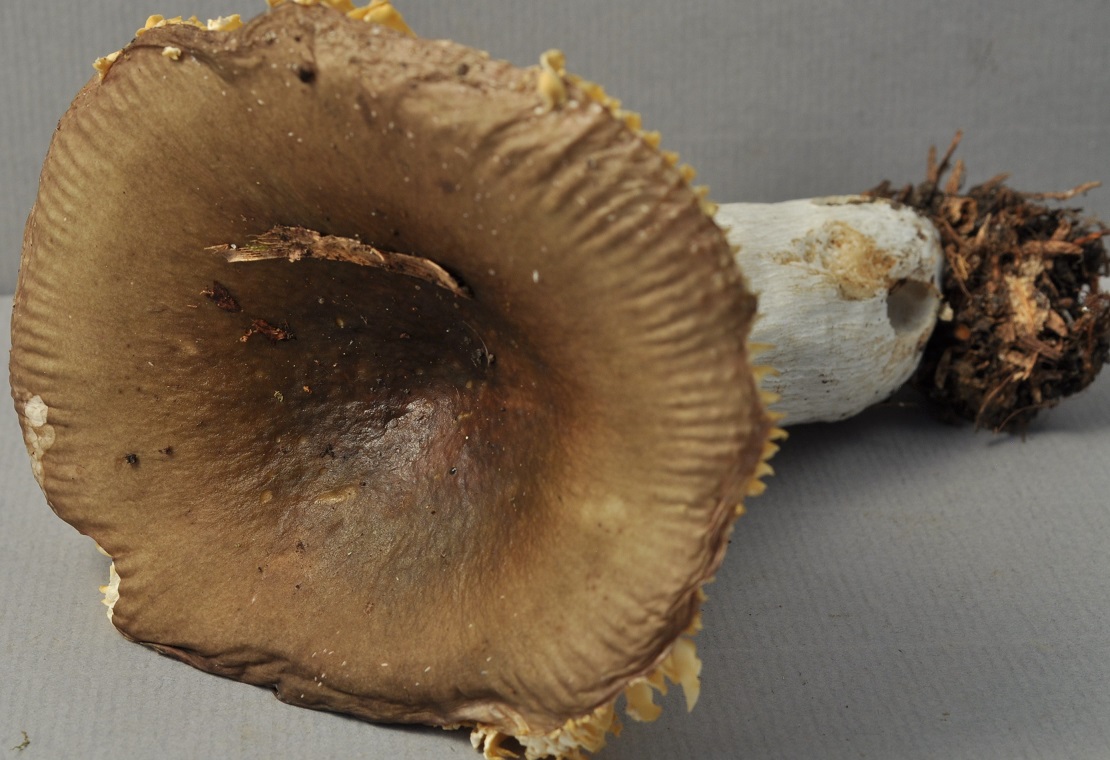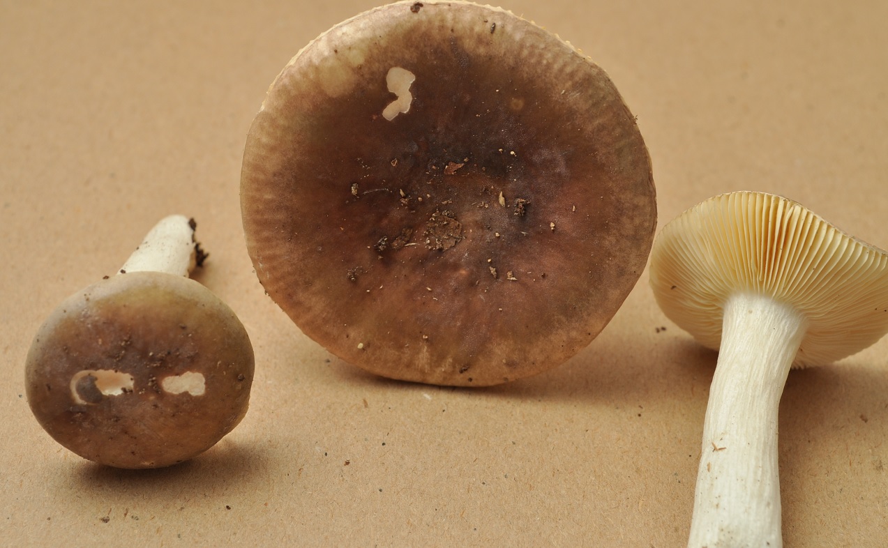 dessous, CD8-F11 100/101. Chapeau verdâtre-bleuâtre avec des plages ochracées. Lames émarginées, dentelées. Stipe pruineux en haut, restes de voile noirâtre, dessous, bas du pied bleuâtre-verdâtre.