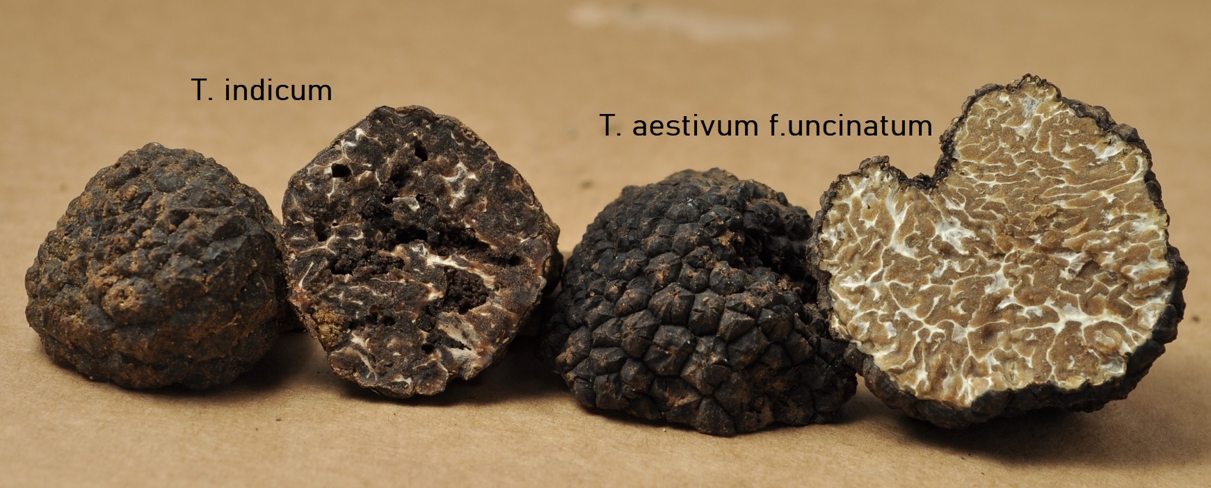 photo, Au marché achat de 2 truffes, " melanosporum sauvage" (18 ) et "de Bourgogne" (10 euros), odeur "trascurabile" ... mais belle micro. Tuber indicum (truffe chinoise) et Tuber aestivum var. uncinatum (var. automnale de la truffe de Bourgogne) sont les meilleurs hypothèses.