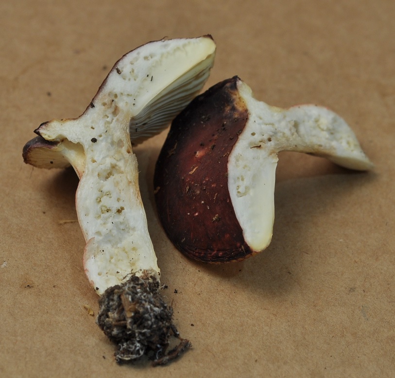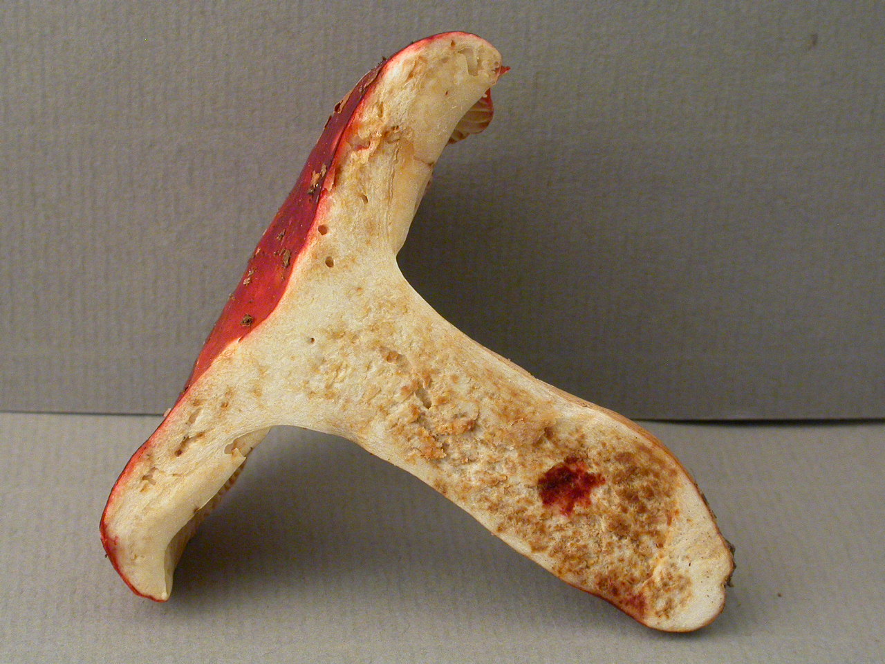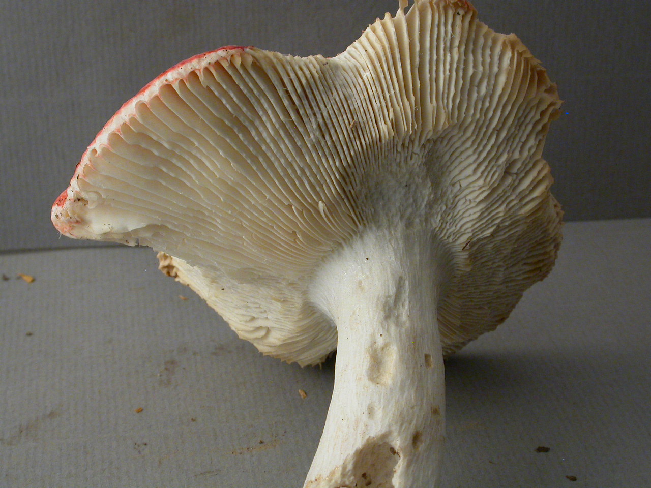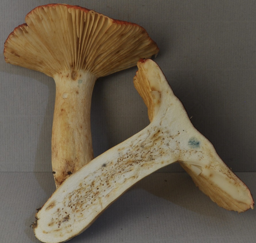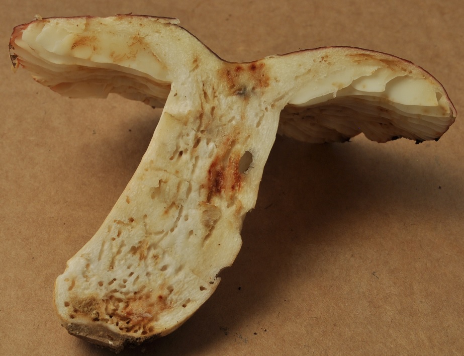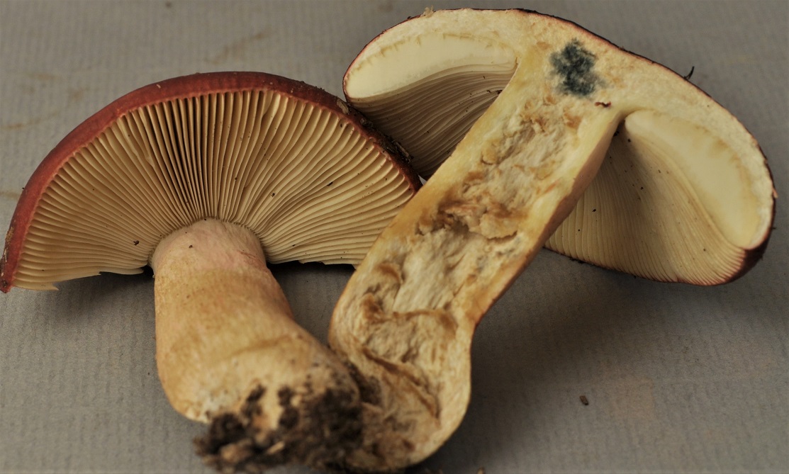 A voir dans la coupe les lames adnées ou émarginées, ligne de Trindel 2, arête rougeâtre à la marge, chair se colorant de brunâtre. Standard R.suberythropus..