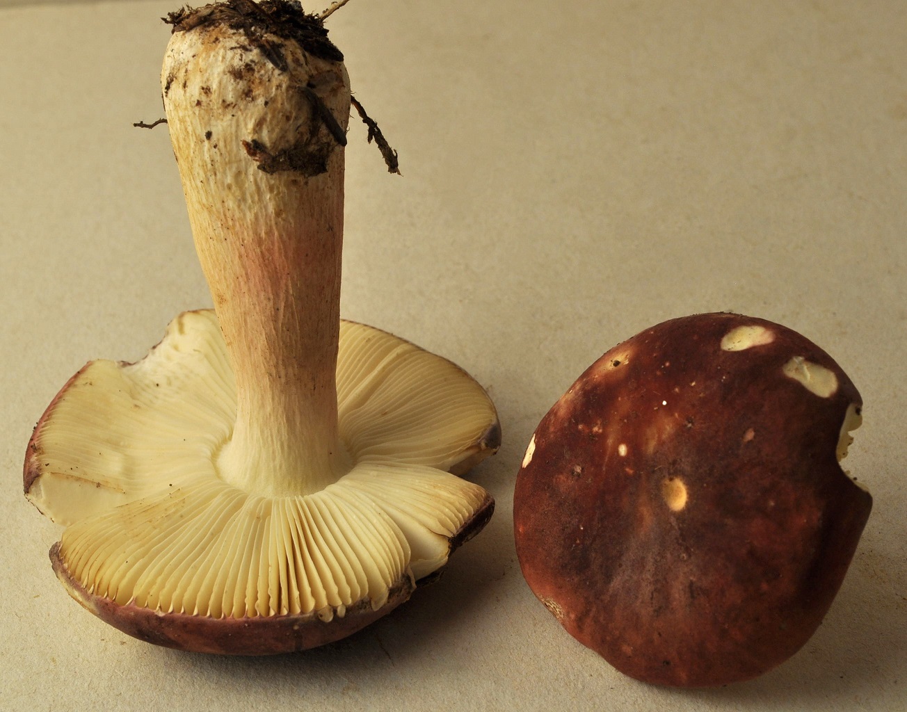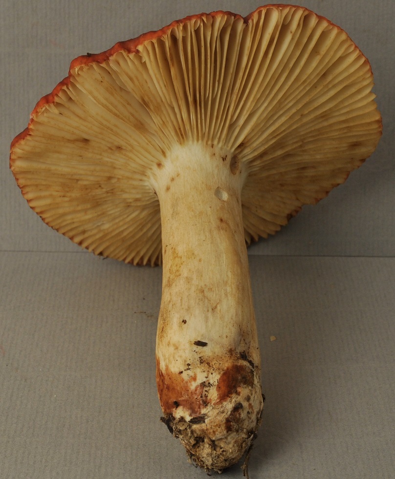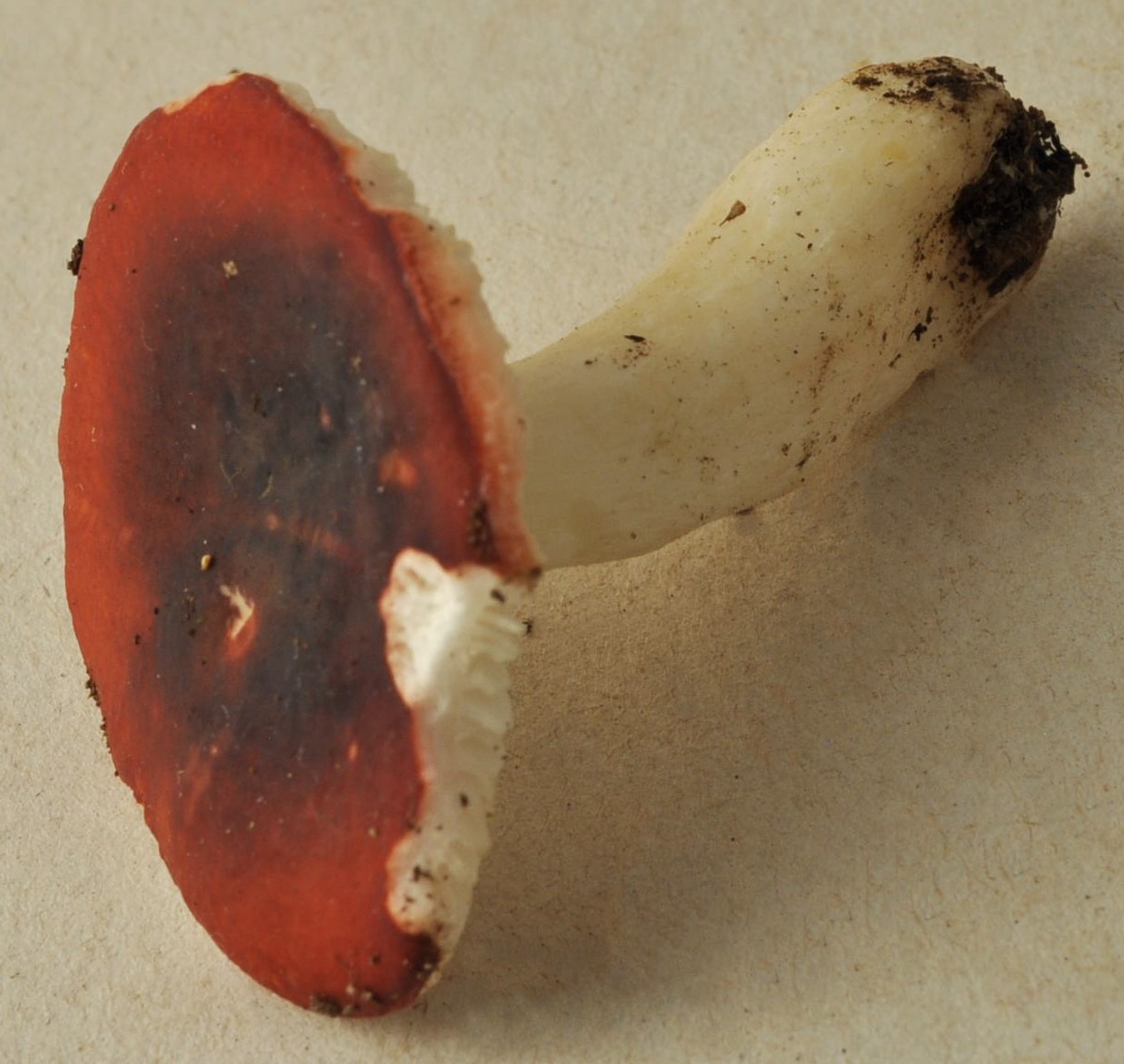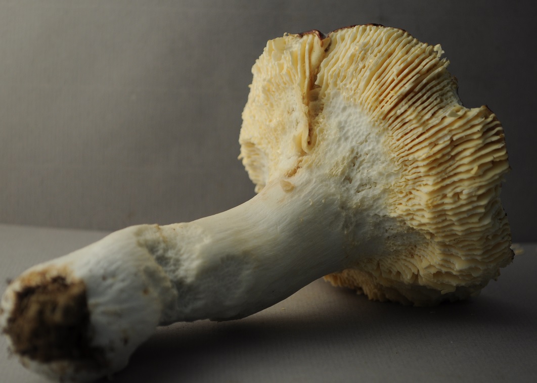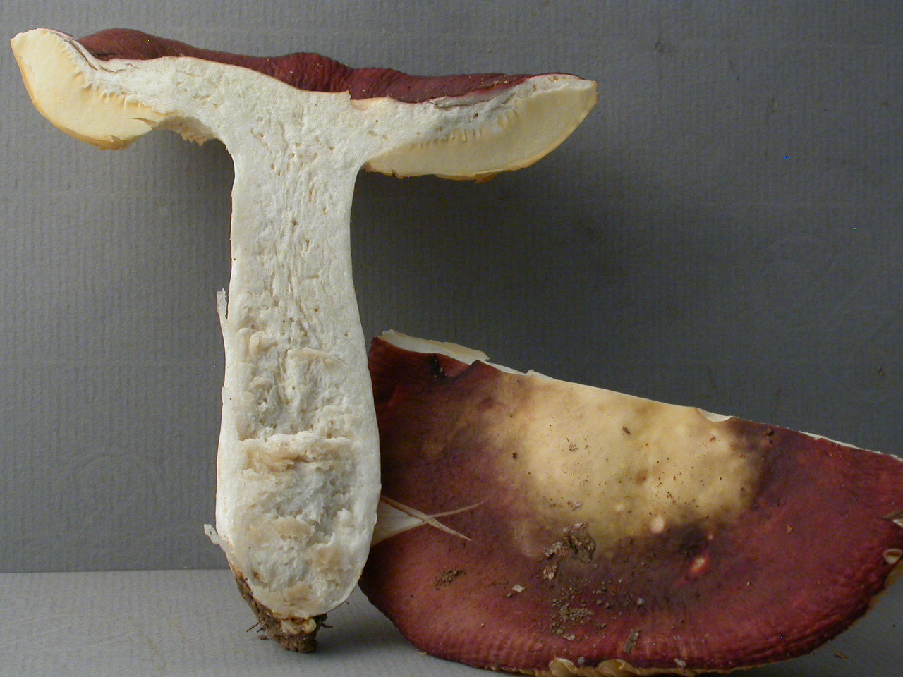 A voir dans la coupe les lames adnées ou émarginées, ligne de Trindel 2, arête rougeâtre à la marge, chair se colorant de brunâtre. Standard R.suberythropus..